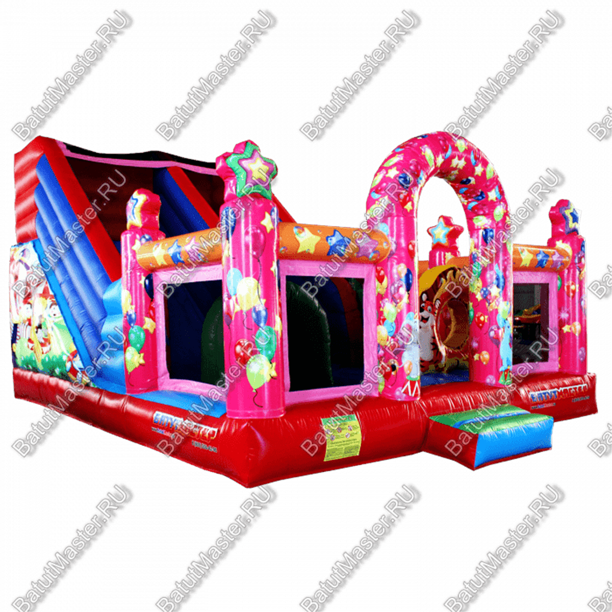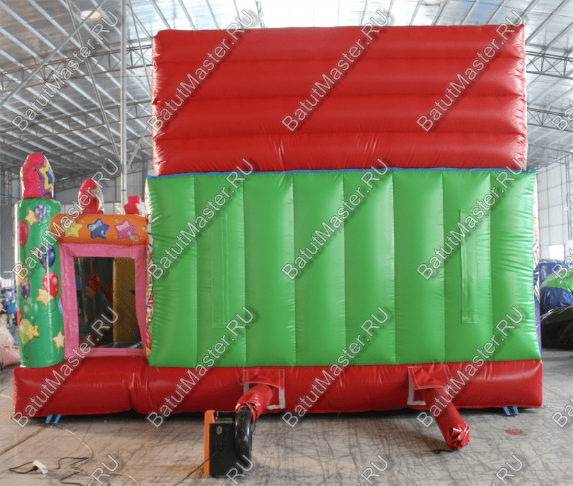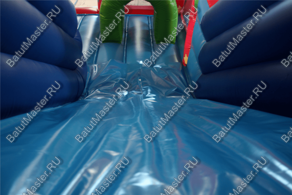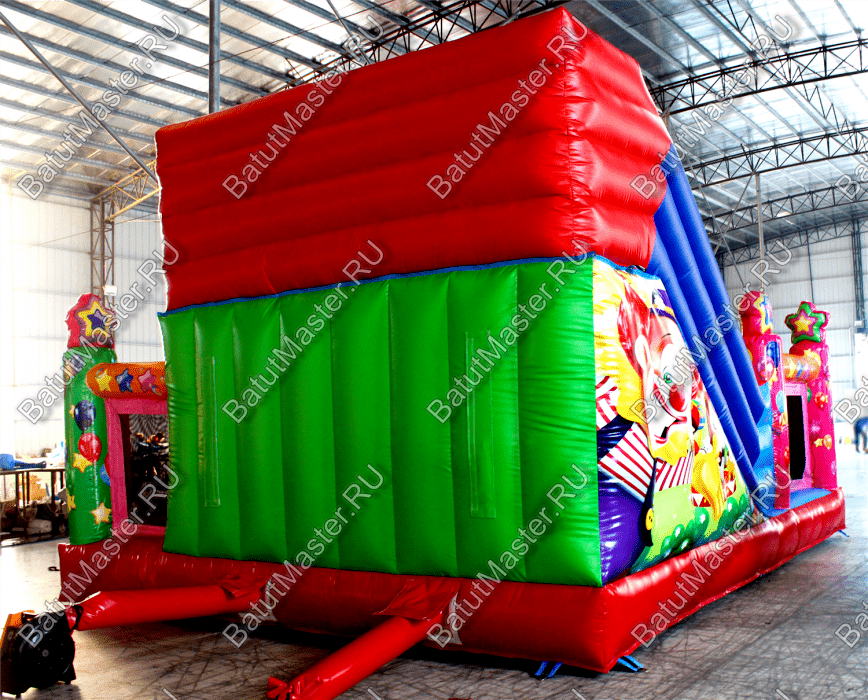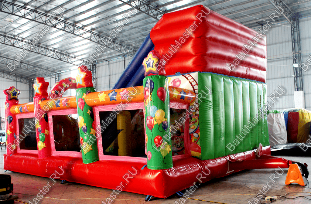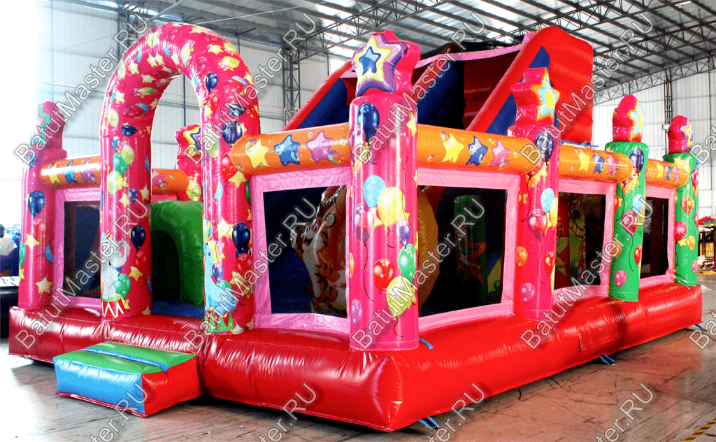 Внутри батута ребята встретят множество развлечений на любой вкус. Тут есть игровые фигуры и груши, с которыми можно весело играть. Одна из надувных фигур выполнена в виде тигра с горящим обручем, сквозь который можно пролезть. Также имеется и просторное место для активных игр и прыжков. Конечно, есть тут и горка с удобной боковой лесенкой.