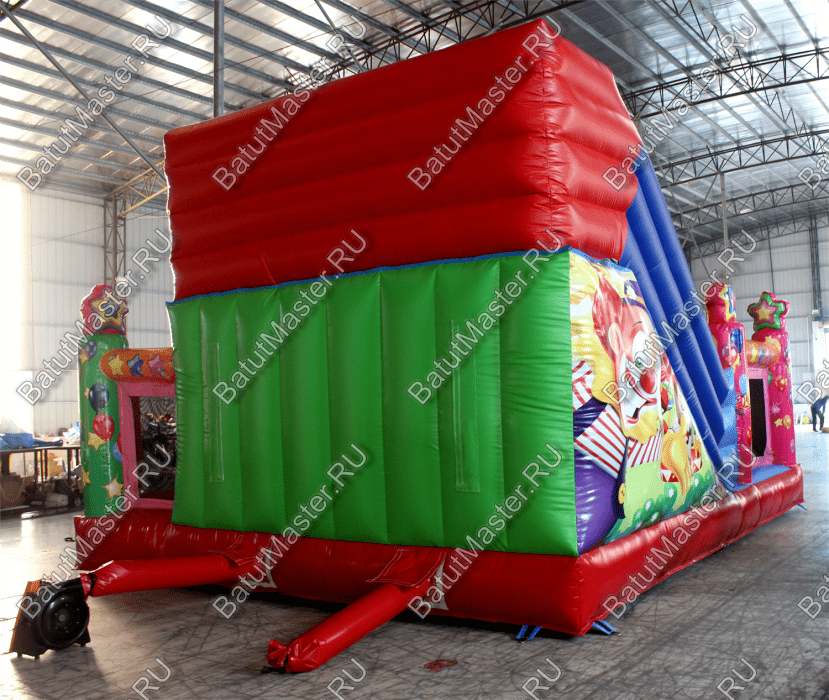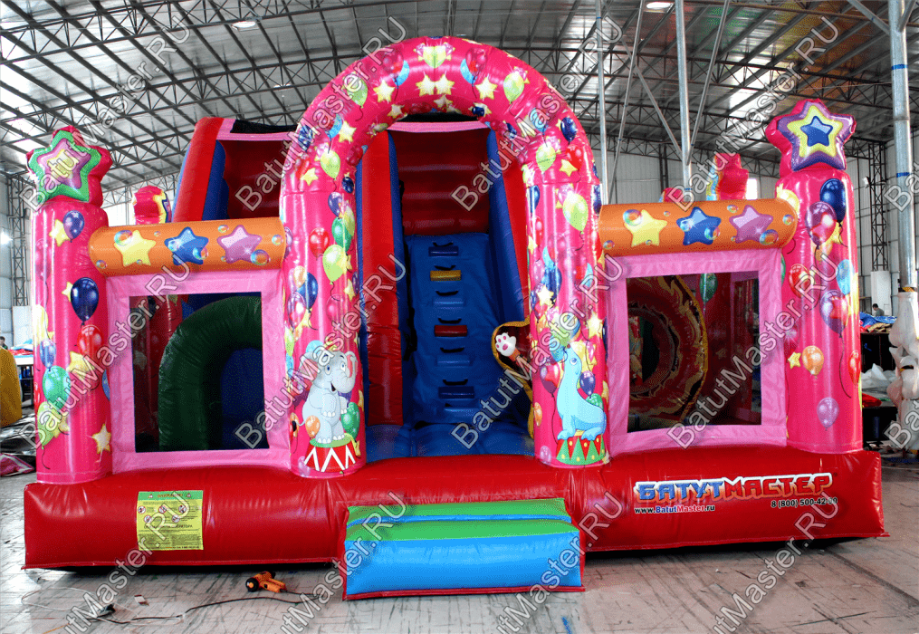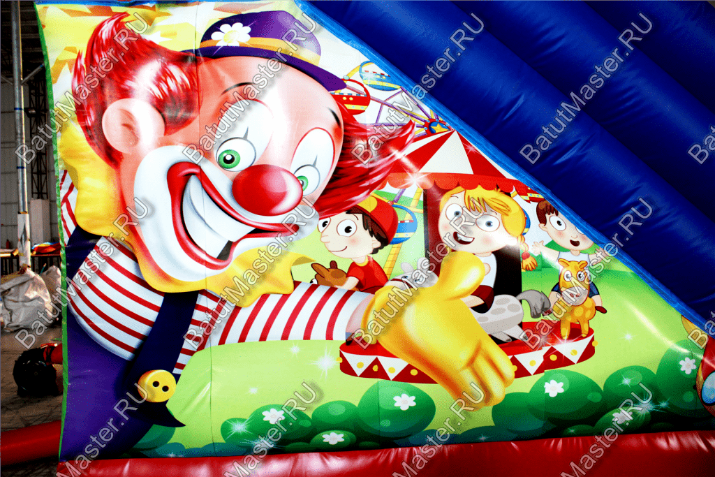 Коммерческий надувной батут «Цирк» точно способен привлечь внимание маленьких посетителей, и даже их родителей. Тут преобладают именно побуждающие активность цвета (красные, оранжевые и розовые), так как тематика батута - это всеми любимый цирк. Весь батут не только яркий, он весь украшен изображениями весёлых циркачей, клоунов и дрессированных животных.