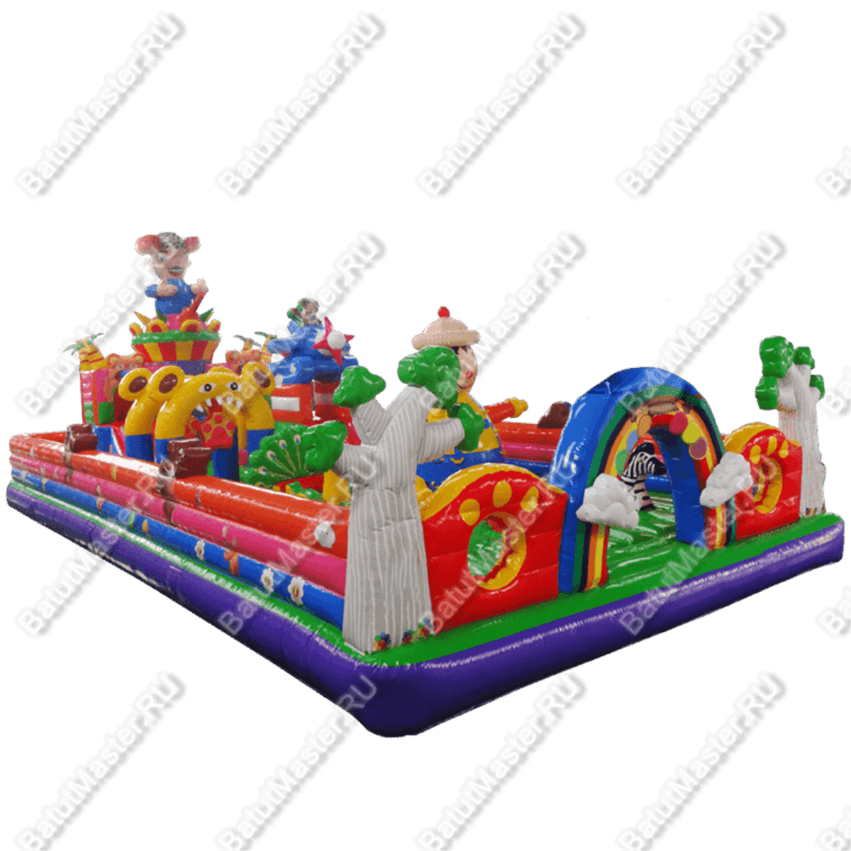 Многофункциональный батут содержит развлечения на любой вкус. Перед входом установлены фигурки цирковых зверей – зебры, тигра и пр. Далее следует надувной клоун, он установлен перед спуском с горы, чтобы ограничивать скорость съезжания.