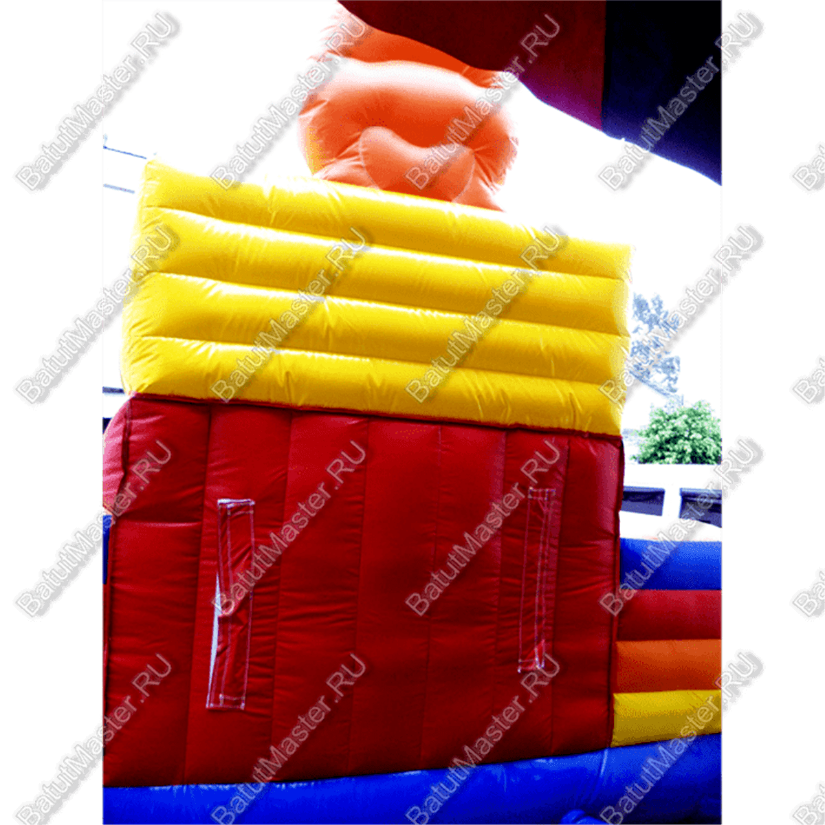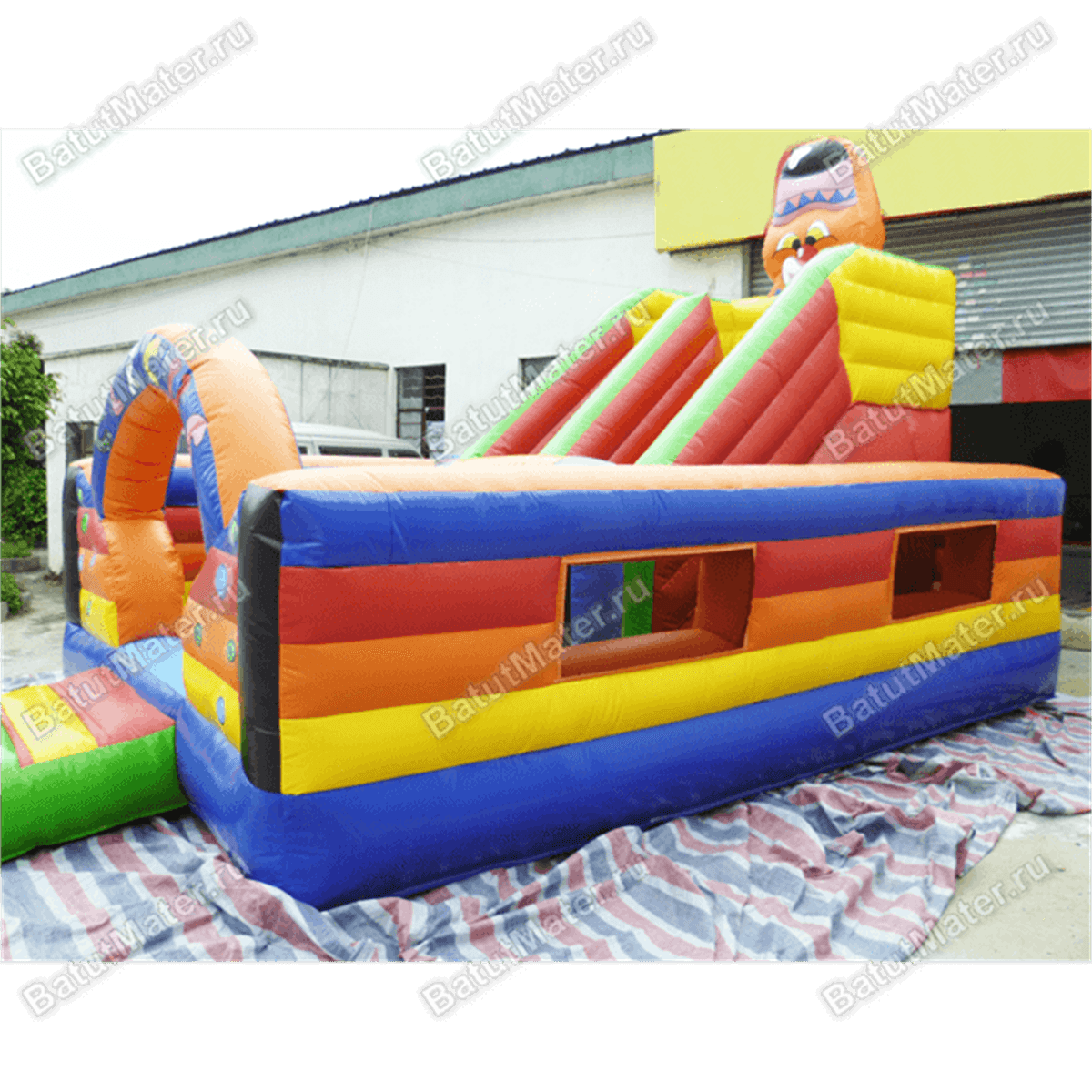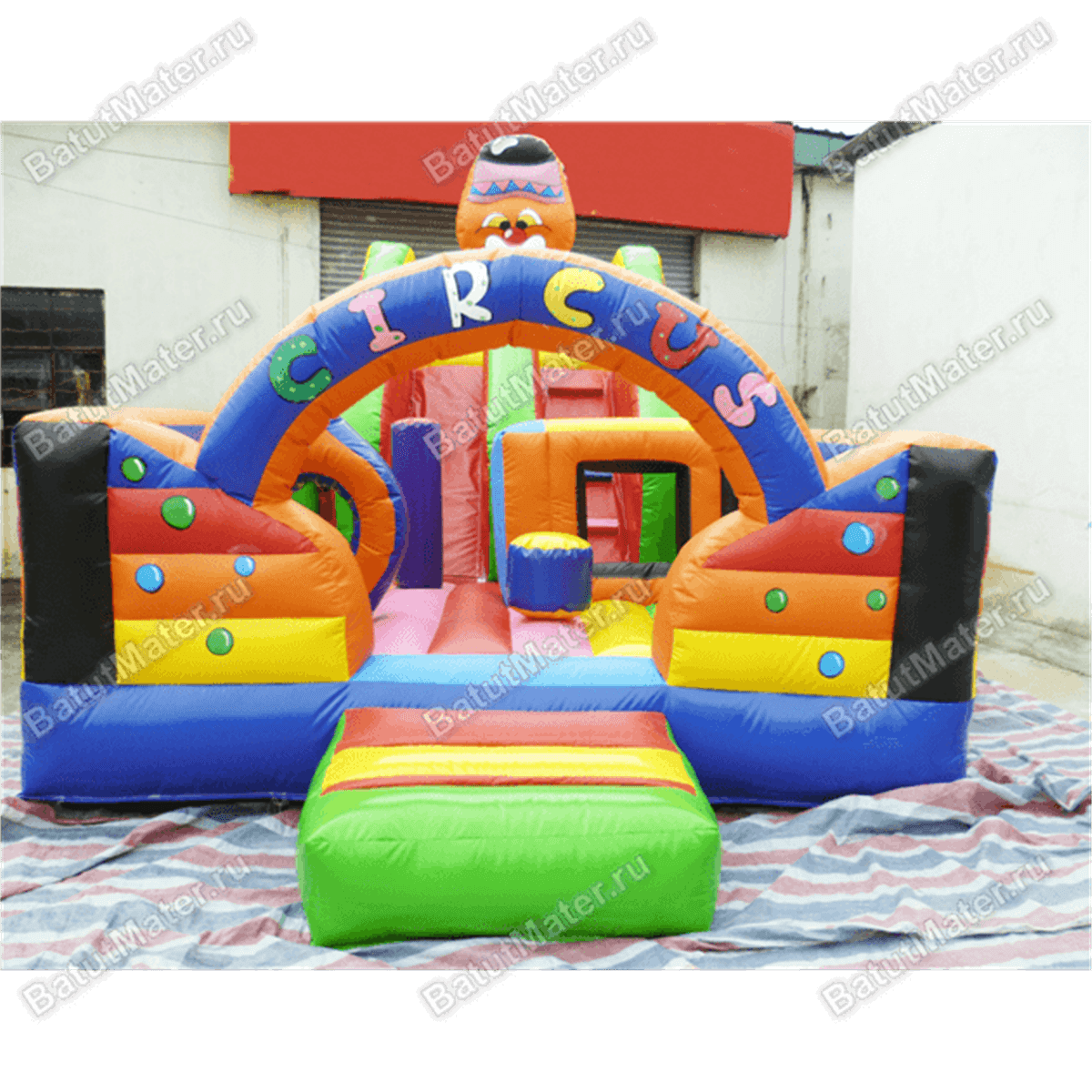 Красочный батут на своей самой верхней точке украшен огромной головой почти настоящего циркового медведя, только надувного. На задней части вмещается высокая горка. В целом, вся конструкция напоминает крепость, только в непривычной расцветке, созданной из самых ярких цирковых палитр.