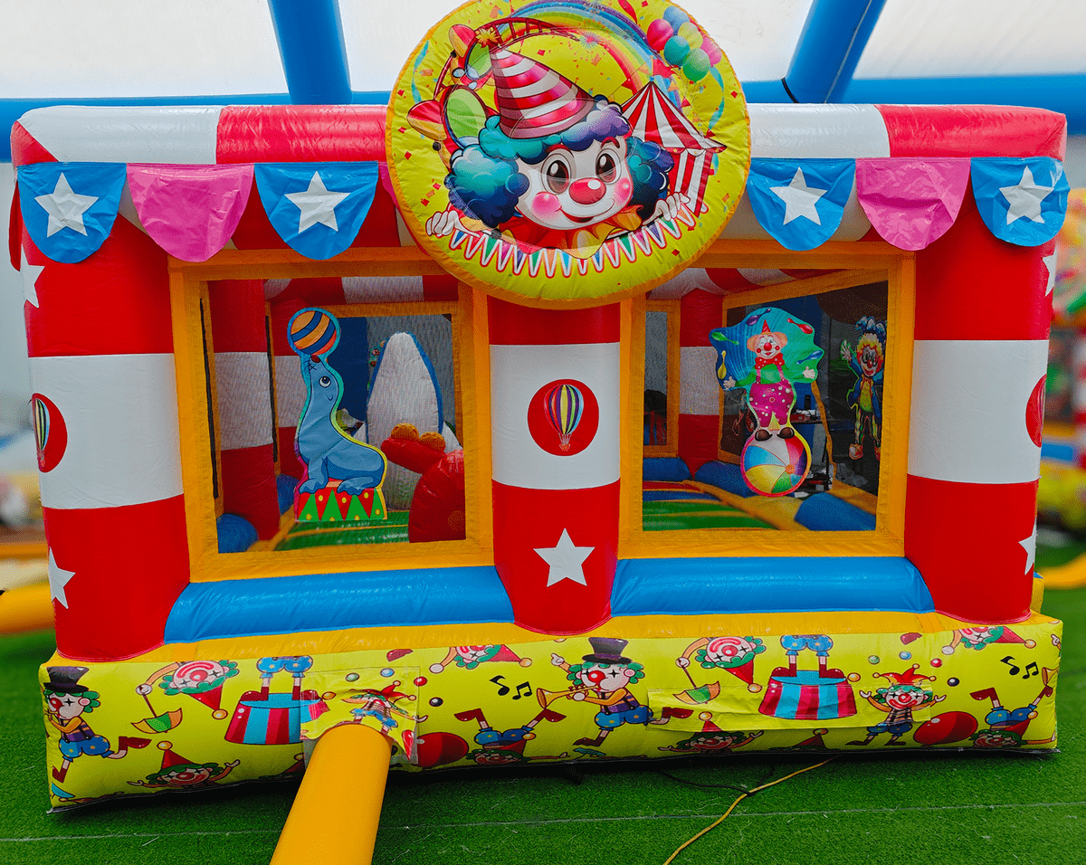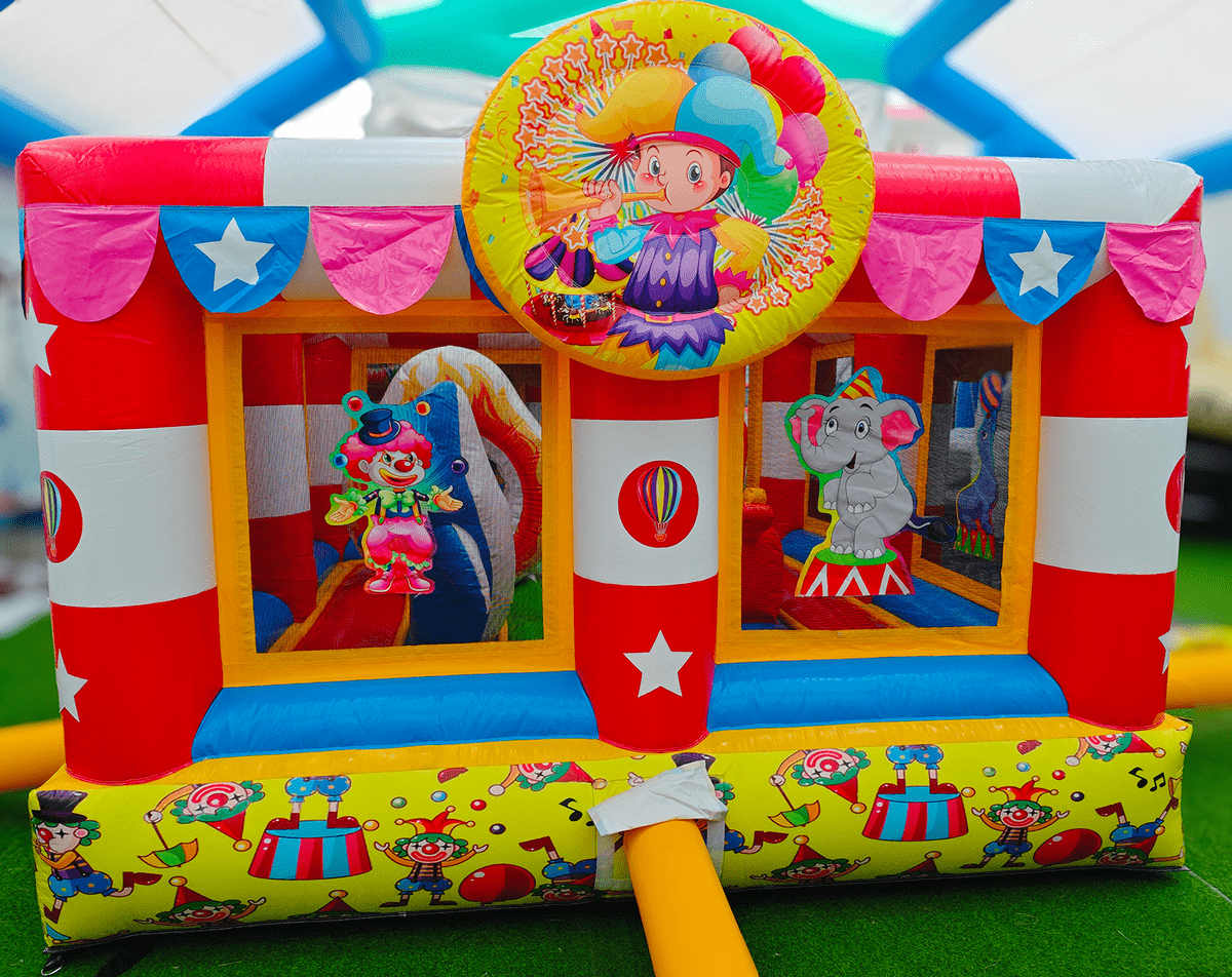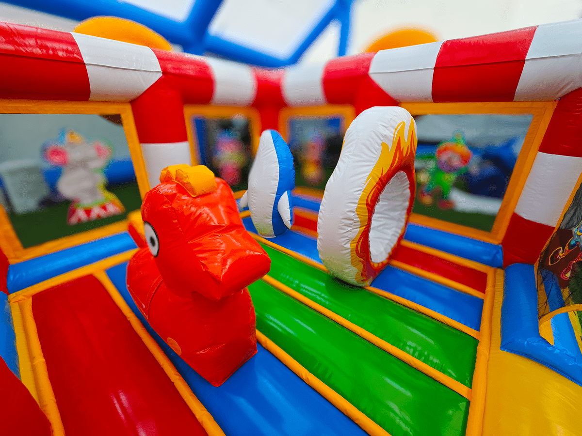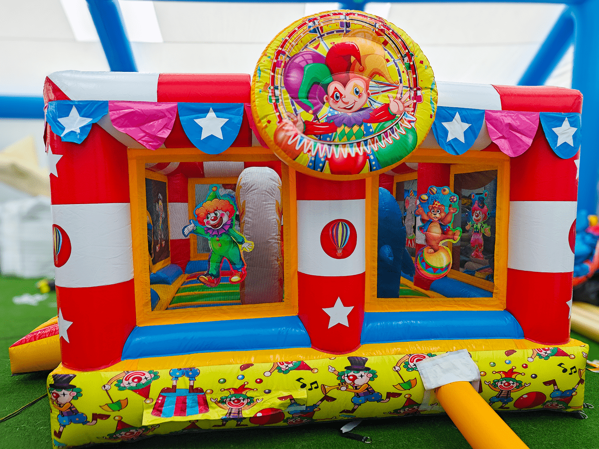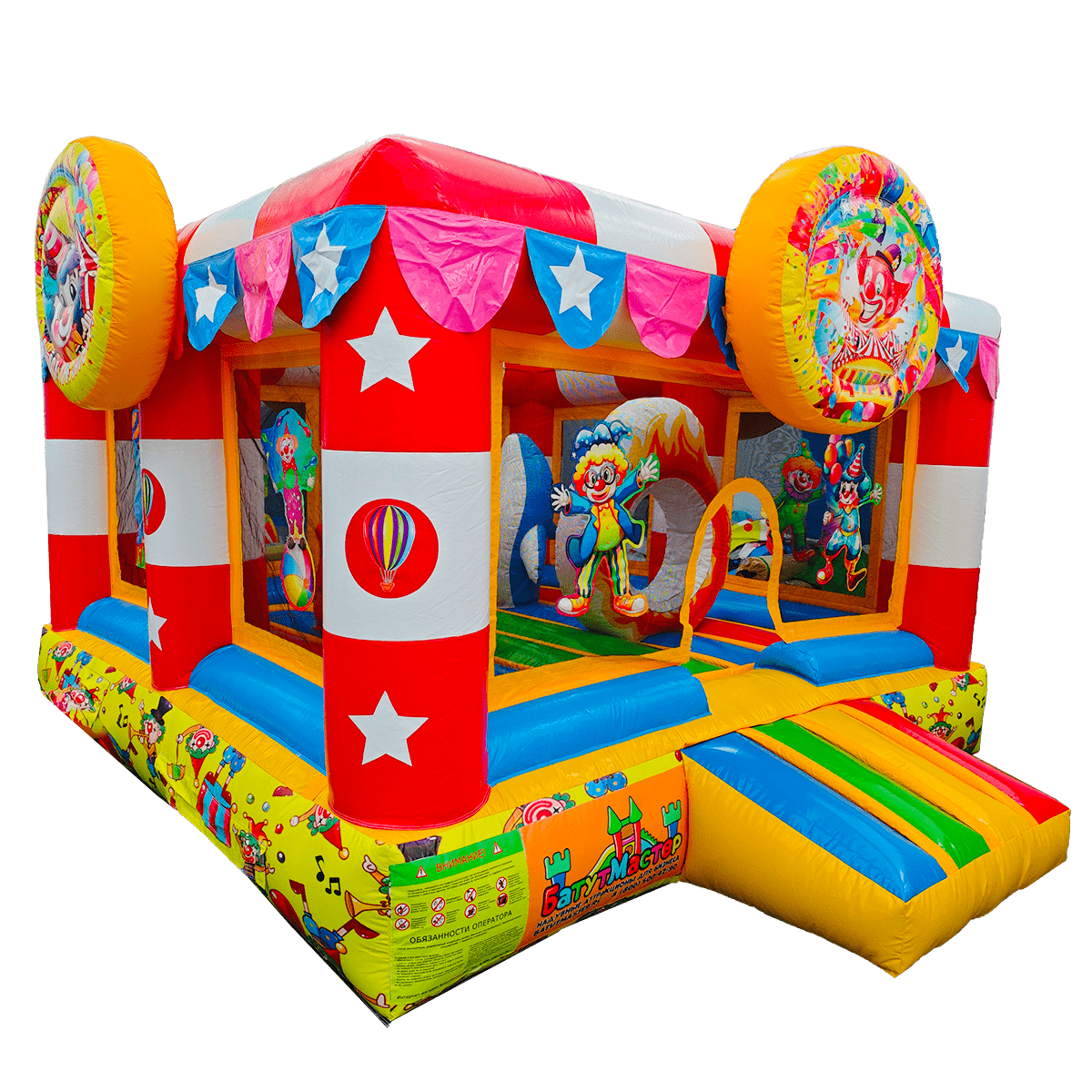 Батут «Цирковые трюки» — это миниатюрная копия циркового шоу, воплощённая в надувной игровой форме. Красочные полосы, баннеры с клоунами, воздушные шары, яркие декоративные элементы — всё здесь кричит: «Добро пожаловать в цирк!» Такая стилистика не только привлекает внимание детей, но и помогает родителям быстрее сориентироваться, выбирая развлечение для своего ребёнка.