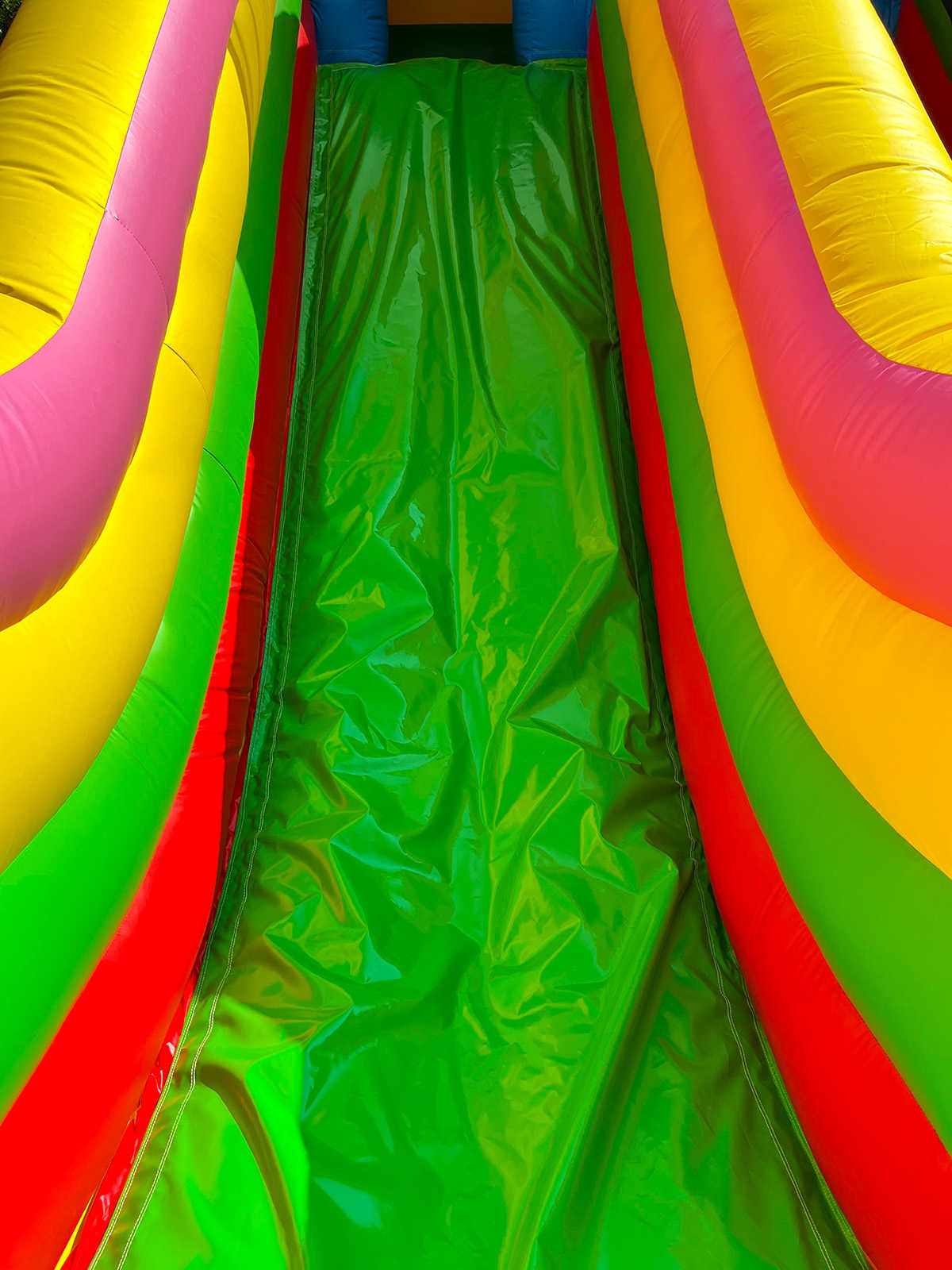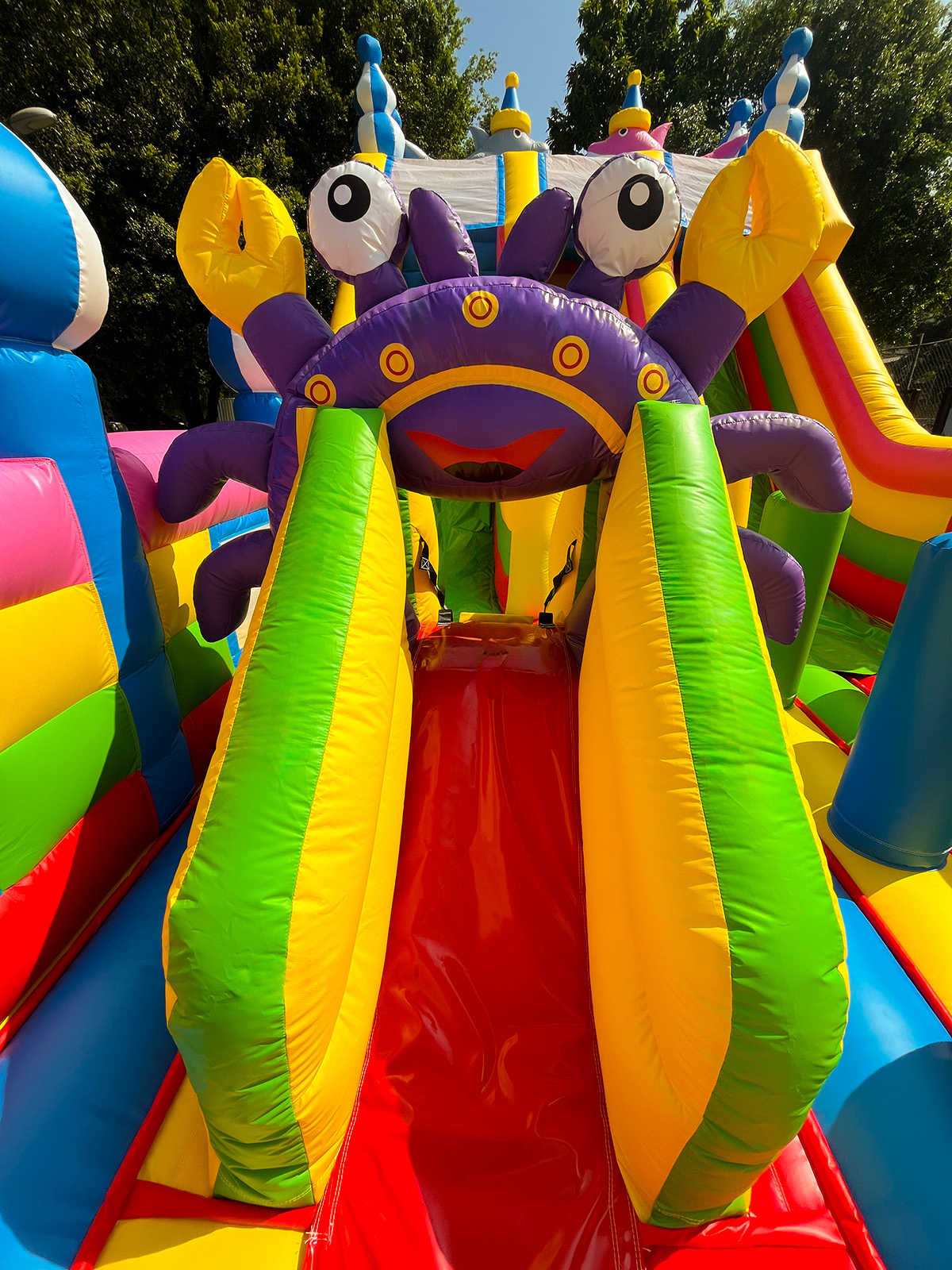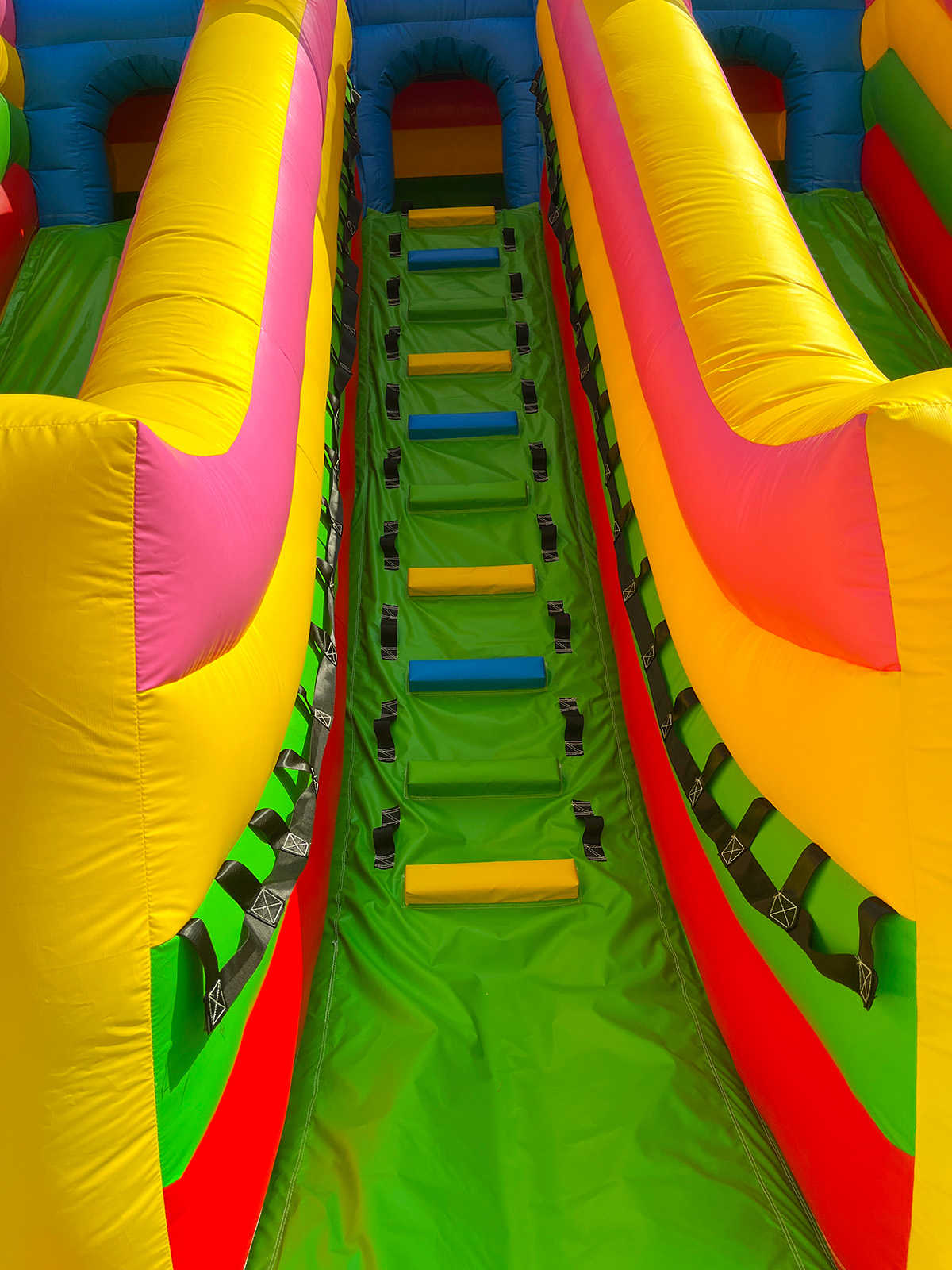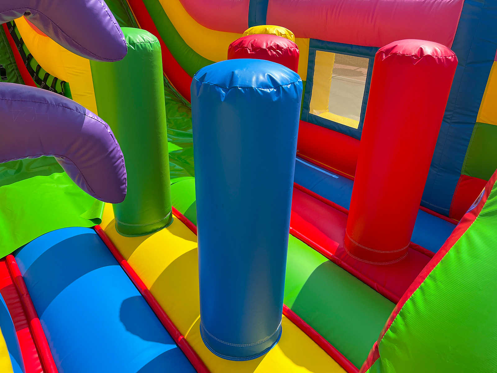 Габариты 10x5x5 метров обеспечивают достаточное пространство для одновременной игры нескольких групп. Внутри предусмотрены надувные игровые элементы: столбики, колечко, горки. Все элементы конструкции интегрированы в единое игровое пространство, что позволяет детям перемещаться между зонами, не покидая батута, а значит — увеличивает вовлечённость и время пребывания внутри.