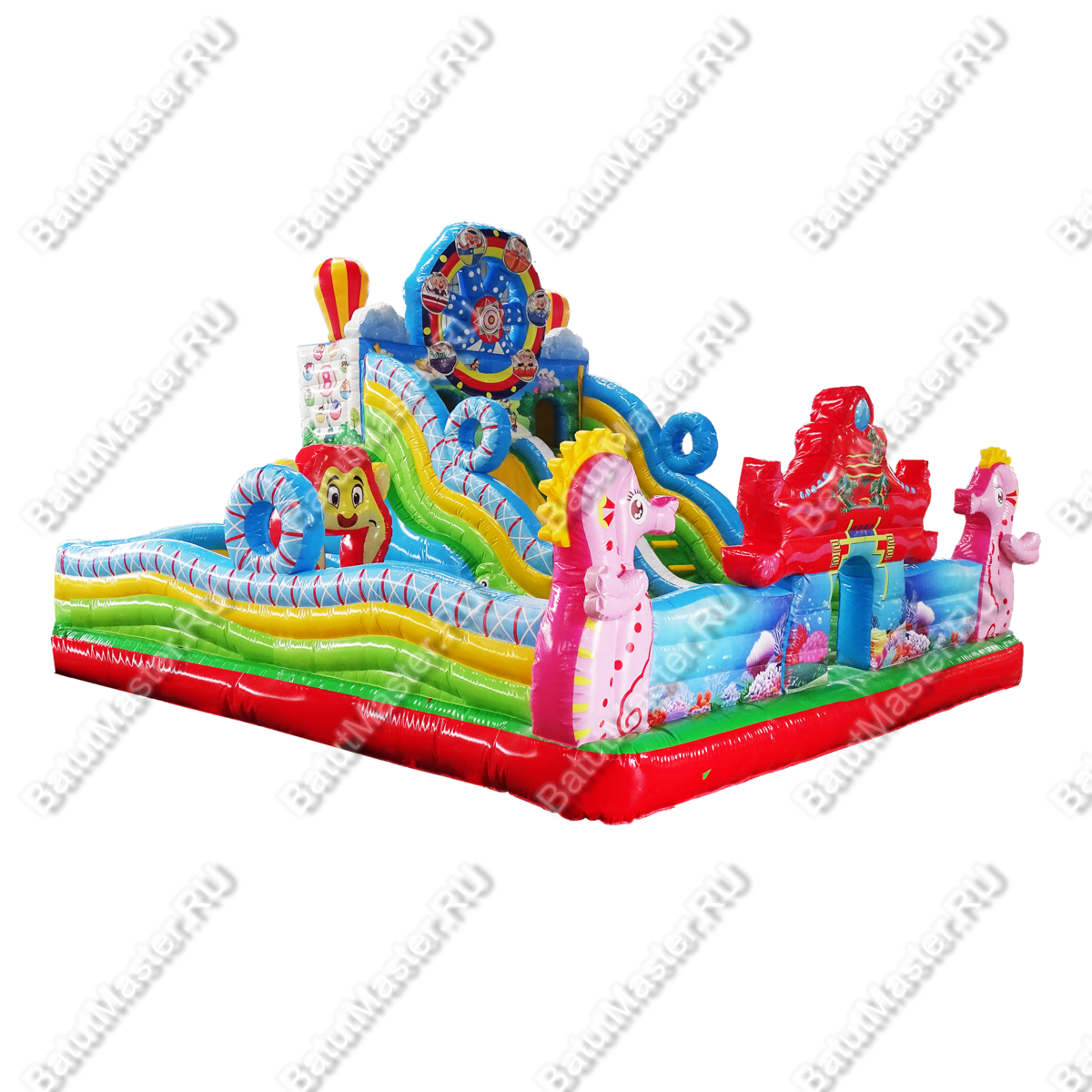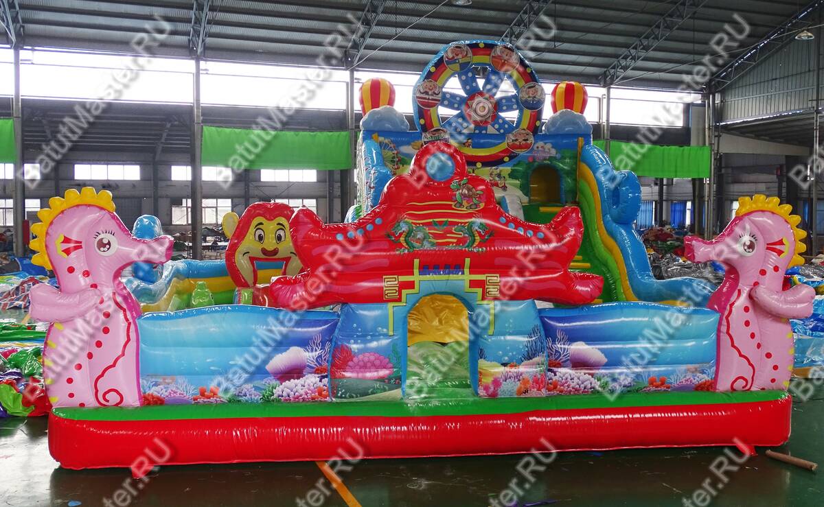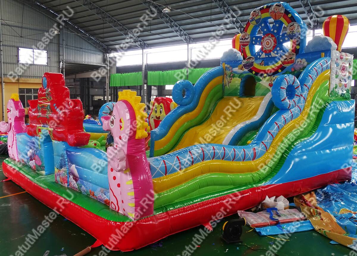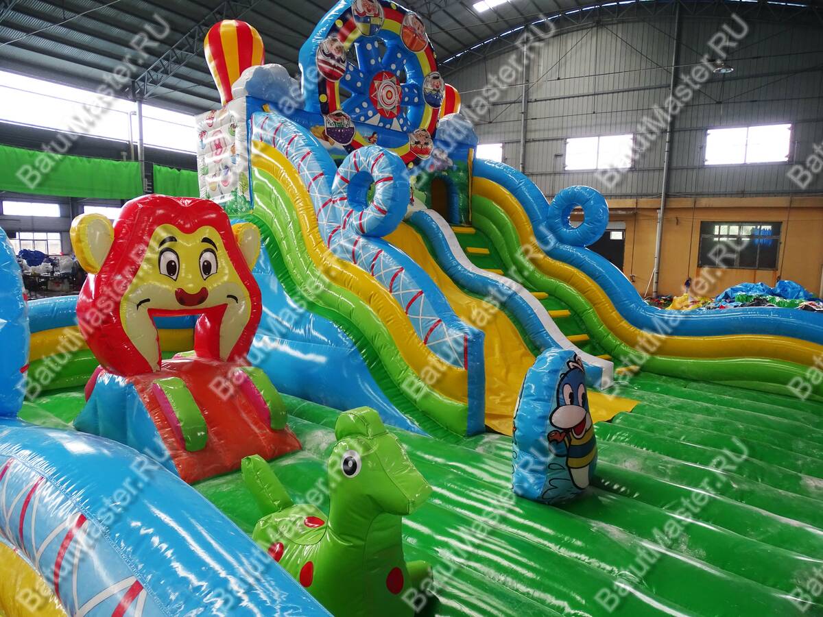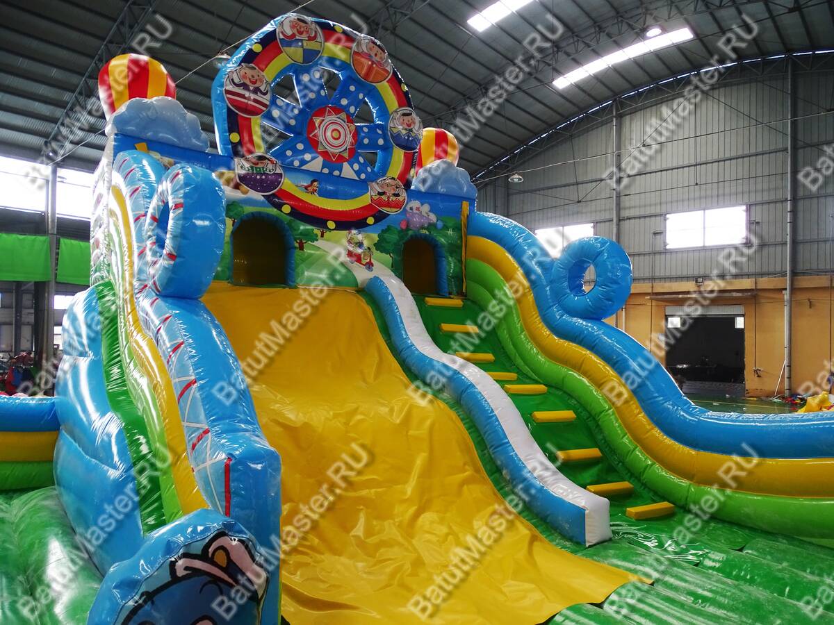 Главным атрибутом, конечно же, является надувная горка, с которой можно с ветерком прокатиться. Горка имеет даже некоторое оформление: над ней возвышается декоративное колесо обозрения, что добавляет оригинальности этому надувному батуту.