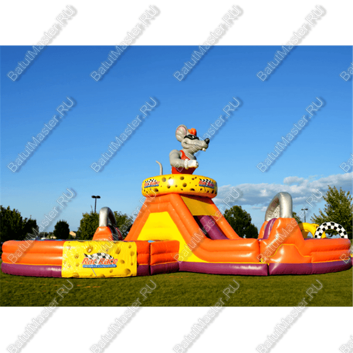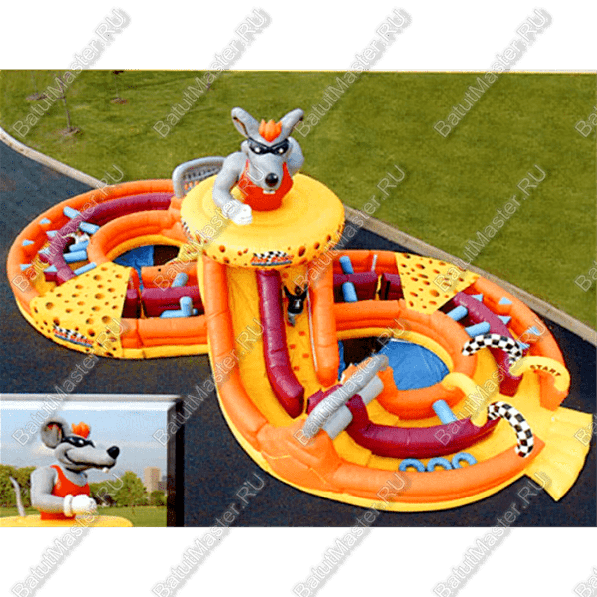 Интересный батут с красными стенками и желтой поверхностью напоминает забег для грызунов, любителей полакомиться кусочком сыра. Чтобы добраться до любимой еды, придется преодолеть долгий путь, но потом вас ждет приятный спуск. Арки вдоль лабиринта в шахматном окрасе еще раз говорят о том, что эта полоса препятствий. Такой «вкусный» аттракцион с лабиринтом по центру обязательно приворожит внимание ребят. В путь за сыром сможет отправиться сразу целая группа «добытчиков» мышиной еды. Вместе с приятной игрой владелец получит хорошую рентабельность от вложения.
