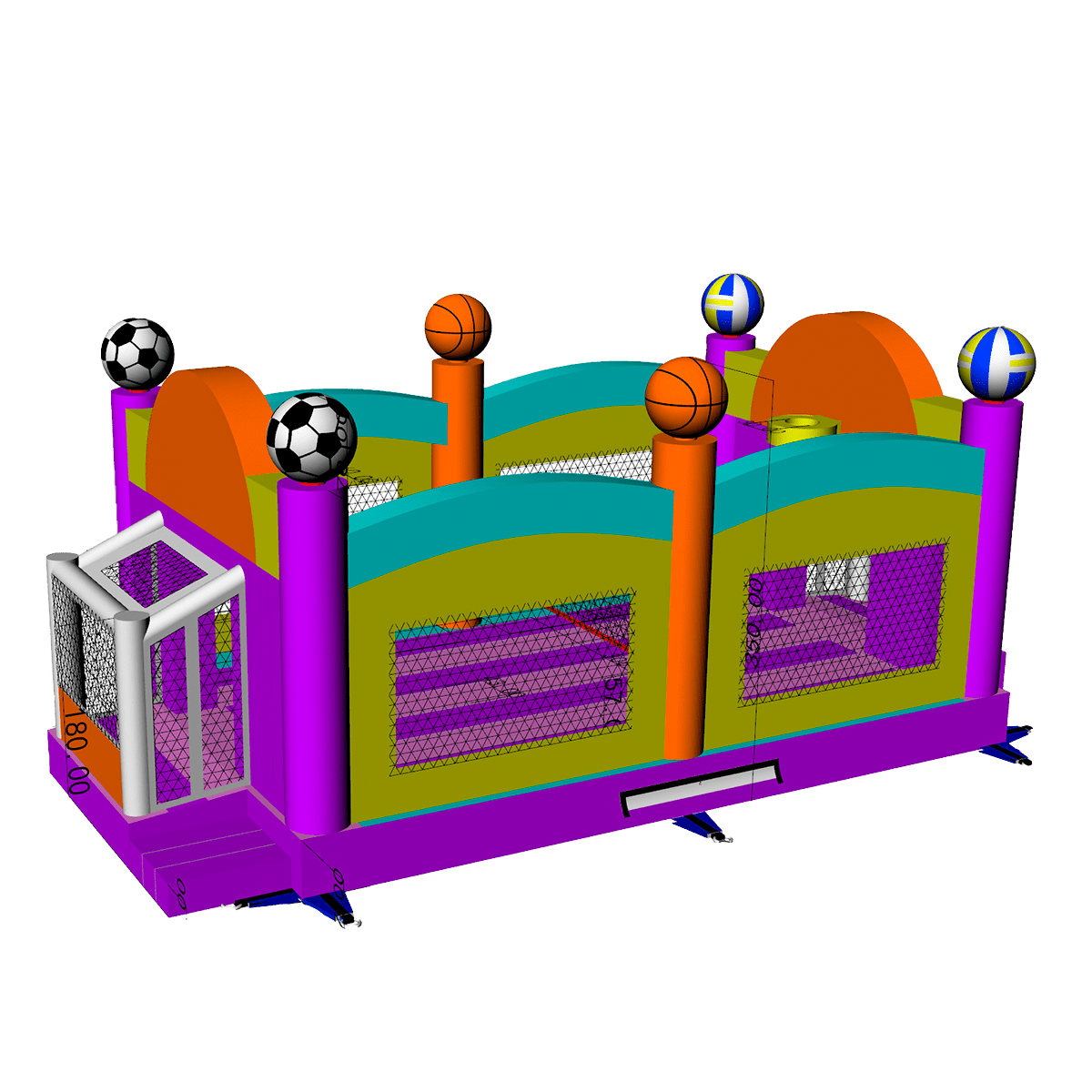 Ребятам непременно понравится данное исполнение, ведь здесь не только можно играть с мячом, в такой локации можно состязаться в «Твистер», играть в футбол, волейбол и т.д. Яркая и красочная арена сразу привлечет внимание и станет любимым местом времяпровождения юных непосед. Здесь есть разделение из сетки, ворота, кольцо сверху по двум сторонам.