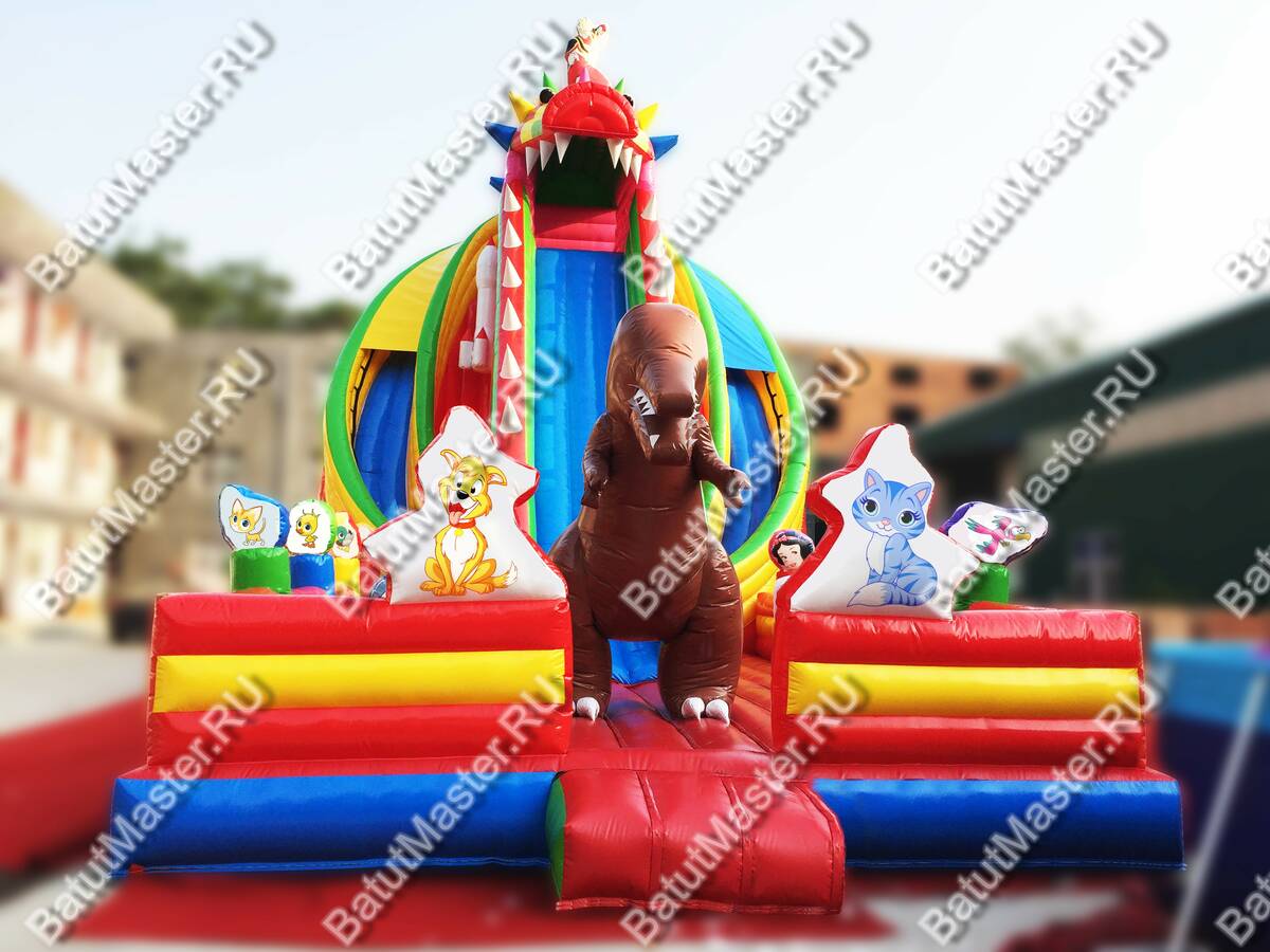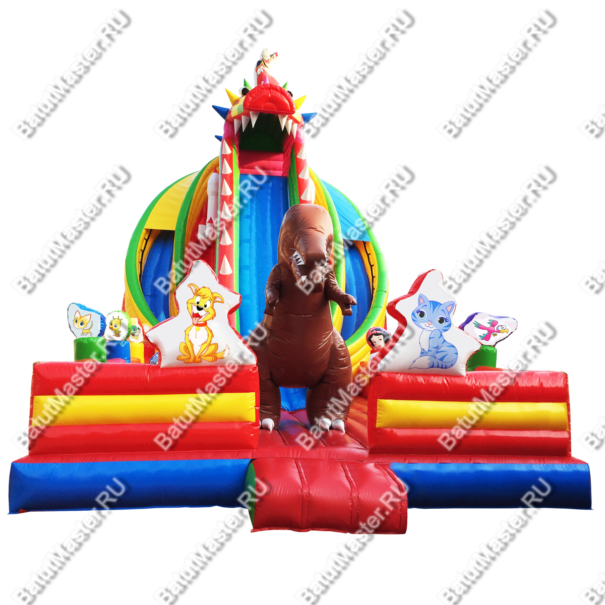 Помимо этого, дети могут попрыгать на самом аттракционе, а также прокатиться с большой горки, что выходит прямо из большой зубастой пасти дракона. Забраться на горку можно по подъёмам, расположенным по обе стороны.