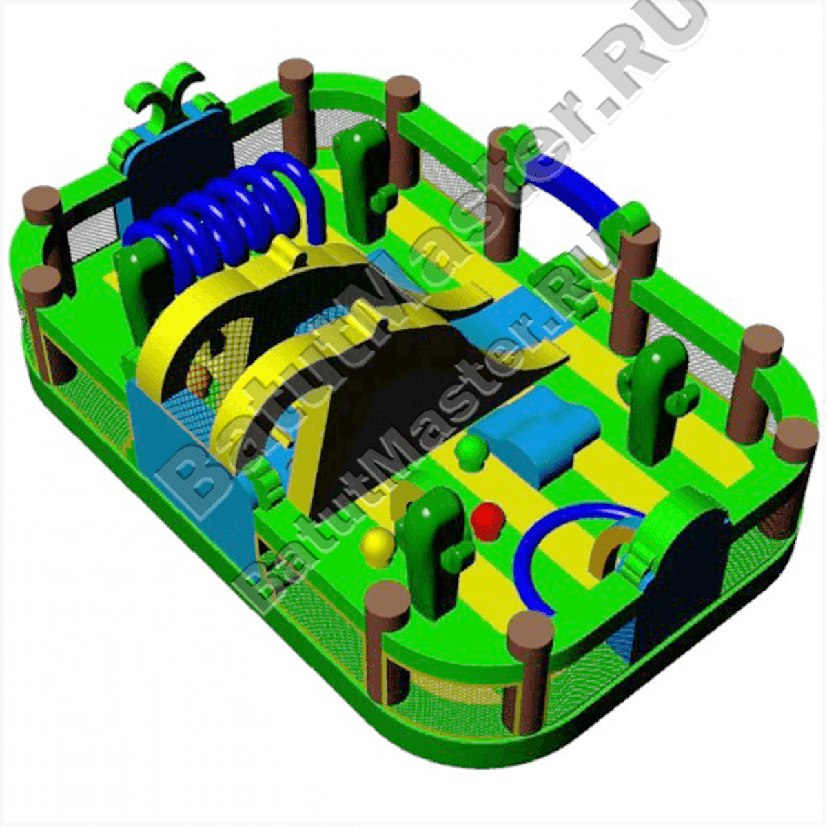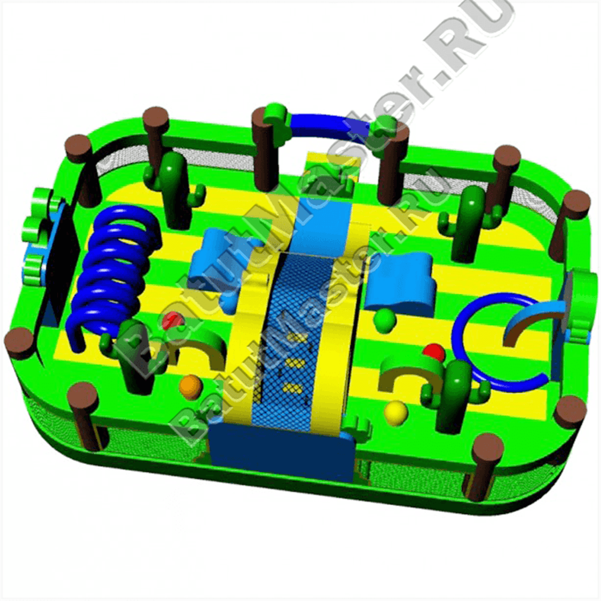 В одной половине игрового комплекса находится своеобразный водопад с перегородками для лазания. Другая половина батута предназначена для игровых фигур - необычного спирального лабиринта-тоннеля, высоких столбов в виде кактусов и спортивных снарядов для ползания.