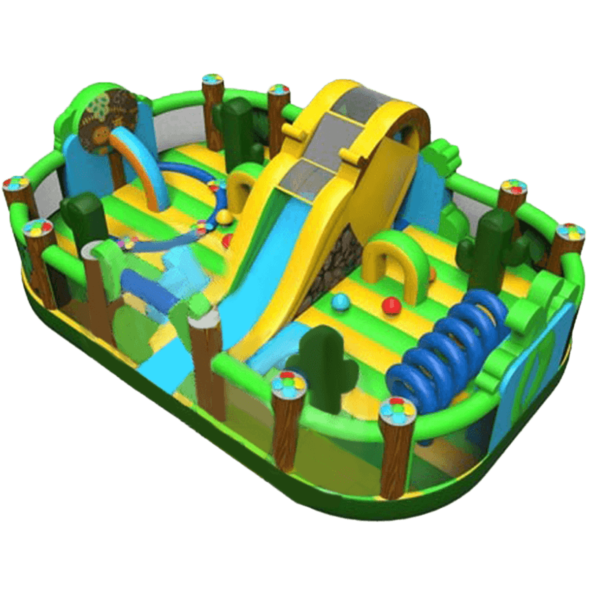 Коммерческий парк аттракционов «Водопад в джунглях» - это настоящий тропический рай для малышей. Игровой парк визуально разделен на две равных части. Центральную часть площади занимает высокая горка, вход в нее расположен сбоку, а спуск простирается к выходу в батут.