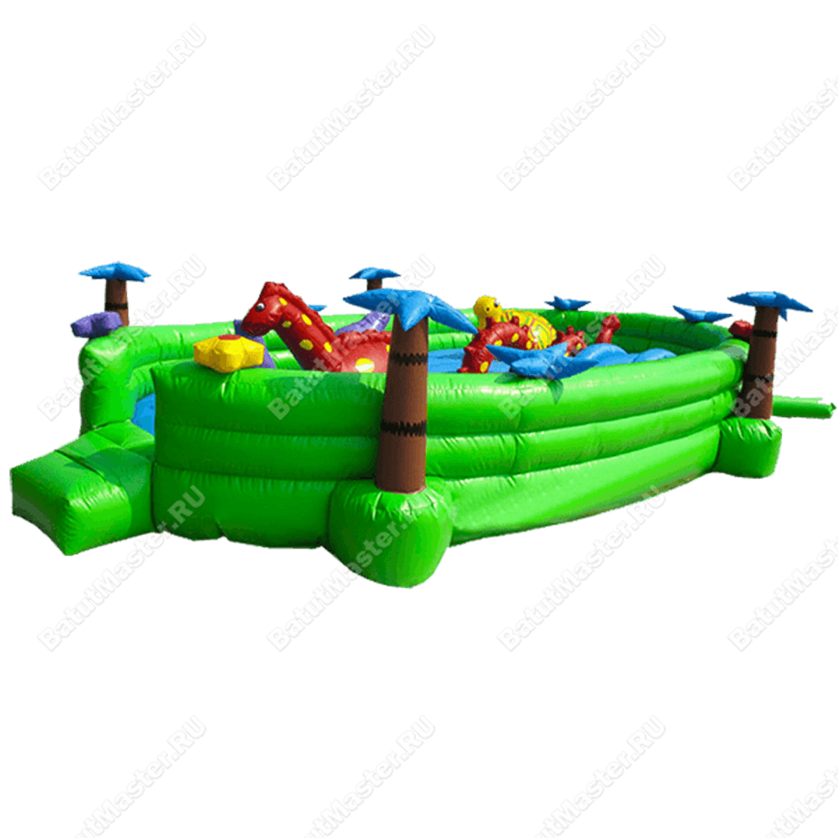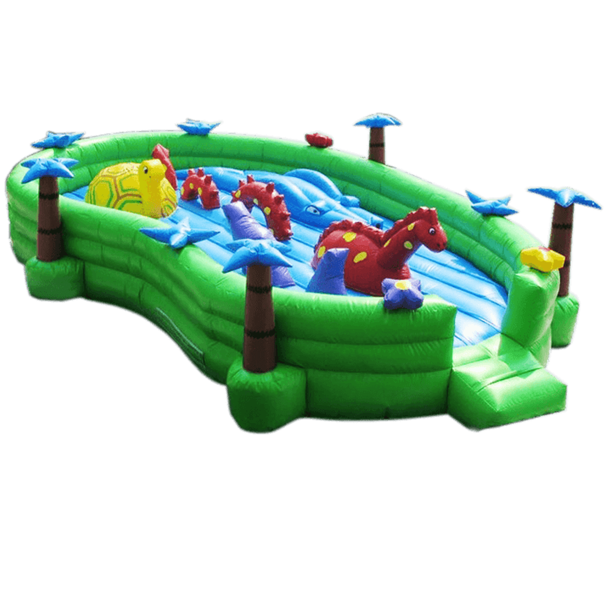 Батут открытого типа с множеством замечательных мягких зверей – гарантировано безопасный отдых для детей самого раннего возраста. Все, что требуется от малыша, это прыгать или бегать по поверхности. Простота дизайна и конструкции позволяет даже самым заботливым родителям доверить свою кроху этой площадке. Сама зеленая поверхность напоминает водоем, на котором собралась целая группа зверей, вокруг площадку защищает надежный зеленый надувной барьер в виде травки.