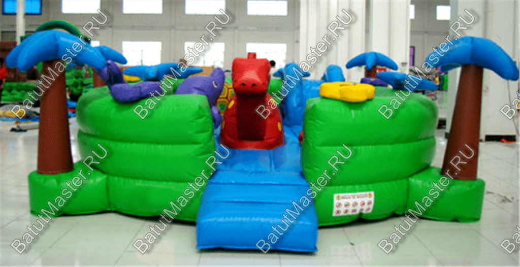 По периметру площадки разместились яркие пальмы, среди животных есть черепаха, жираф, крокодилы. Вход оборудован мягкой зеленой подушкой, на которой удобно разуваться.