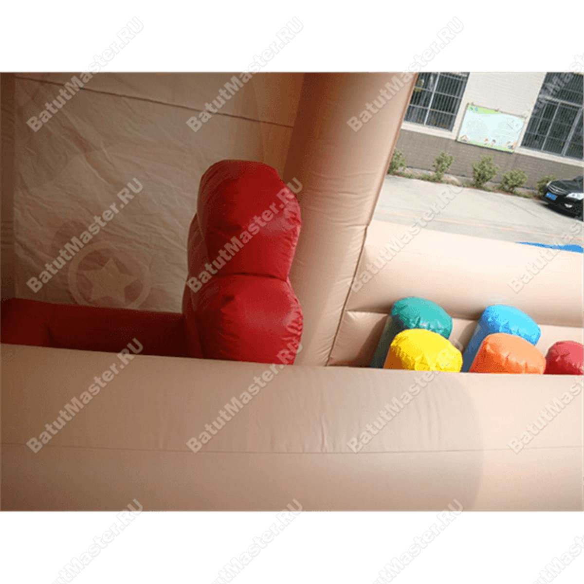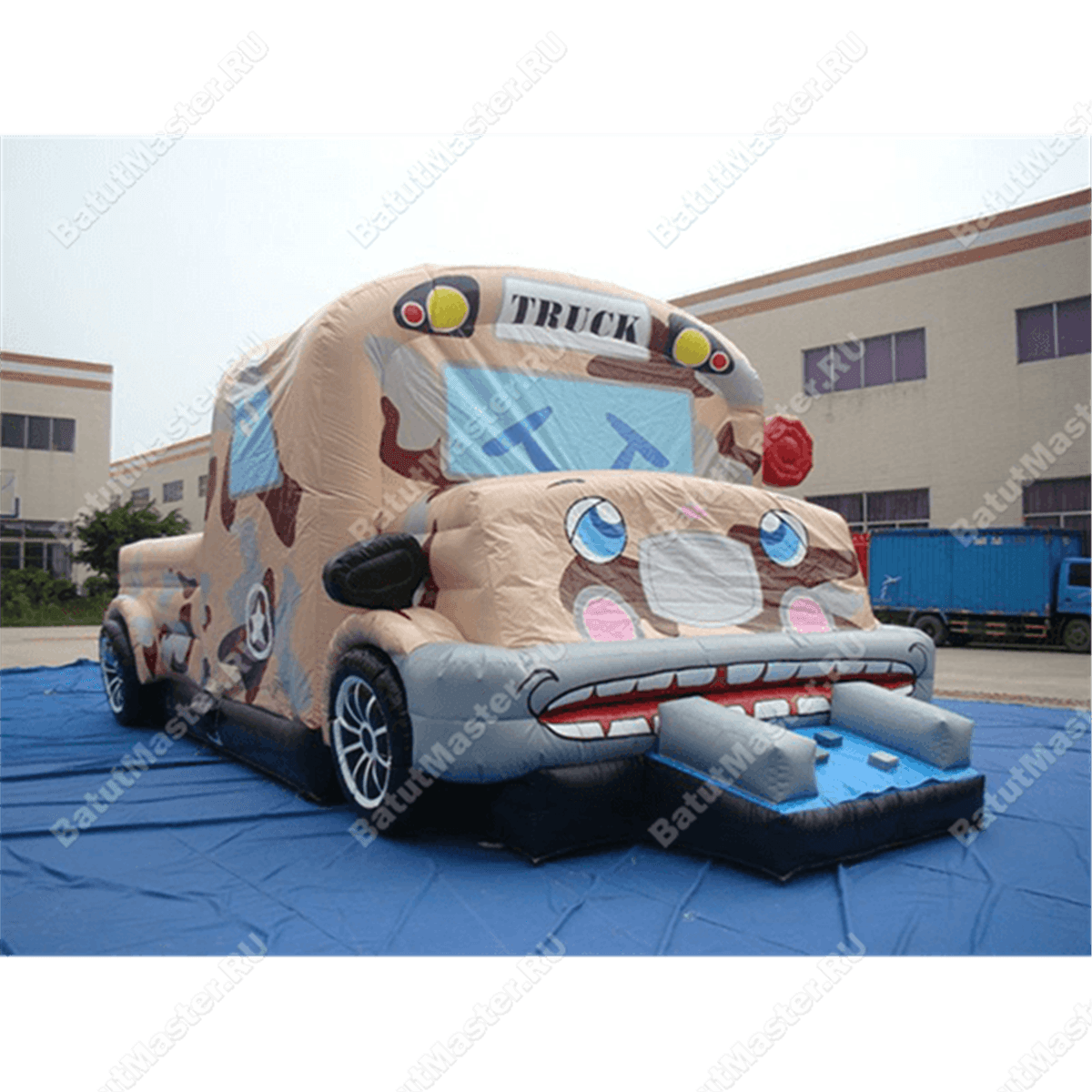 Надувная машина – лучшая конструкция для малышей. Трудно представить, что еще настолько может забавлять, чем поездка на автомобиле в детстве. Но интересный батут может заинтриговать не только этим, ведь из дверцы водителя стелется мягкая горка, а в кузове надувной военный автомобиль перевозит всевозможные и цветные столбики пуфики, другие игровые препятствия.