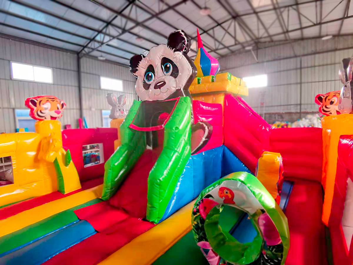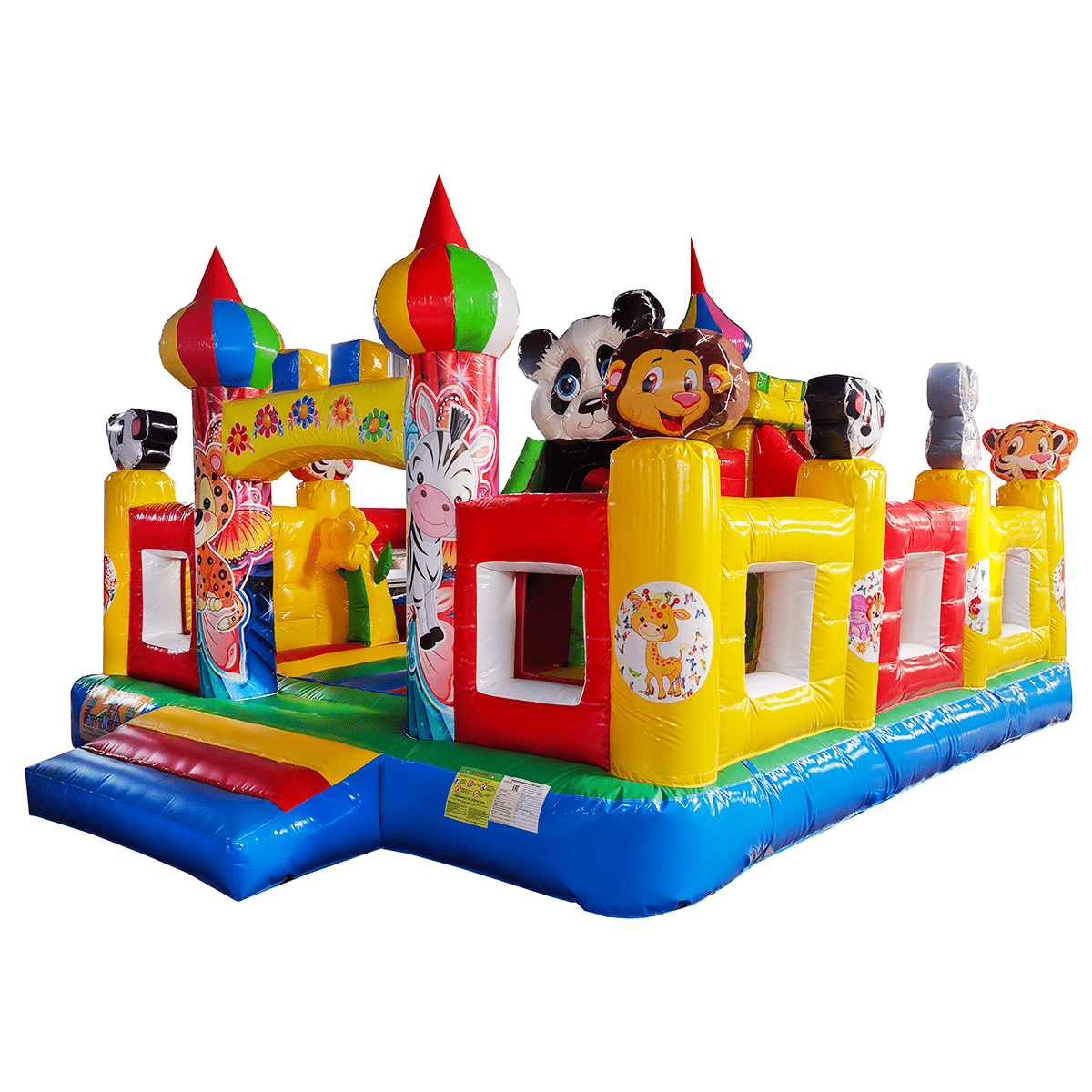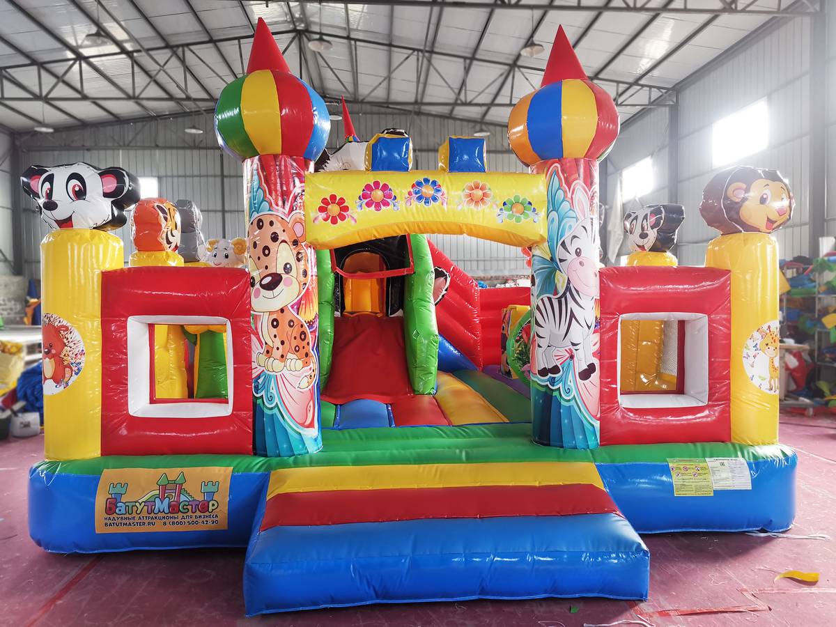В центре размещена стилизованная под башню горка с безопасным съездом с одной стороны и ступеньками с другой. По периметру стен волшебного надувного царства расположены фигуры забавных зверей. Основные конструктивные элементы: