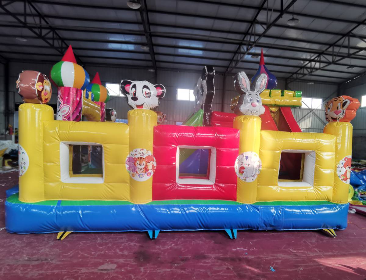 В центре размещена стилизованная под башню горка с безопасным съездом с одной стороны и ступеньками с другой. По периметру стен волшебного надувного царства расположены фигуры забавных зверей. Основные конструктивные элементы:
