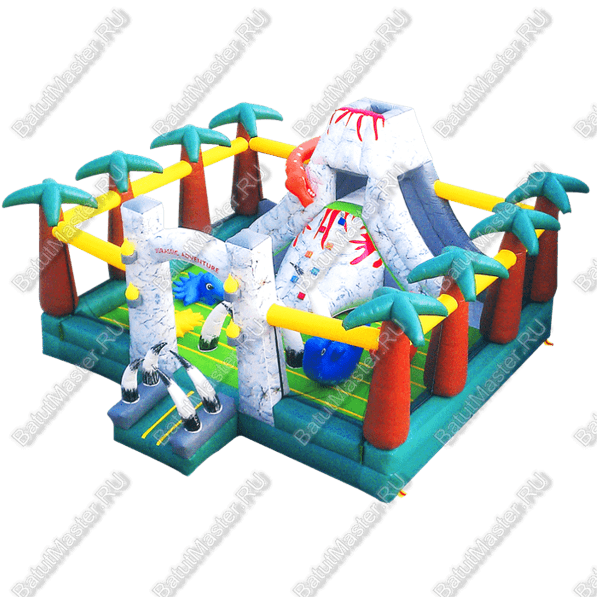 Надувной батут «Вулкан» представляет собой большой комплекс, предназначенный для веселых состязаний и незабываемого времяпровождения. На входе детей встретят надувные модули в виде клыков мамонта. Сердце батута – это объемная гора с двух сторон окруженная подъемом и спуском посередине. Вся дальнейшая площадь, на которую попадает ребенок, предназначена для прыжков, бега, подъема на гору и спуска с нее. Здесь есть скалодром для любителей взбираться наверх. Все объемное, мягкое и так скользит… Резвиться на нем можно часами, ведь для этого нет никаких преград. Дополнительным украшением комплекса являются надувные динозавры и драконы. По бокам батут окружен прочной сеткой, которая выполняет защитную функцию. Также она полностью просматривается, что является преимуществом для родителей.