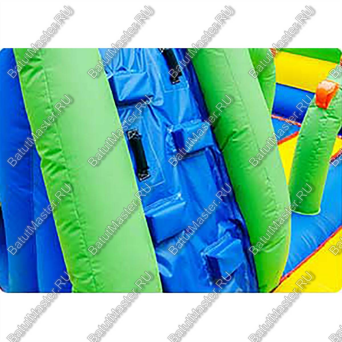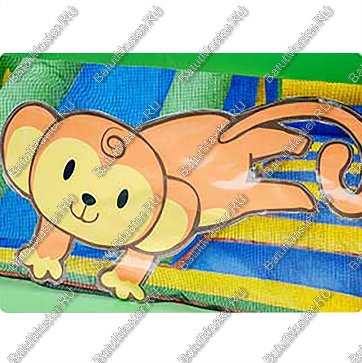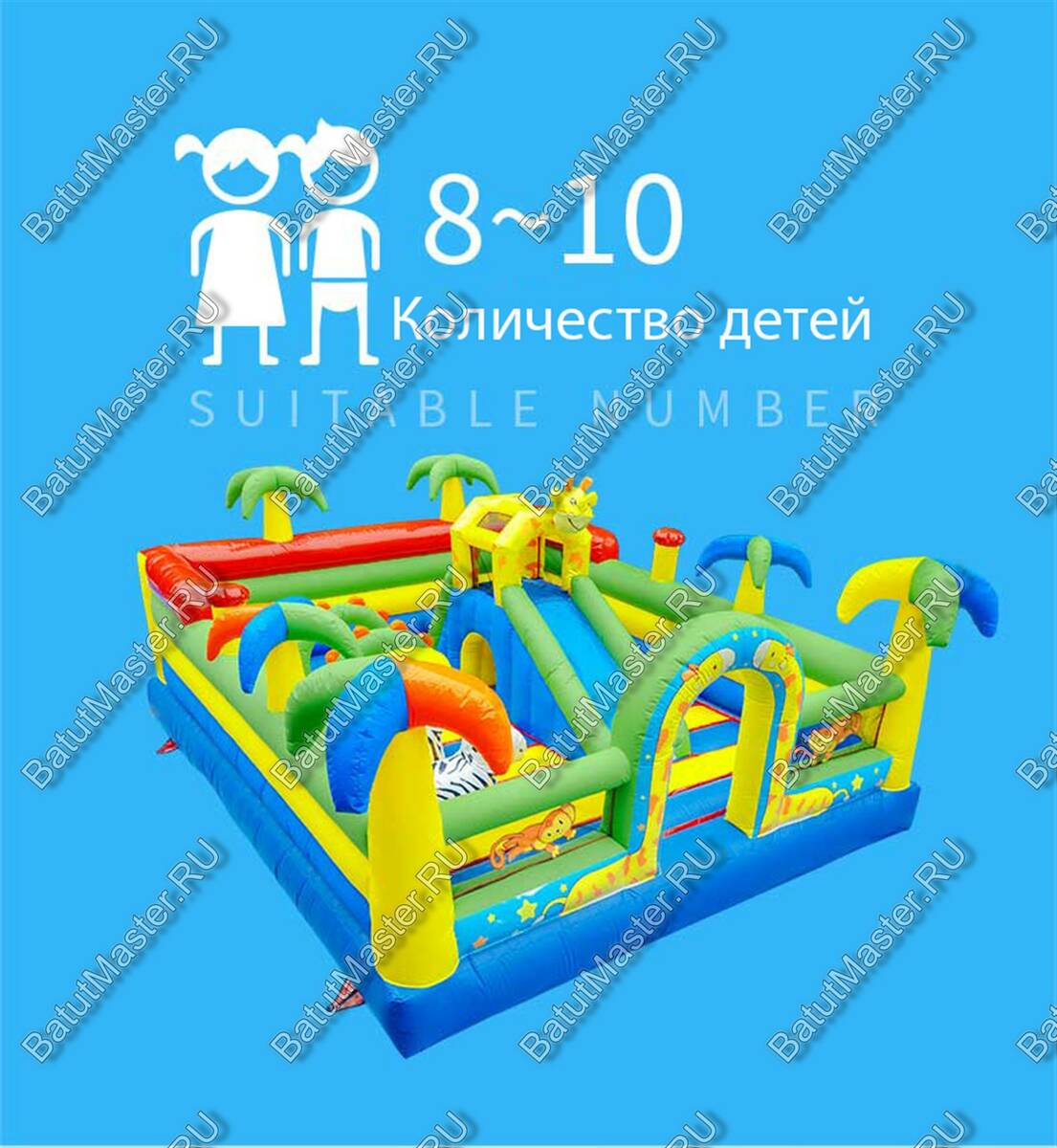 Стоит только взглянуть на дизайн данного батута, как всё станет понятно: выходной действительно будет ярким и наполненным сплошным позитивом для ребёнка. Доминирующий цвет – жёлтый, ассоциирующийся с солнцем и теплом. Вокруг расположены надувные пальмы, а на самом верху виднеется весельчак-жираф.