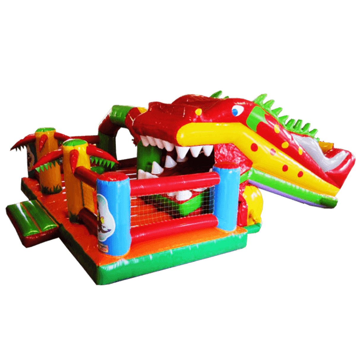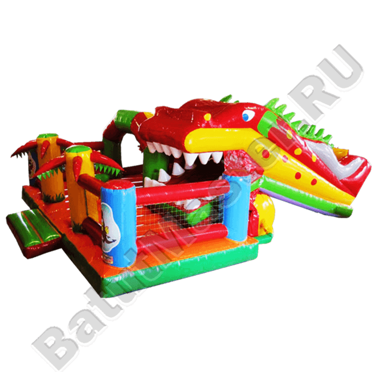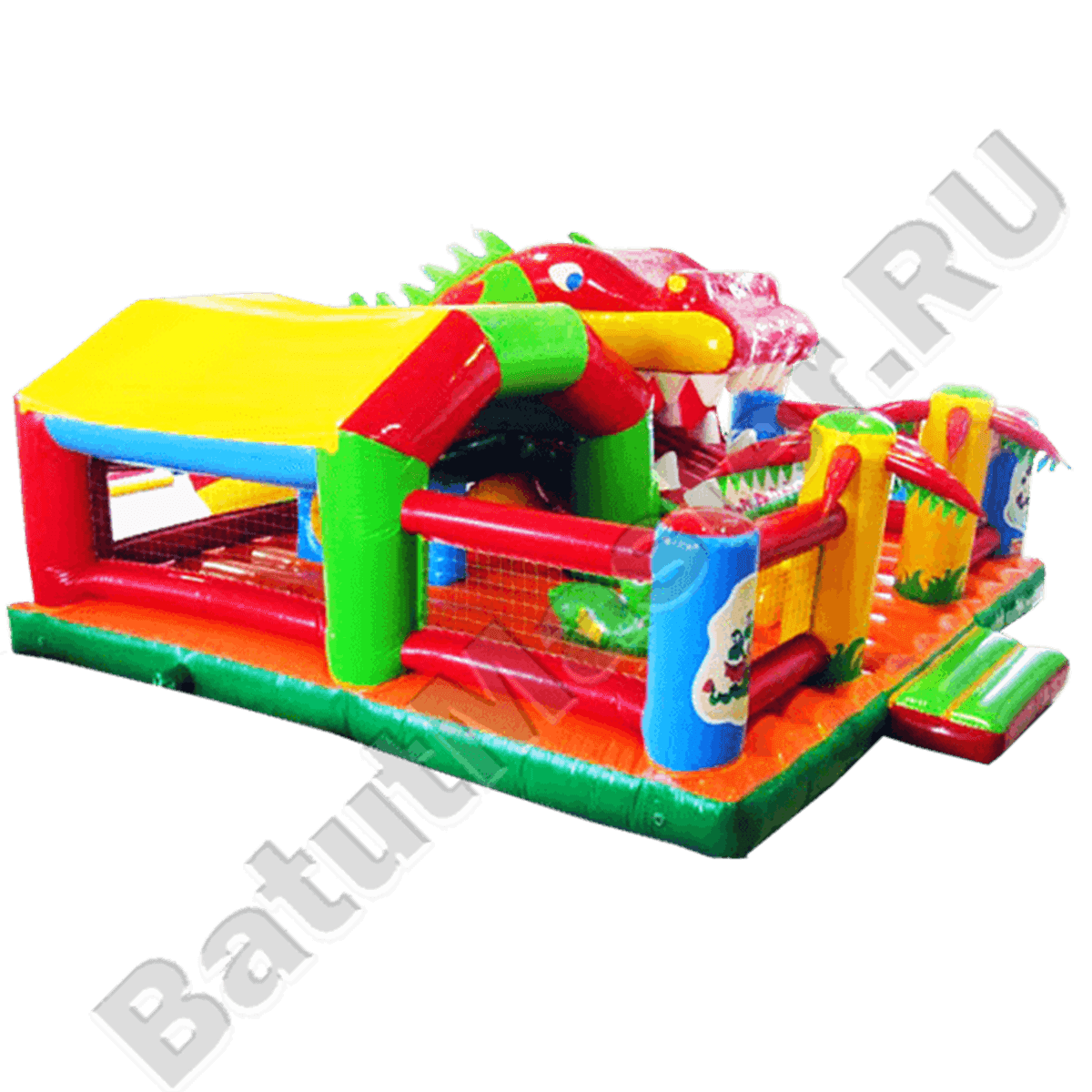 Надувная модель «Ящер» выполнена в неординарной форме, в ней имеются крытая площадка для прыгания, маленькая горка в форме головы дракона и необычные надувные элементы по периметру изделия.