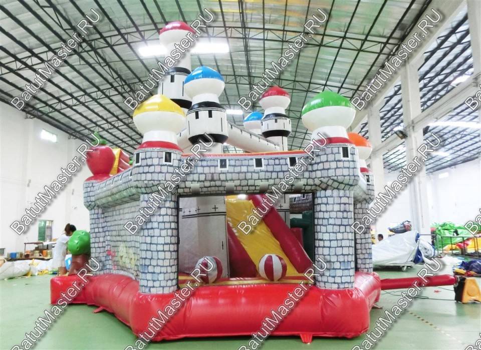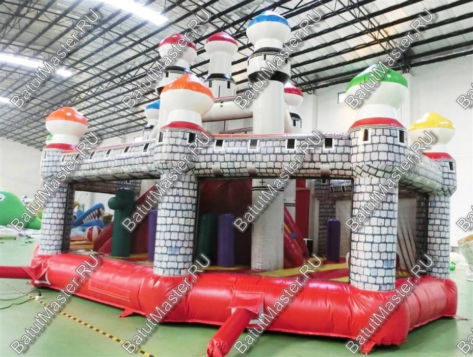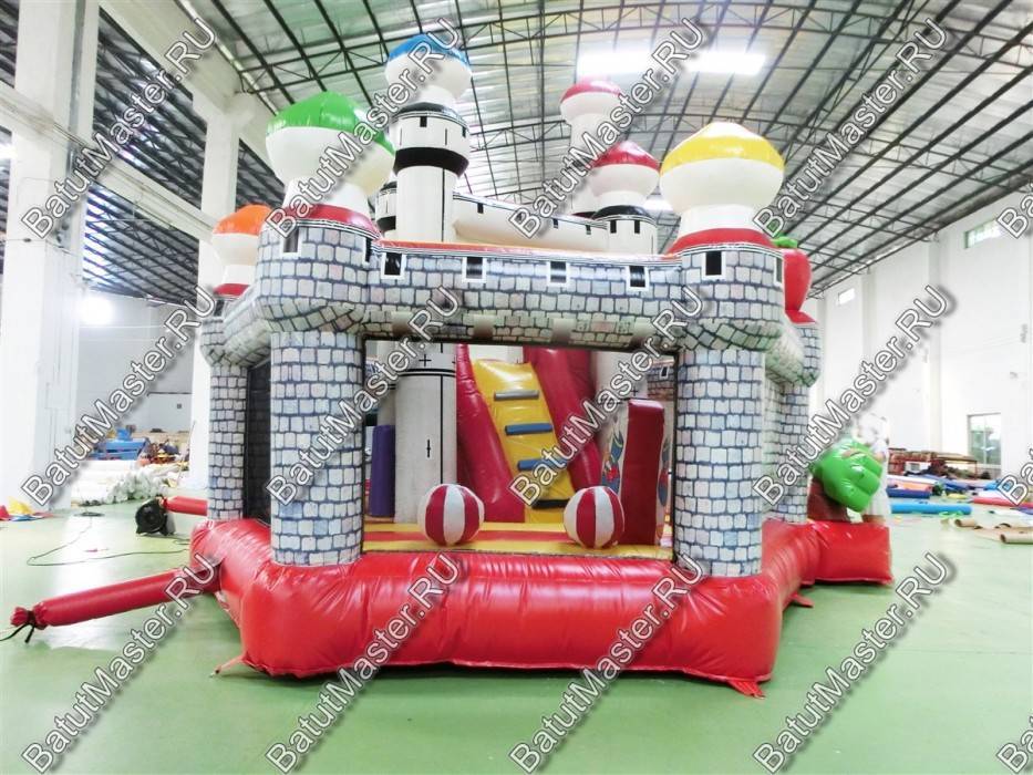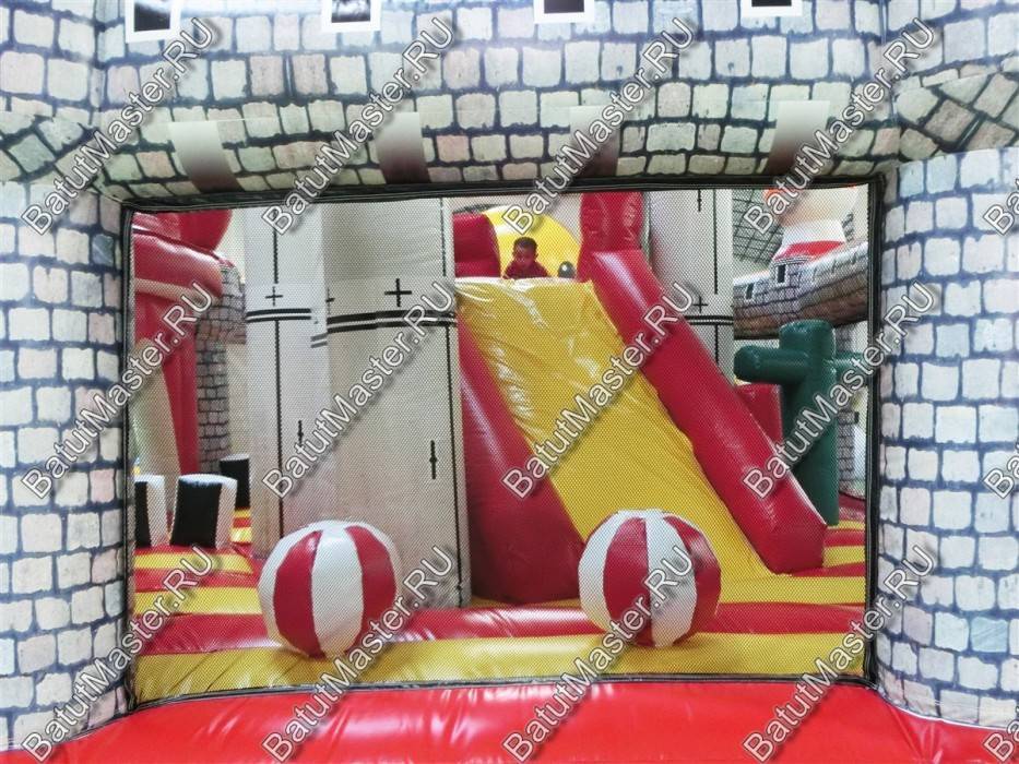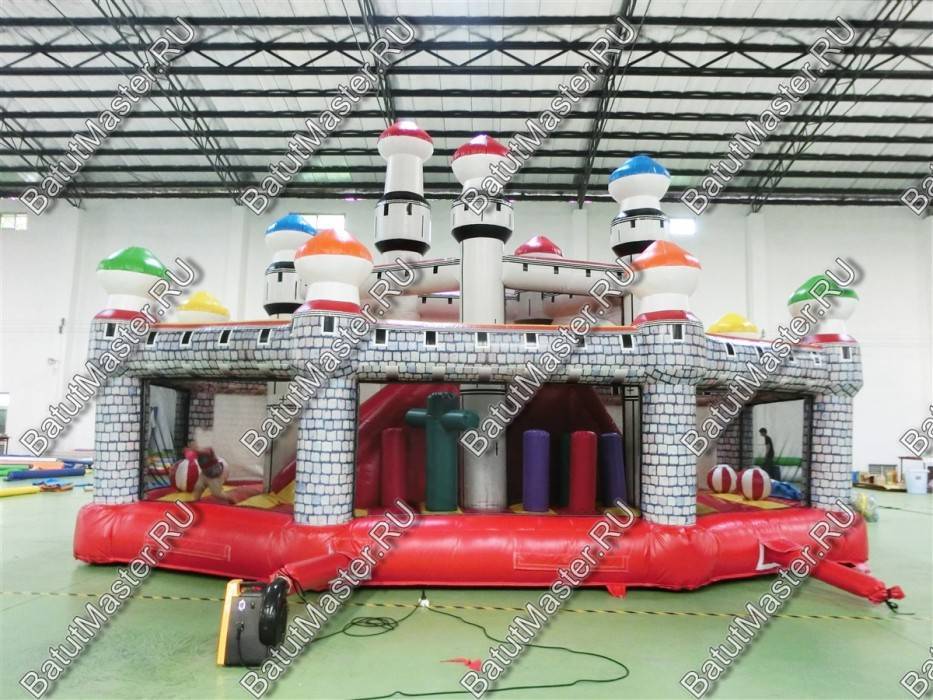 Надувной батут из ПВХ в стиле игрового замка или крепости напоминает настоящее историческое сооружение из компьютерных игр. Необычная конструкция заключается в том, что фасадная стена полностью сплошная и непросматриваемая, а все остальные - изготовлены из сетки и лишь в углах поддерживаются надувными колоннами в виде башен. Внутри коммерческой конструкции есть игровые фигуры в виде надувных столбиков и небольшой красной горки. Эти элементы находятся в самом центре батута для бизнеса. По краям площадки остается свободное место, которое вы можете оставить для бега и прыжков или разнообразить собственными надувными конструкциями.