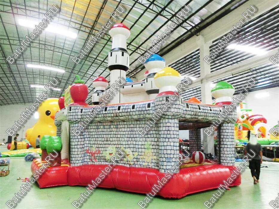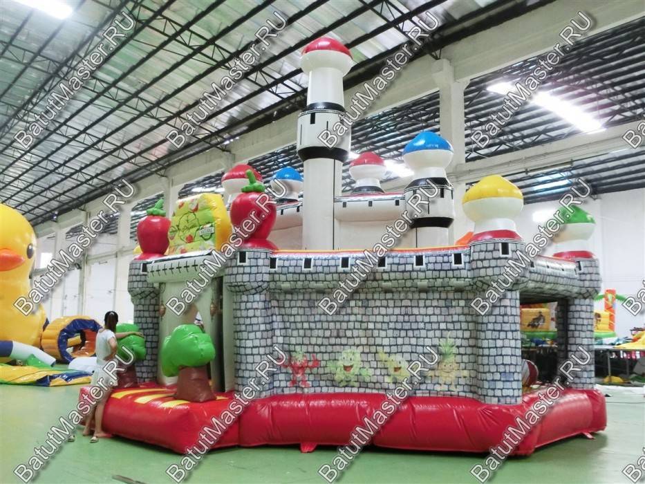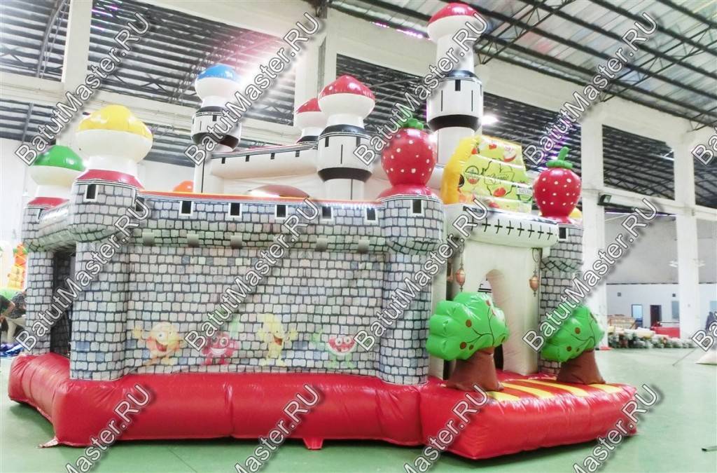 Верхняя конструкция – ключевой элемент коммерческой площадки, так как именно благодаря ему батут далеко заметен и совсем не похож на все остальные аттракционы. Этот верхний этаж состоит из целой сложной конструкции, составленной из множества белых башен с разноцветными крышами. Вход на фасадной стене украшают 2 фигуры ярких клубничек сверху и 2 зеленых дерева снизу. Надувные «каменные» стены кажутся веселыми и яркими благодаря изображениям фруктов, которые разместились на них.