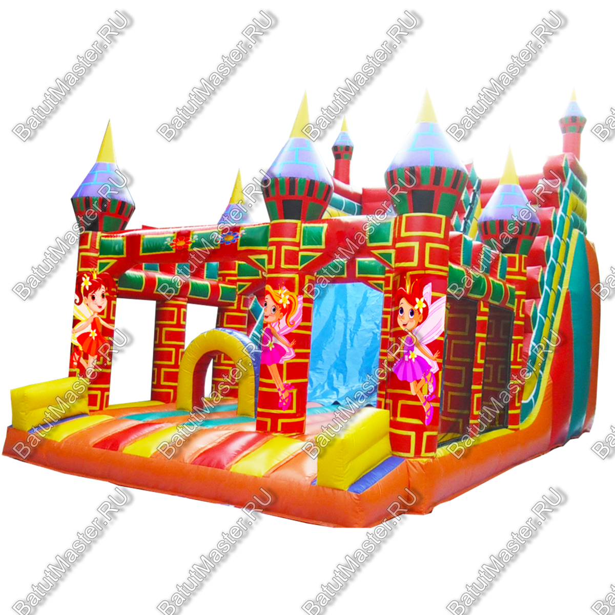 Он имеет две локации, одной из которых является горка, а другой поле для прыжков. Яркая и интересная горка защищена надувными бортами, а это значит, что она полностью безопасна. Спереди батут полностью открыт, таким образом дети будут всегда на виду у родителей. Сам коммерческий батут полностью надувной, не имеет жестких элементов. Тематический и современный комплекс дети захотят посетить еще и еще. Снаружи он украшен изображениями добрый фей.