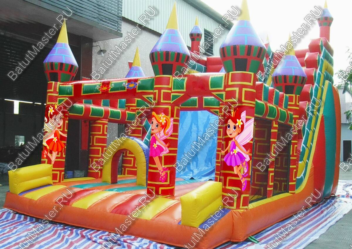 Добро пожаловать в замок фей! Маленькие первооткрыватели непременно оценят необычный игровой комплекс, это словно сказка о золушке. Красочный надувной батут имеет одну широкую горку, с которой спускаться вниз одновременно могут несколько детей и подъем с мягкими ступеньками. Надувное кольцо, тоннель и другие мягкие модули. Через которые так любят лазать дети. Особенно в восторг придут юные леди, когда, зайдя на батут почувствуют себя среди волшебных фей.