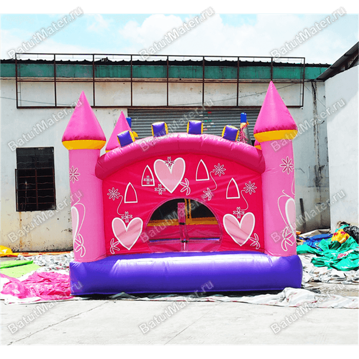 Замки любят не только юные красавицы, но и смельчаки-рыцари, поэтому аудитория у данного аттракциона самая разносторонняя. Место для прыжков и для бега – это то, из чего состоит батут по своей сути. Дизайн настолько завораживает, что даже взрослые прохожие останавливаются посмотреть на чудо-домик. Все стены, кроме входной, имеют вид натянутой пленки ПВХ с изображением светло-розовых сердечек и имитации небольших окошек.