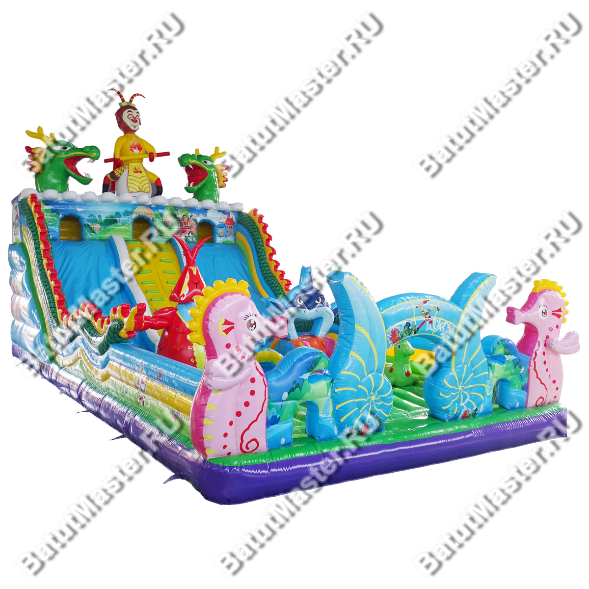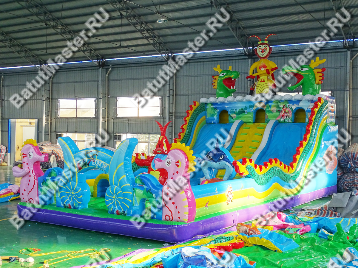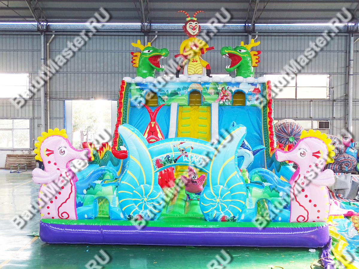Батут имеет множество занимательных деталей и очень красивых декораций. Надувные фигуры в виде морских обитателей встречаются детишкам тут и там и поднимают маленьким посетителям настроение.