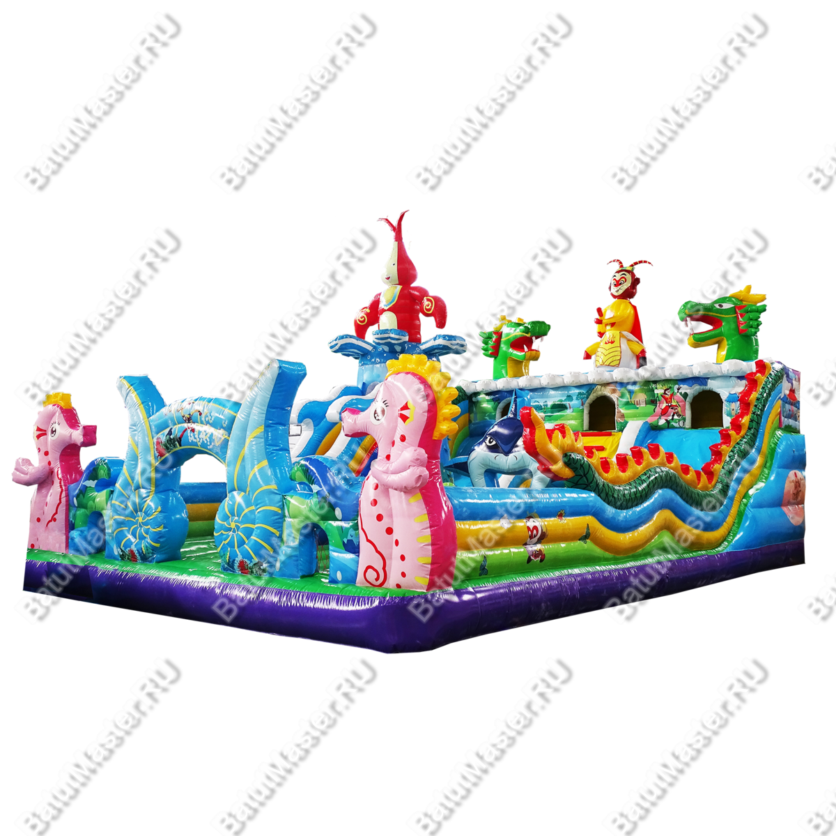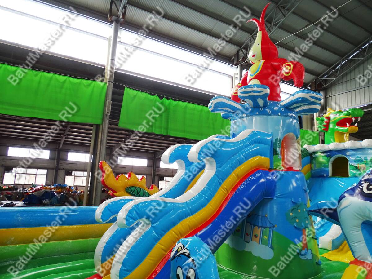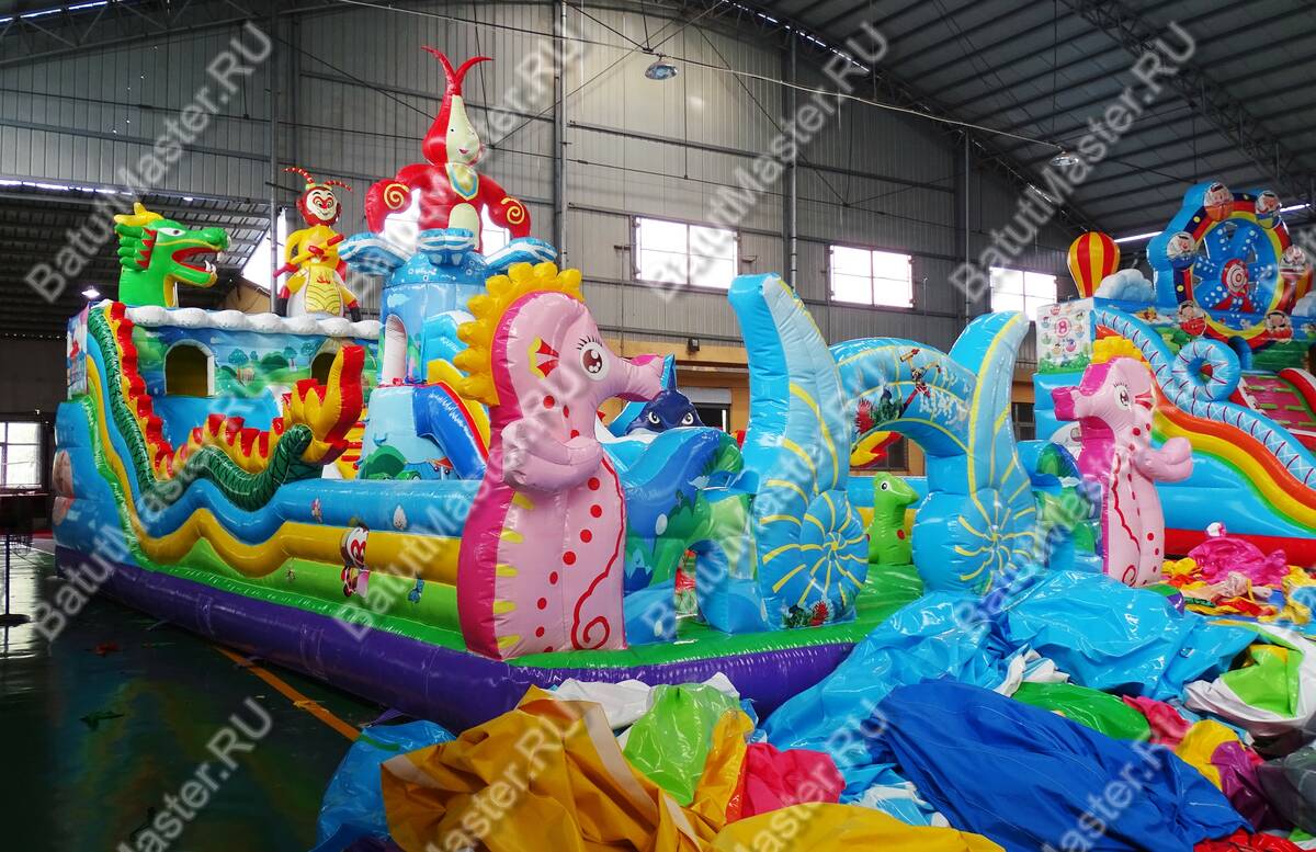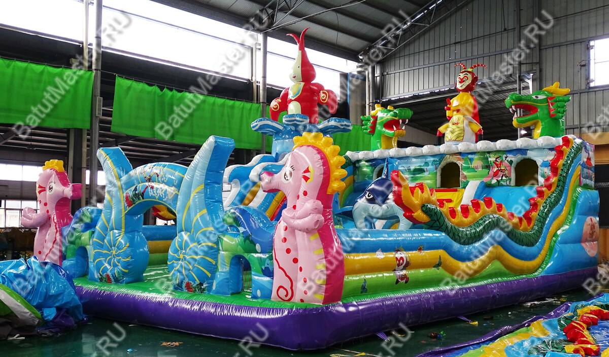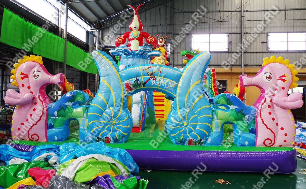Как вы думаете, каким представляют дети затерянный остров? Наверное, покрытый густой растительностью участок суши, где много разных животных и птиц. Данная модель коммерческого надувного батута представлена в данной модификации и напоминает необитаемый остров с многочисленными известными героями. Для бизнеса особенно стоит отметить, что такой комплекс выполнен в ярких красках, от которых так пестрит в глазах. Детишкам непременно захочется попасть в него и исследовать пространство. Спереди аттракциона красуются ярко-розовые надувные морские коньки, словно из сказки. Лазурные морские раковины, тропические деревья и кустарники.