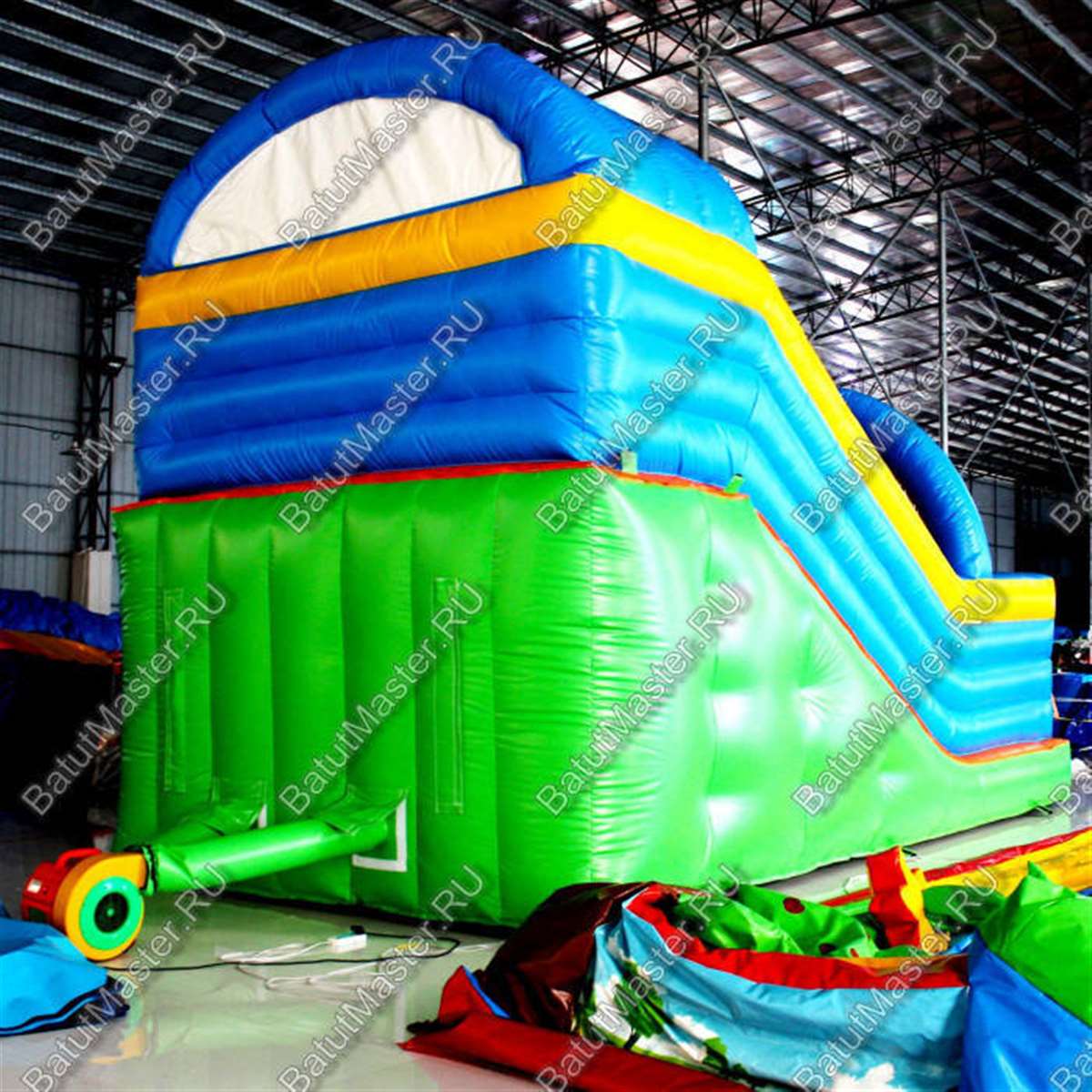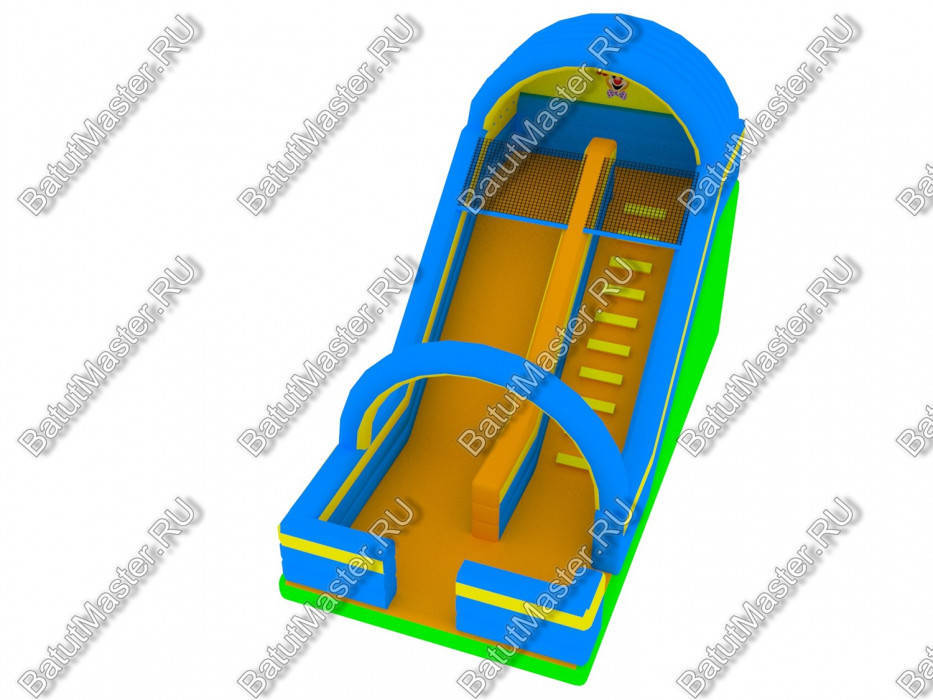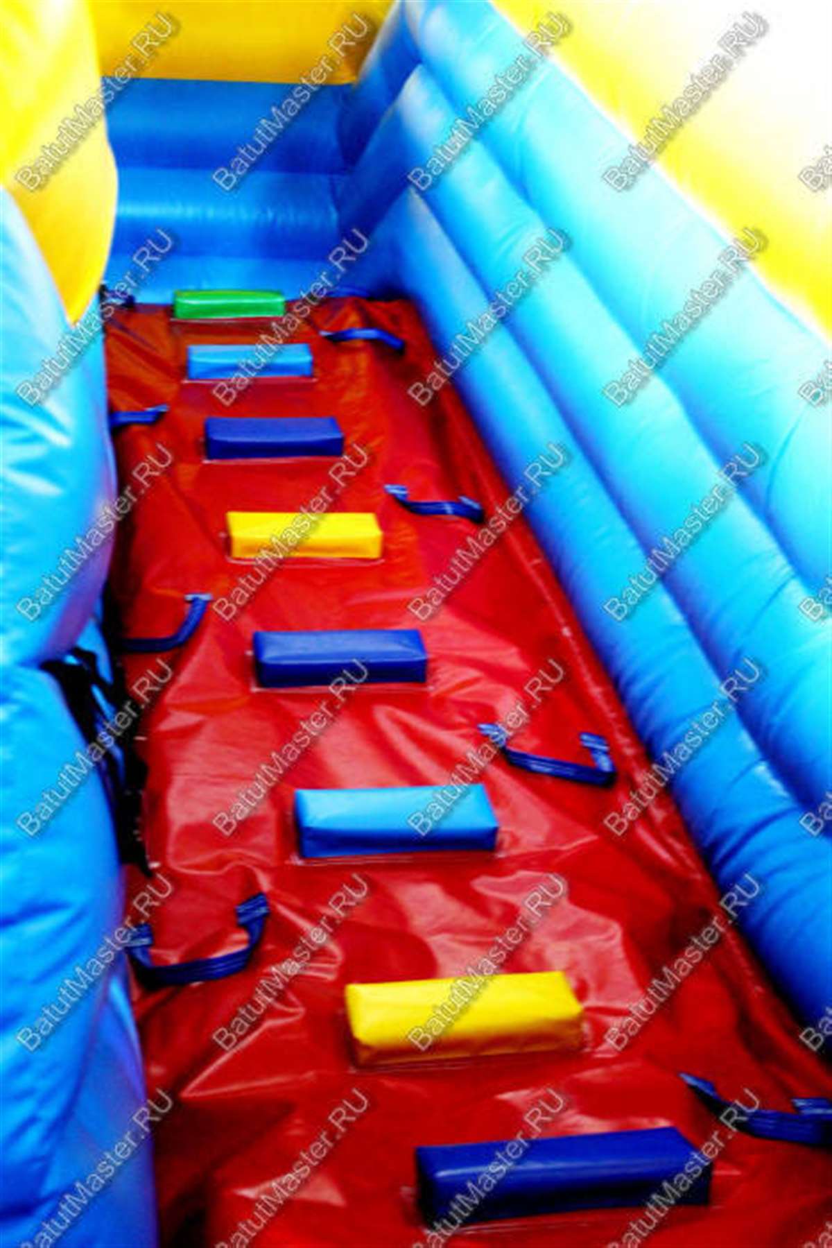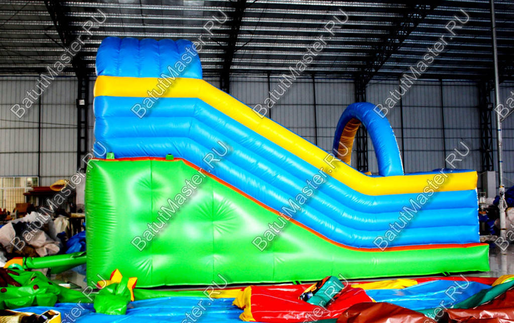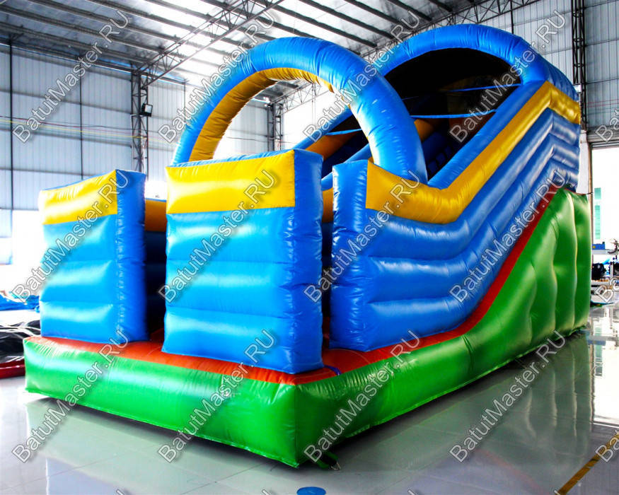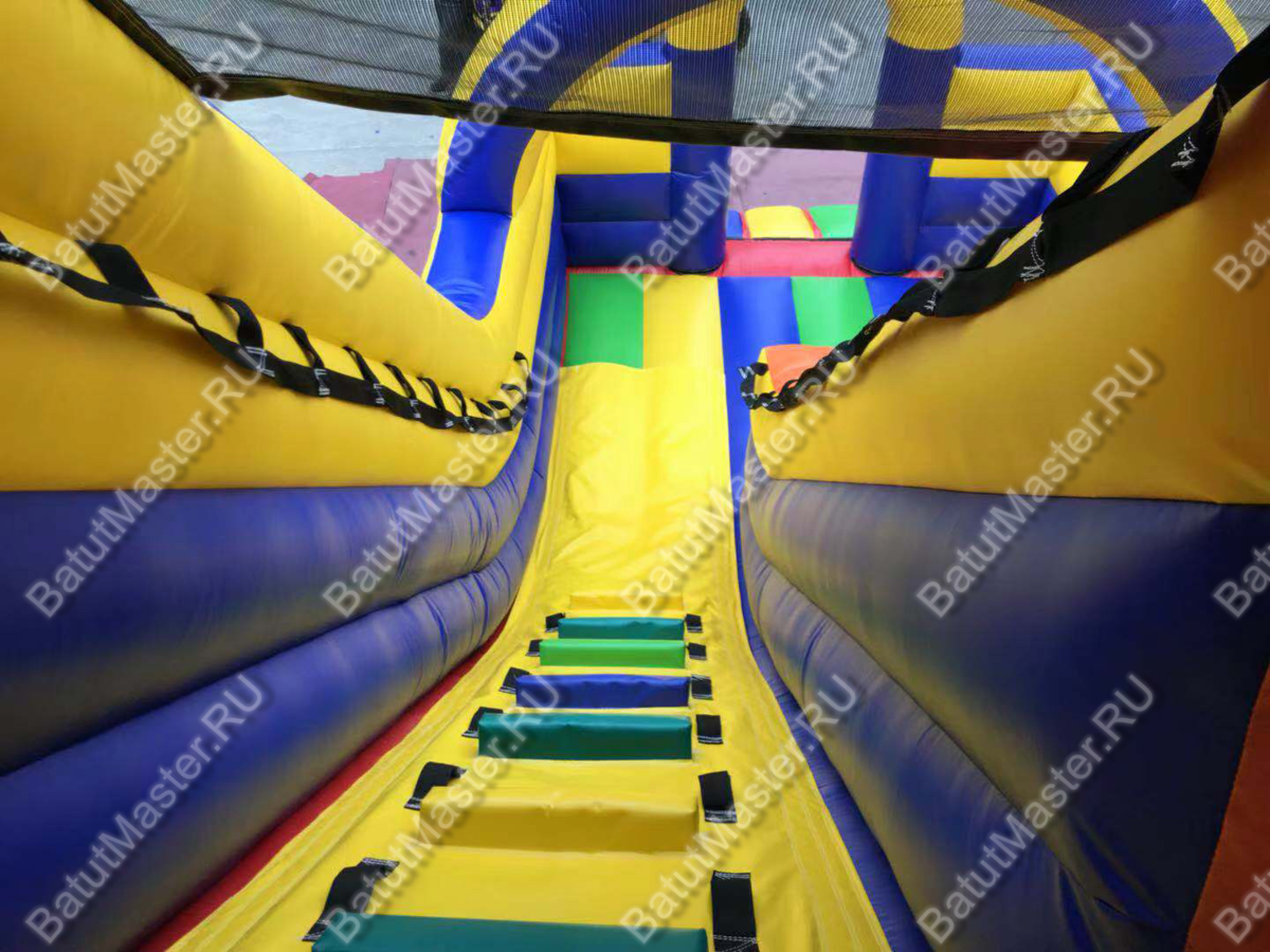 Данный надувной батут состоит из двух основных зон: площадка для прыжков и высокая горка. В коммерческом аттракционе соединилось несколько основных цветов (желтый, красный, синий и зеленый), поэтому площадка выглядит ярко и контрастно. Простая конструкция батута предоставляет владельцу возможность наполнить аттракцион игровыми фигурами на свой вкус, так как стандартная модель не предусматривает дополнительного игрового оборудования.
