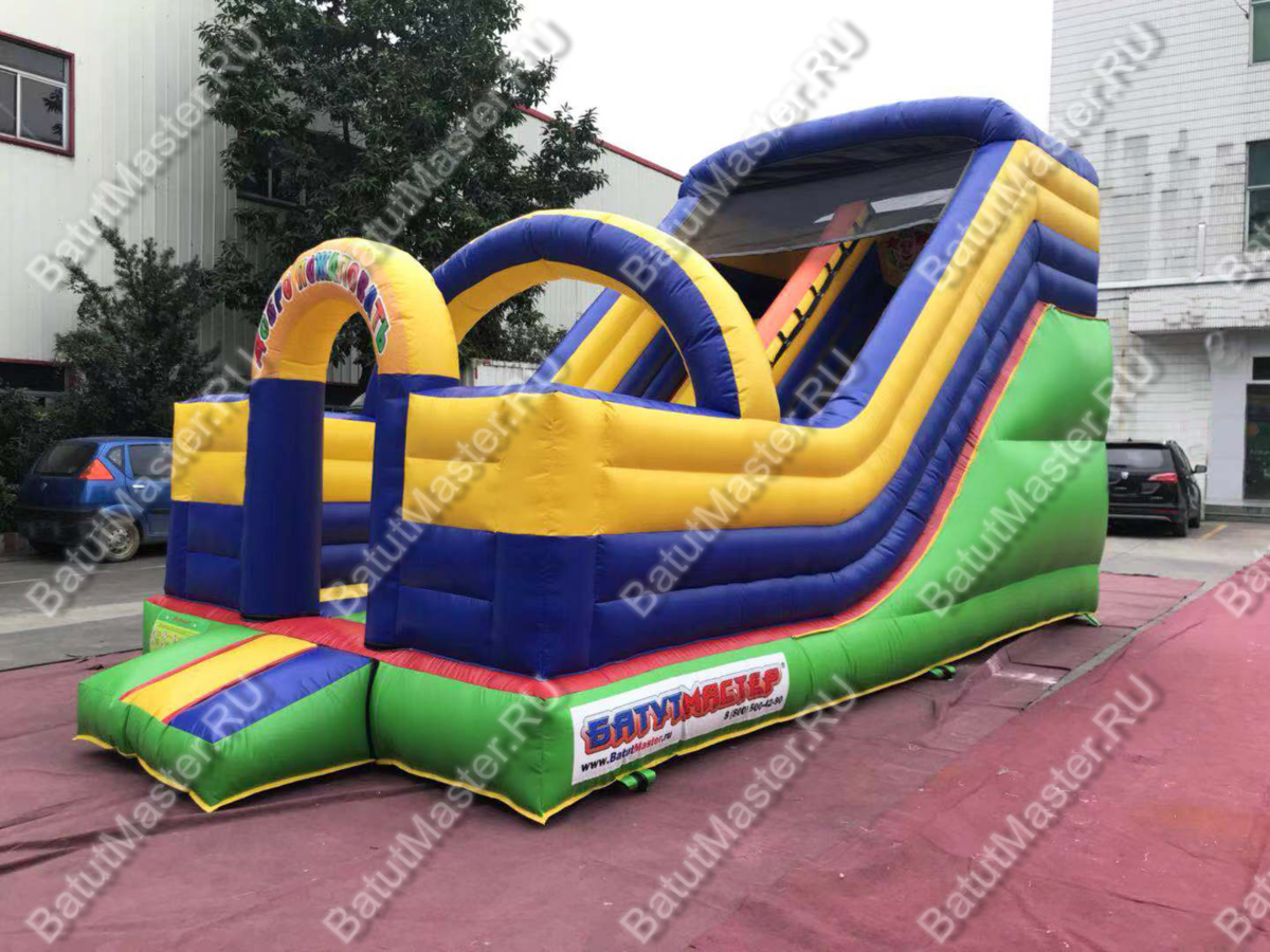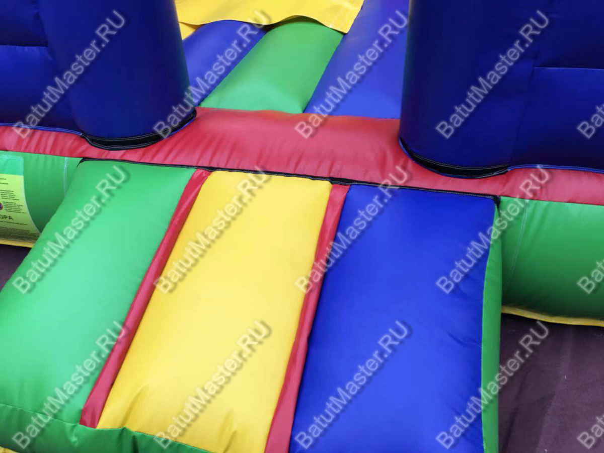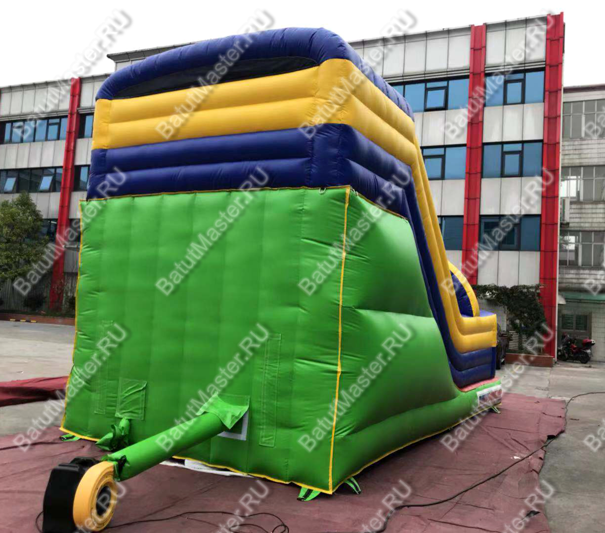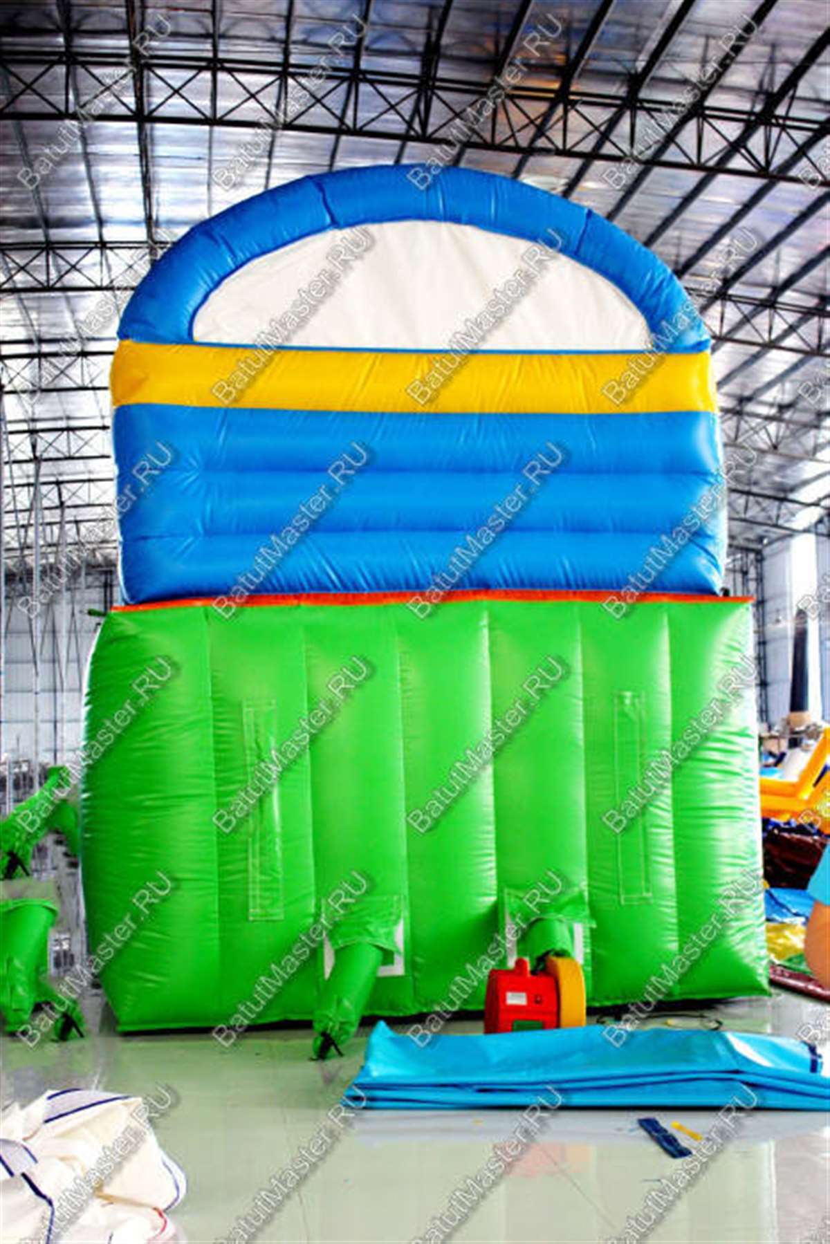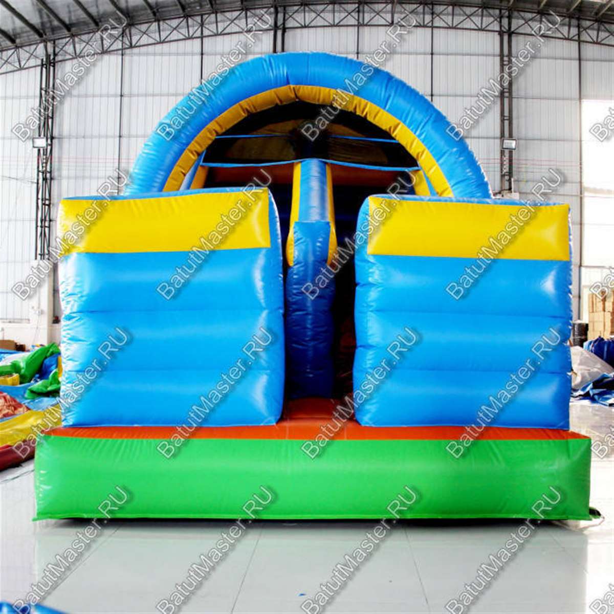 Данный надувной батут состоит из двух основных зон: площадка для прыжков и высокая горка. В коммерческом аттракционе соединилось несколько основных цветов (желтый, красный, синий и зеленый), поэтому площадка выглядит ярко и контрастно. Простая конструкция батута предоставляет владельцу возможность наполнить аттракцион игровыми фигурами на свой вкус, так как стандартная модель не предусматривает дополнительного игрового оборудования.