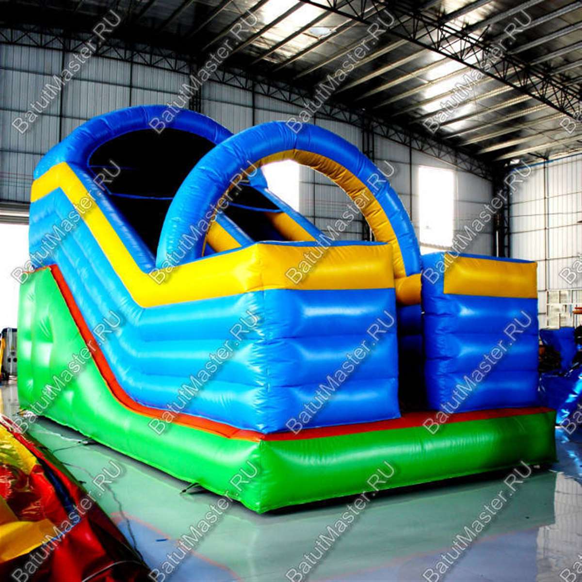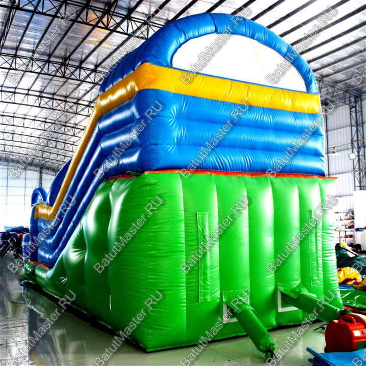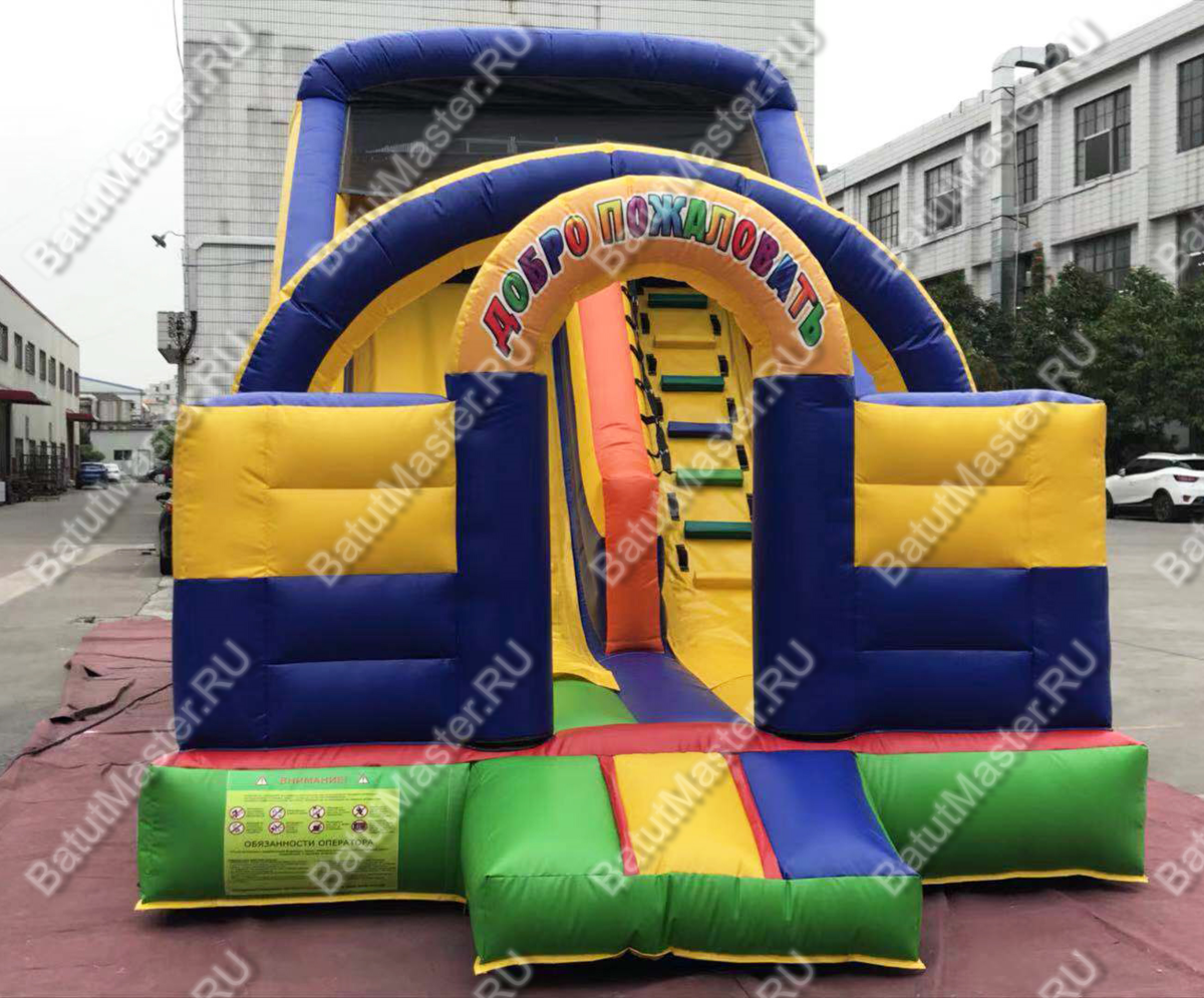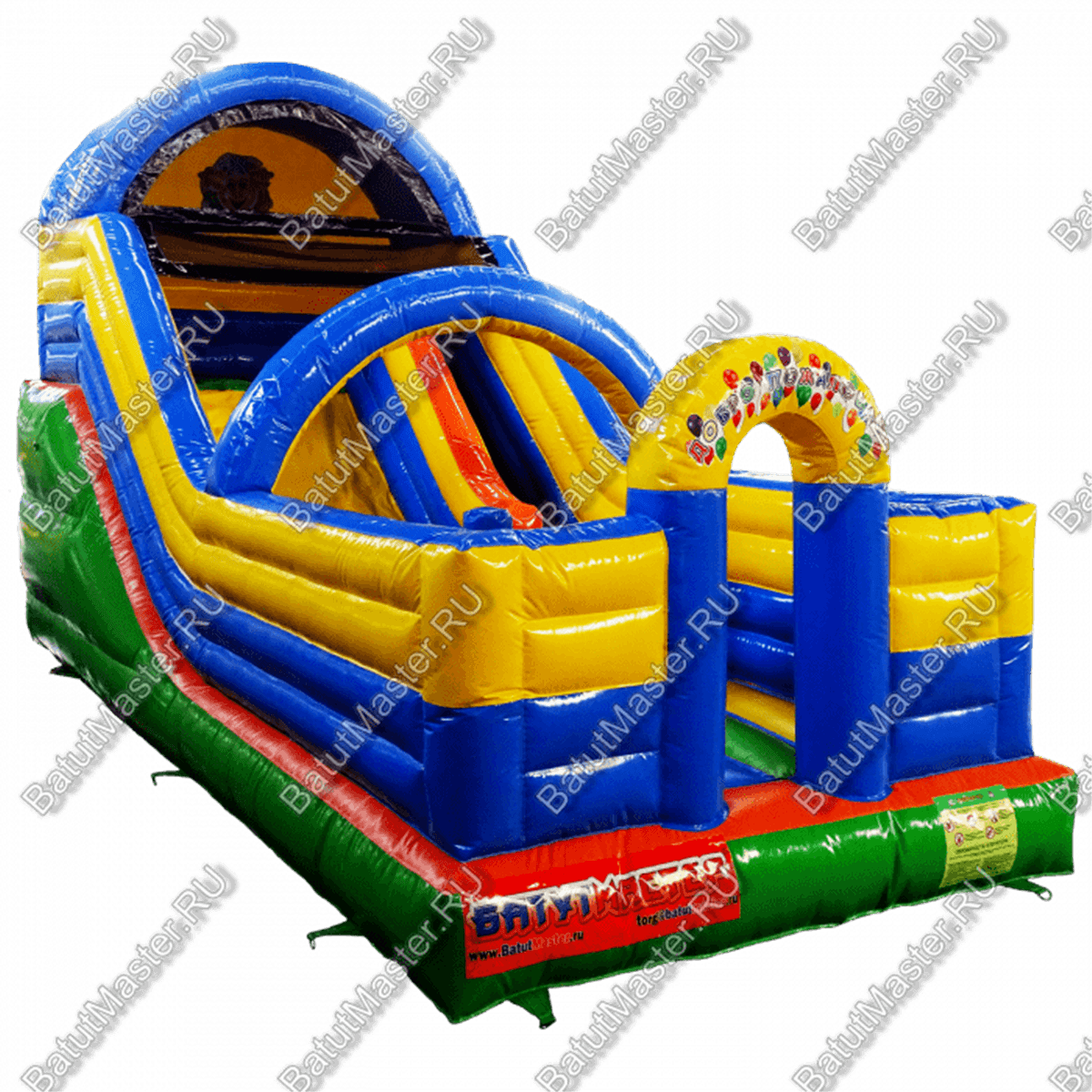 Данный надувной батут состоит из двух основных зон: площадка для прыжков и высокая горка. В коммерческом аттракционе соединилось несколько основных цветов (желтый, красный, синий и зеленый), поэтому площадка выглядит ярко и контрастно. Простая конструкция батута предоставляет владельцу возможность наполнить аттракцион игровыми фигурами на свой вкус, так как стандартная модель не предусматривает дополнительного игрового оборудования.