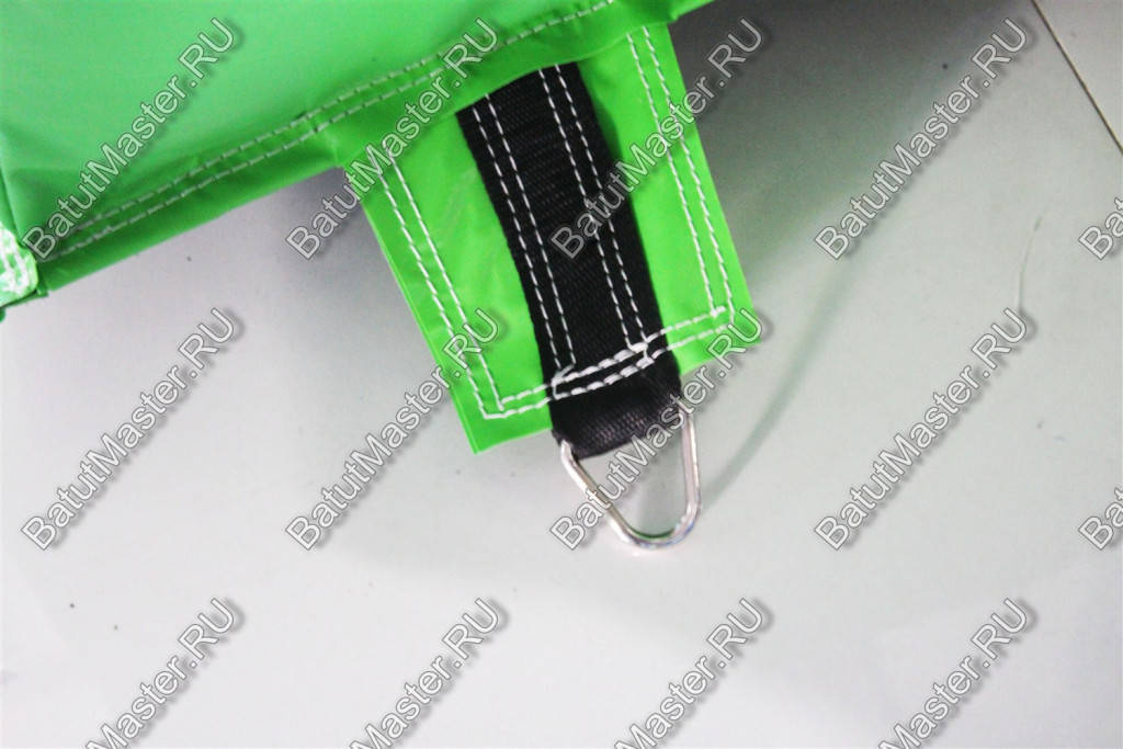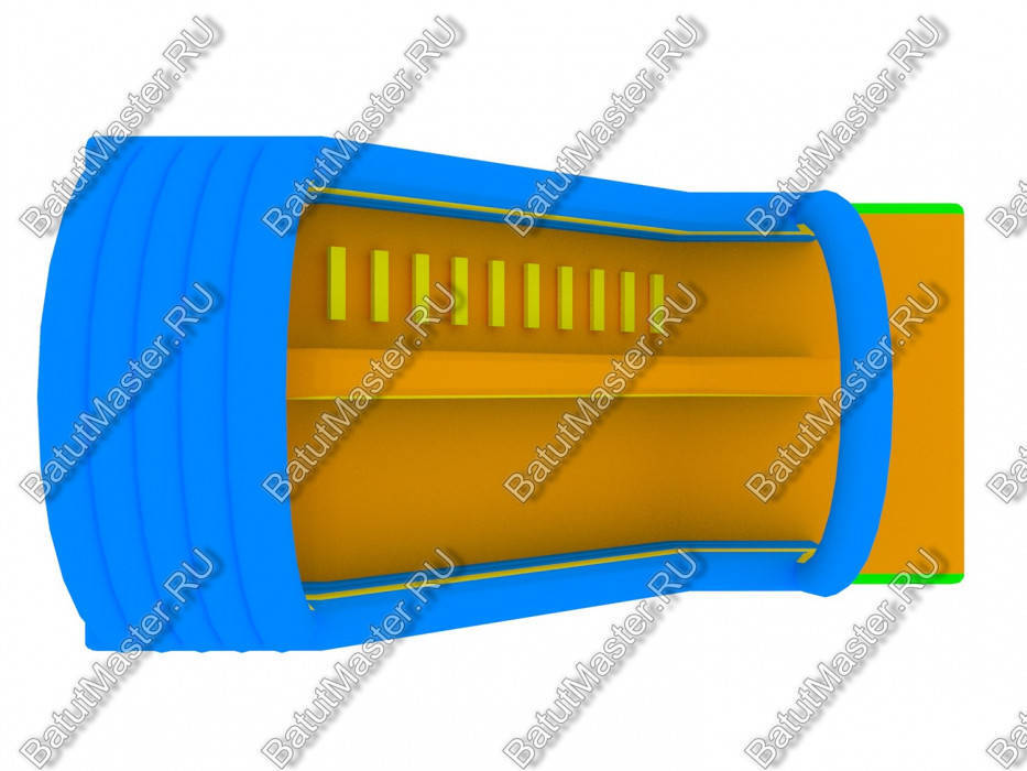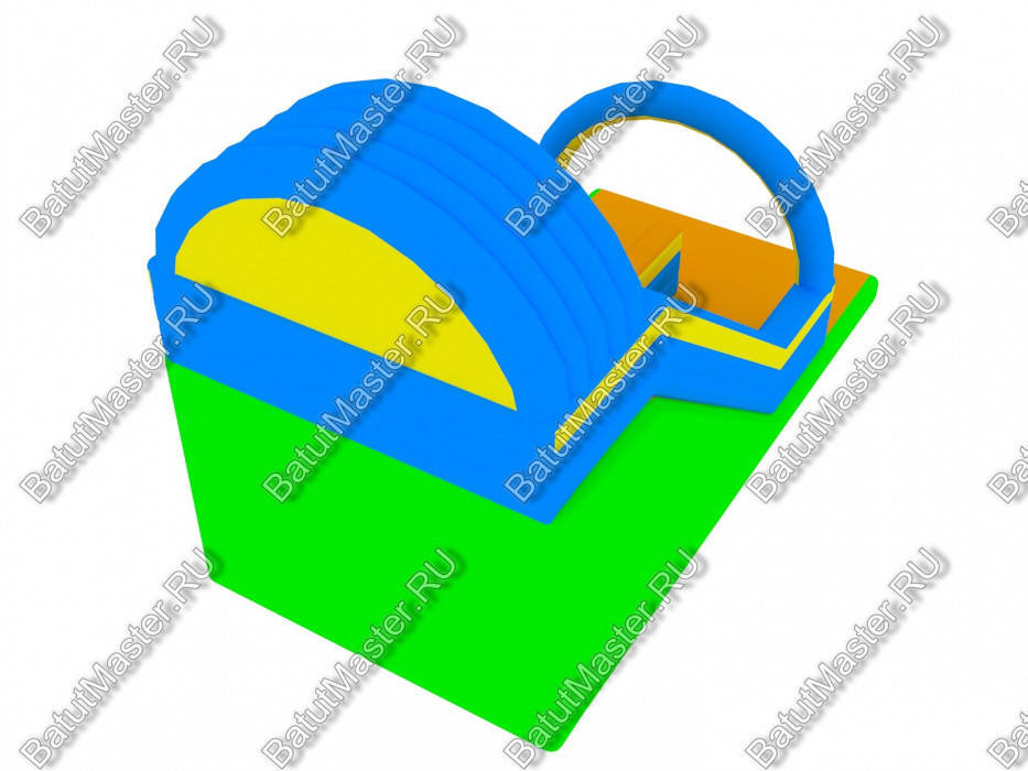 Батут для бизнеса начинается с входа в виде арки, на которой изображено множество разноцветных воздушных шаров. Дальше дети встретятся еще с одной аркой, но уже большего размера перед началом подъема на горку. Если первая зона коммерческого батута предназначена для прыжков и бега, то вторая – это горка, состоящая из двух частей: справа проходит лестница с яркими ступеньками и веревочными поручнями, а слева размещен сам склиз горки. Стартовая площадка находится на высоте 2,5 м. Эта зона полностью закрыта со всех сторон и даже сверху – дугообразным навесом, поэтому здесь дети могут укрыться от внезапно начавшегося дождя или ветра. Склизы горки и лестницы – это съемные части, поэтому по необходимости их можно заменять на новые для разнообразия цветовой палитры батута.