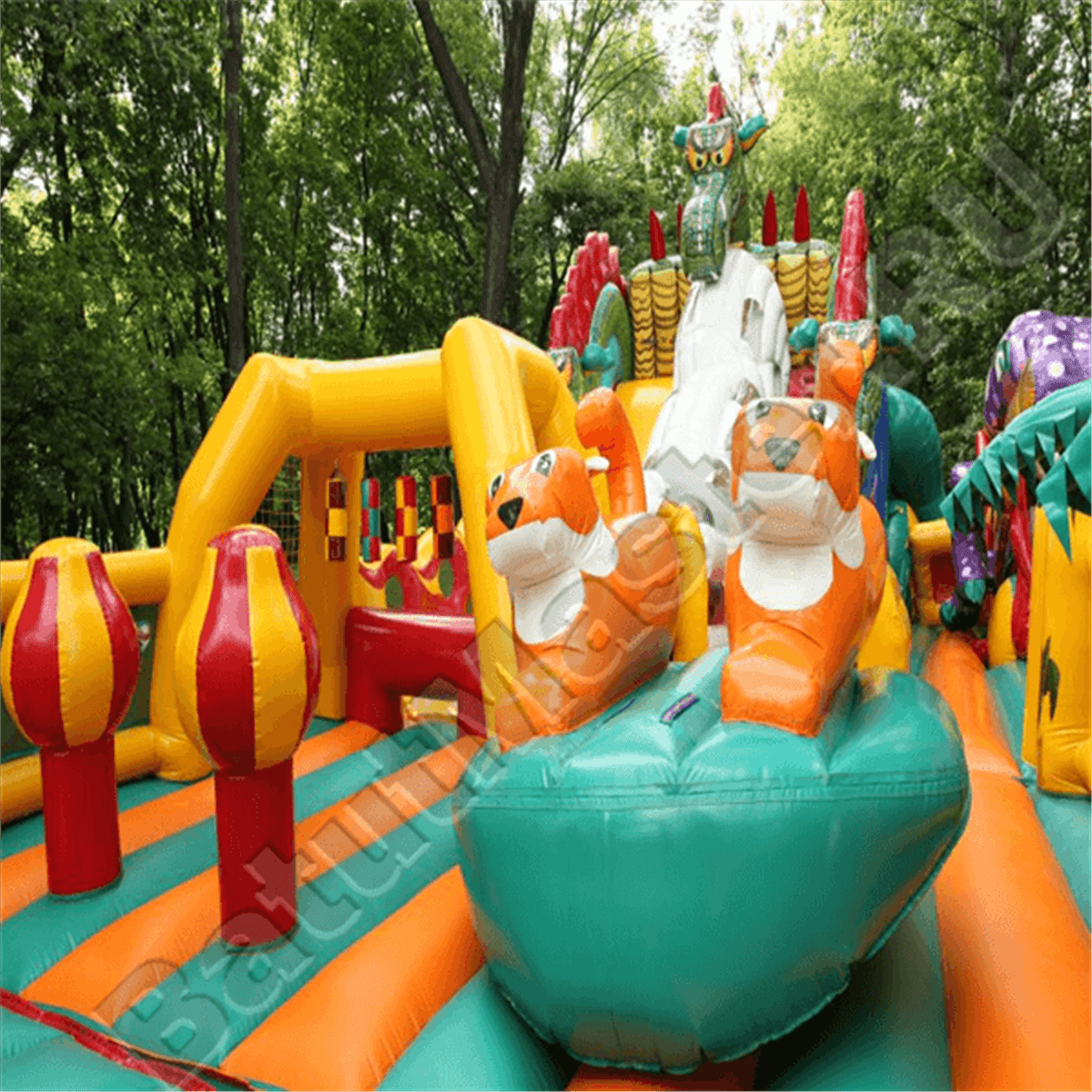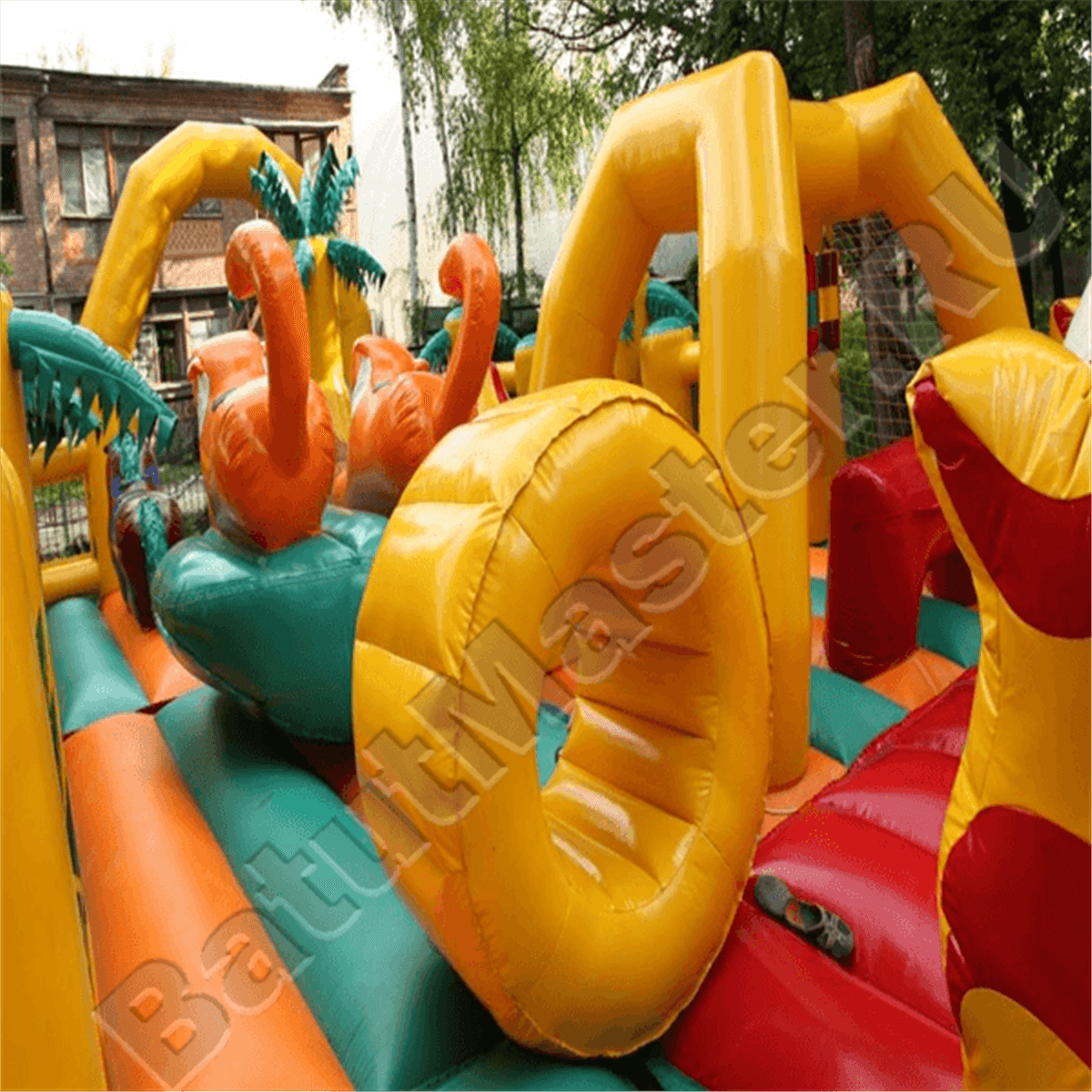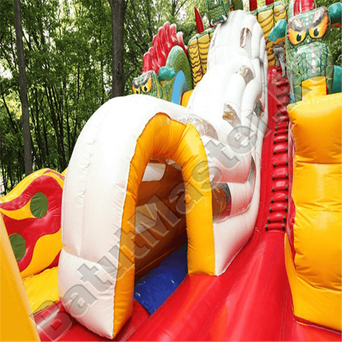 Как только дети попадут внутрь аттракциона, они окажутся внутри яркой площадки с множеством надувных фигур, иногда эти формы будут напоминать спортивные препятствия. Уже на пороге детям придется осилить скалодром с изображением обезьяны, дальше: подвесные груши, тигры, яркие башни и т. д. В левой части батута установлена увлекательная горка, состоящая из 3 зон, 2 из которых – это горки. Стартовая площадка батута находится на высоте 5 м, а самый верх конструкции украшает голова дракона. Центральная горка оборудована верхним тоннелем, который идеально ассоциируется с туловищем змея. Благодаря этому создается впечатление, что дети спускаются не по горке, а то туловищу чудовища. В левой части батута установлена робот-пасть в виде фиолетового земноводного,