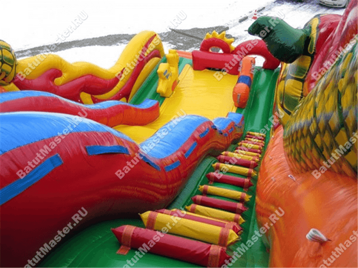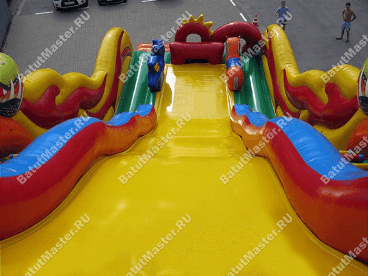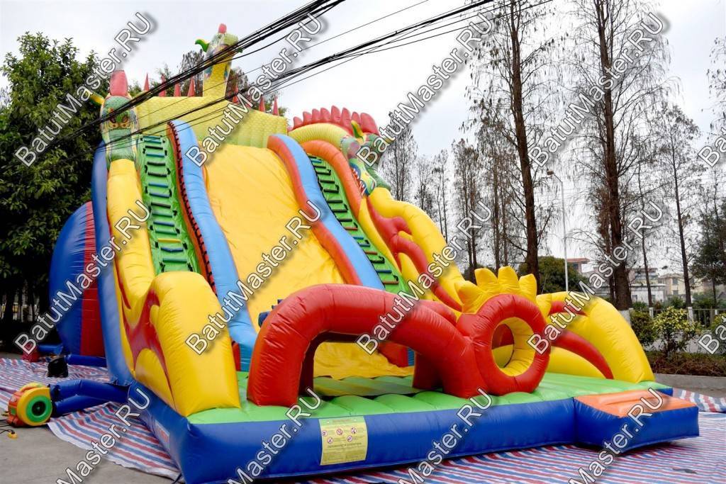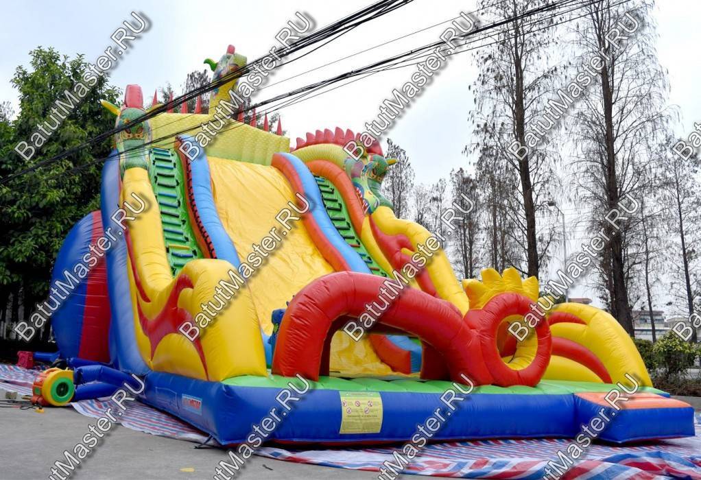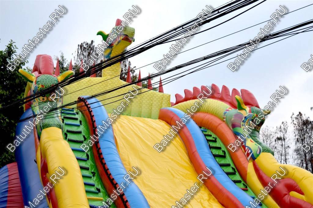 Надувной батут или высокая горка из ПВХ – это выгодный коммерческий проект, способный работать и приносить прибыль в любой местности: в парке, на площади или пляже, возле цирка или зоопарка. Дизайн конструкции можно отнести к сказочному, именно поэтому на нем присутствуют одновременно 3 головы дракона: одна на самом верху стартовой площадки и 2 по бокам (на внешних бортах горки). Аттракцион для бизнеса выполнен в размерах 13 на 6 м, а высота горки достигает 5 м, общая высота батута – 10 м.