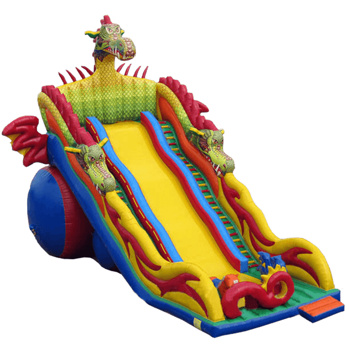 Начинается огромная горка с витиеватого окончания хвоста дракона, который будто спустился сверху и у входа в батут закончился. Этот элемент располагается на небольшой прыгательной платформе из зеленого ПВХ и именно отсюда начинается основное полотно, разделенное на 3 части: 2 боковых склиза с лестницами и 1 широкий склиз из желтого ПВХ – и есть сама горка. Как только дети доберутся до самого верха, они окажутся на стартовой площадке у самого туловища главного дракона. Немного передохнув после подъема и познакомившись с чудовищем ближе, можно начать съезжать вниз. Боковые стены, проходящие вдоль лестниц, имеют вид длинных хвостов змея и украшены его головами, будто дышащими огнем (красно-желтым пламенем), но из ПВХ.