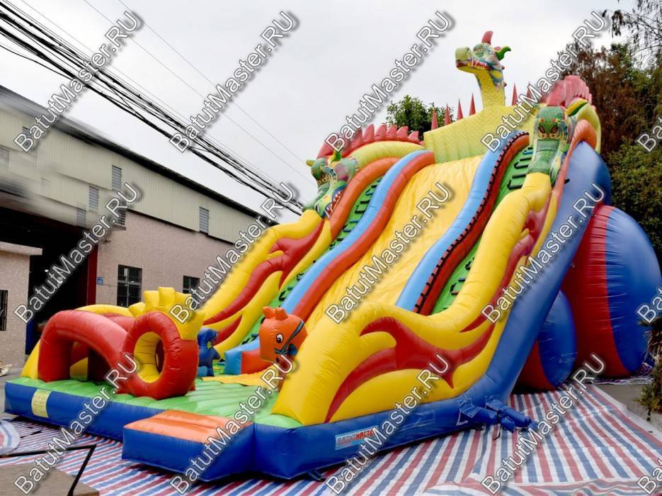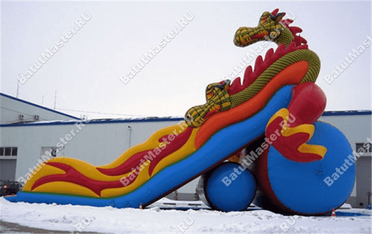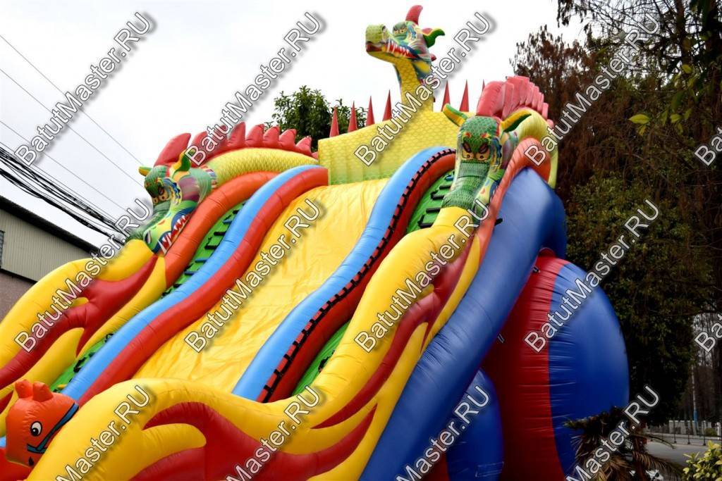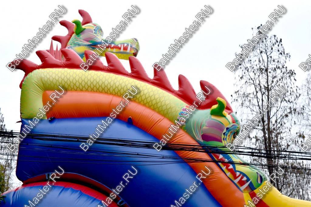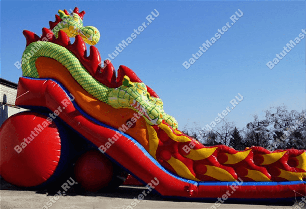 Зона спуска и подъемов разделена на 3 полотна, два из которых это лестницы. Они проходят справа и слева от горки. Сама же горка – желтого цвета с небольшими трамплинами, которые позволяют детям при спуске скатываться еще веселей. Высокий надувной батут с тыльной стороны опирается на горизонтально установленные цилиндр, поэтому конструкция для бизнеса достаточно устойчивая и надежная. Стартовая площадка находится на высоте 6 м, с трех сторон она закрыта надувными стенами, имитирующими тело дракона. Немного ниже от батута отходят красные крылья чудовища. На нижней площадке установлено несколько надувных дракончиков, на которых можно прокатиться верхом, и приготовится к подъему.