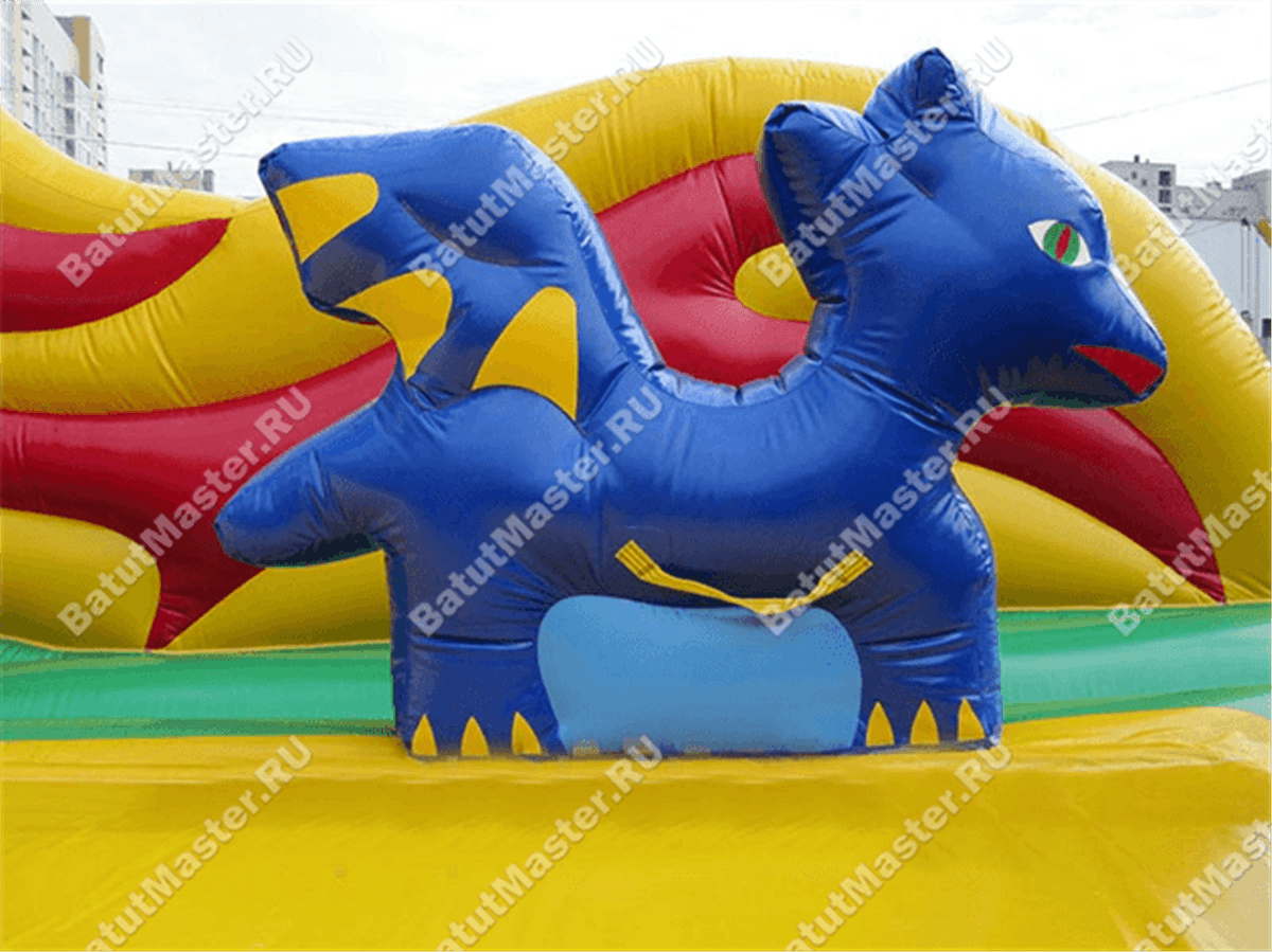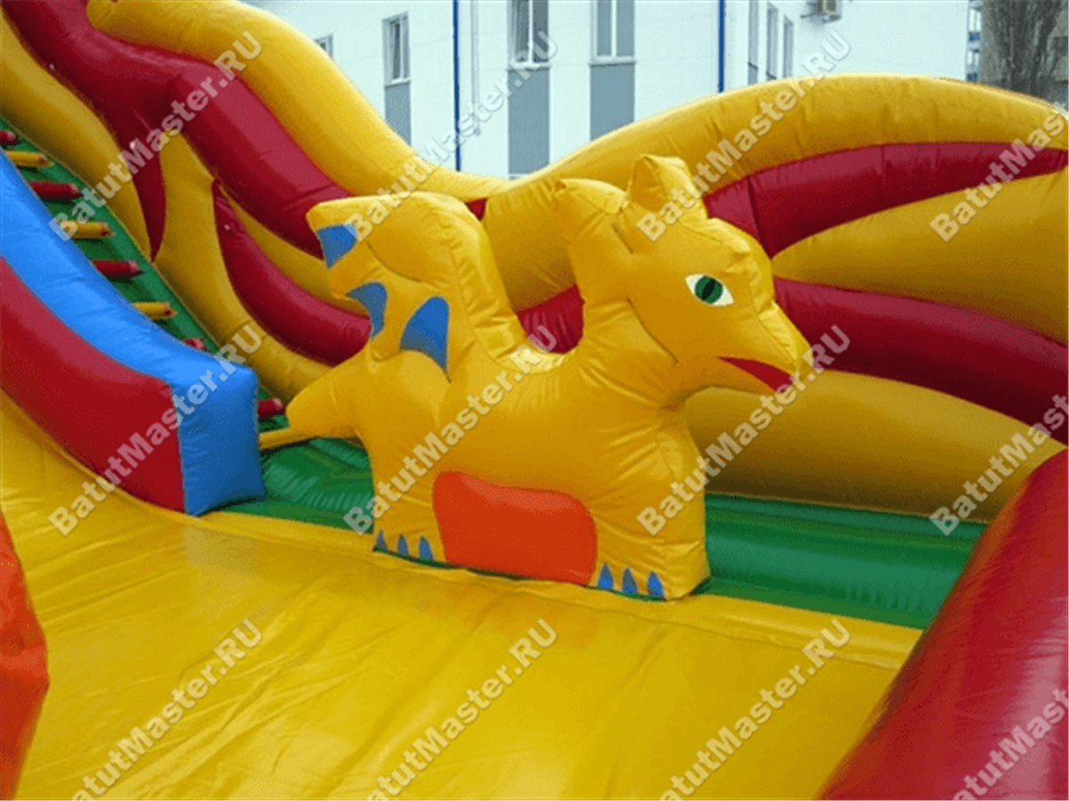 На входе детей встречает извилистый хвост дракона. Боковые стены, защищающие детей от выпадения на землю, представлены двумя головами змея, а третья размещается на самом верху стартовой площадки. И именно отсюда начинается основное тело чудовища – с центральной головы, дальше боковые головы расходятся влево и вправо и с середины надувное ограждение начинает представляться желто-красным пламенем из ПВХ.