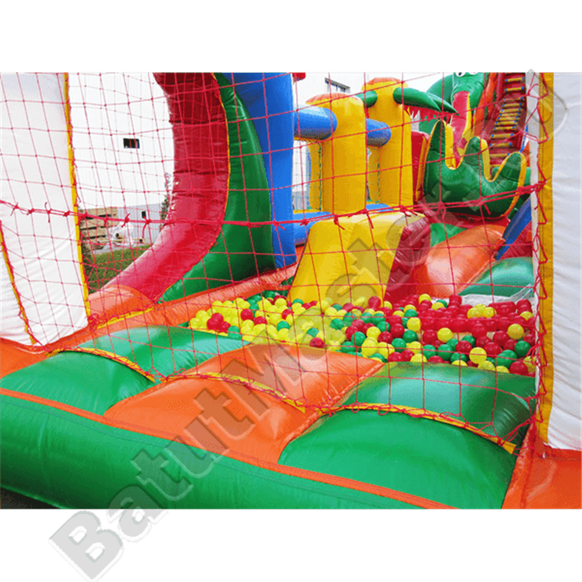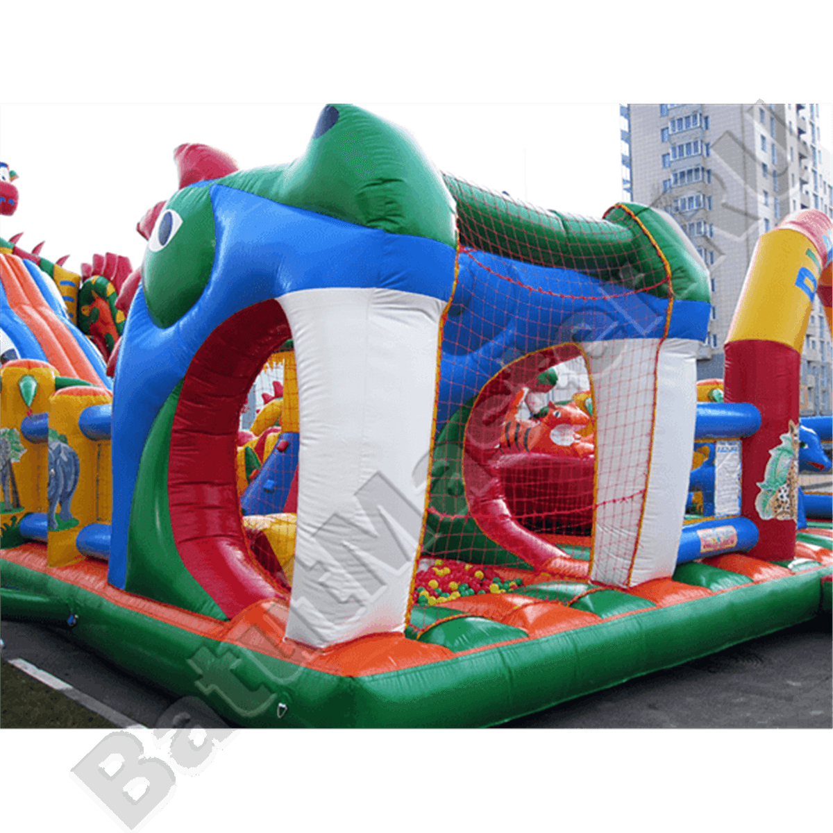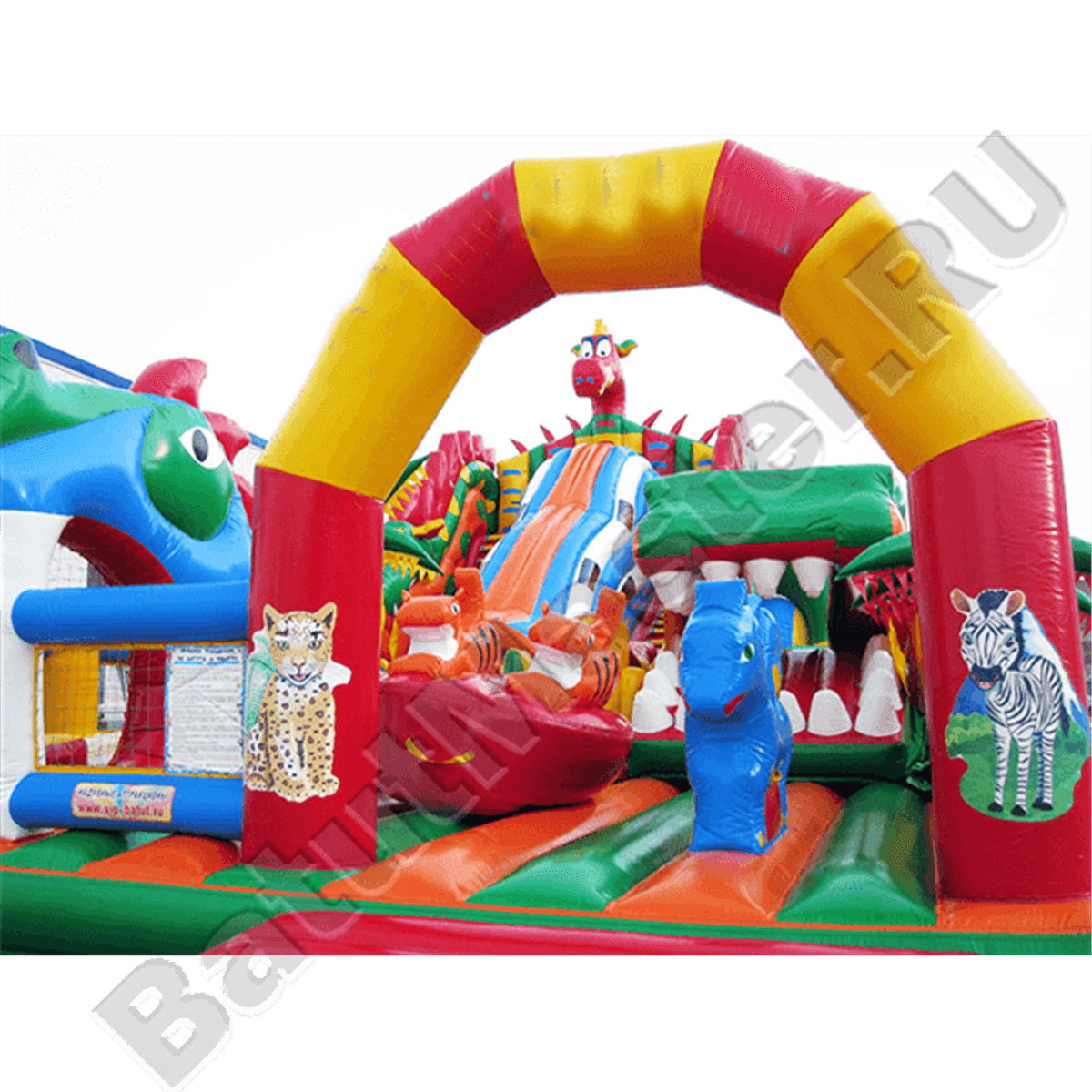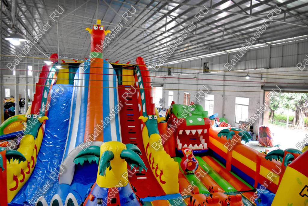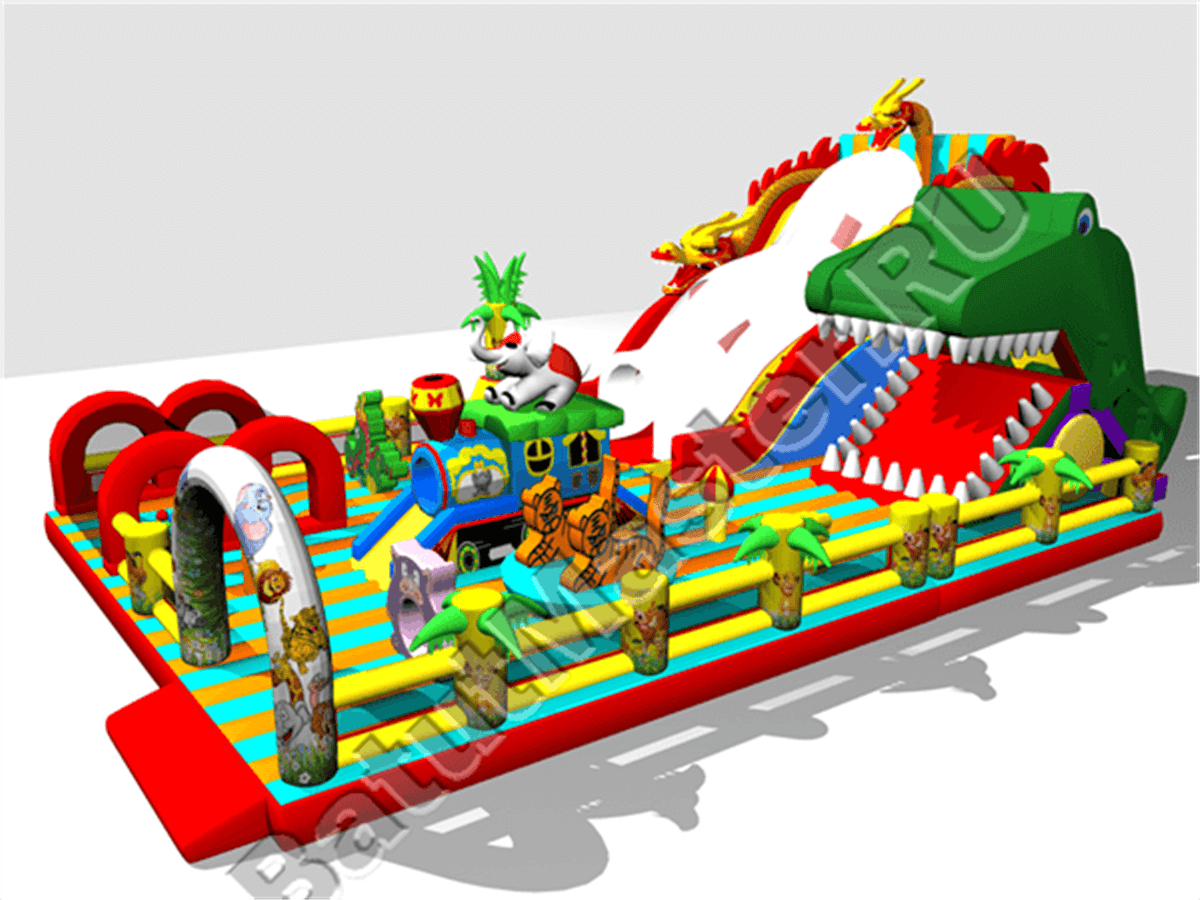 Коммерческий аттракцион многофункциональный, в нем помещается несколько игровых зон, но начинается батут с зоны сухого бассейна, которая находится слева от входа внутри клыков дракона, с уличной стороны эта часть ограждена сеткой. Основная центральная площадка интересна игровыми фигурами: здесь можно найти двух тигров, синих небольших драконов, скалодром в виде пальмы и т. д. Дальше расположилась зона высокой горки и начинается она с длинной лестницы, которая находится справа, слева пролегает обычный спуск и по центру – горка внутри длинного тоннеля. Такой тоннель отождествляет туловище дракона, так как голова чудовища находится прямо над ним. Левая площадка – увлекательная робот-пасть в виде зеленой головы змея с горкой, которая позволяет детям покинуть эту зону и спуститься вниз.