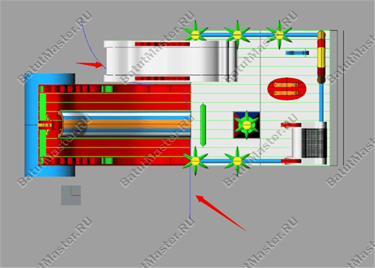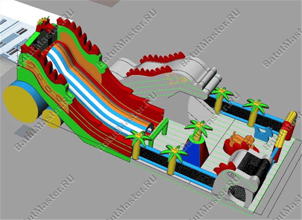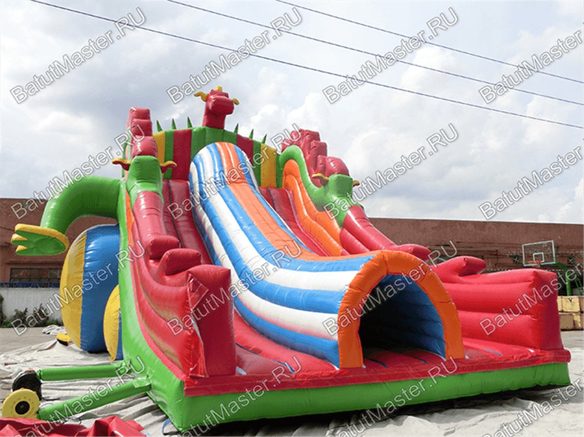 Надувной батут для бизнеса занимает площадку размерами 23 на 11 м. Самая высокая точка аттракциона находится на высоте 10 м, поэтому батут привлекает к себе внимание даже издалека. Расцветка площадки пестрая и яркая, так как структура конструкции состоит из множества элементов, изготовленных из контрастных и насыщенных цветов. Общая картина напоминает настоящего Змея Горыныча, которого все дети хорошо знают из русских народных сказок и по-доброму боятся.
