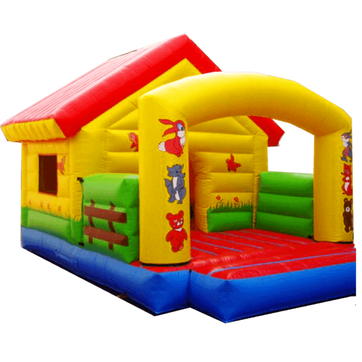 Часто детям не хватает лишь уюта в конструкции, поэтому этот аттракцион был сделан для того, чтобы малыши могли себя представить настоящими хозяевами своего дома и не только попрыгать, но и поиграть внутри крытого элемента. На самом входе установлена высокая желтая арка с изображением медвежонка, зайца и волка, поэтому дети могут предположить, что в моменты отдыха в теремке живут именно эти зверушки. Как только арка будет преодолена, перед детьми предстанет просторное место для прыжков и для бега с зеленым надувным ограждением в виде забора и красной нижней поверхностью. По боковым сторонам с внутренней и внешней части нанесены изображения травы, цветов и бабочек.