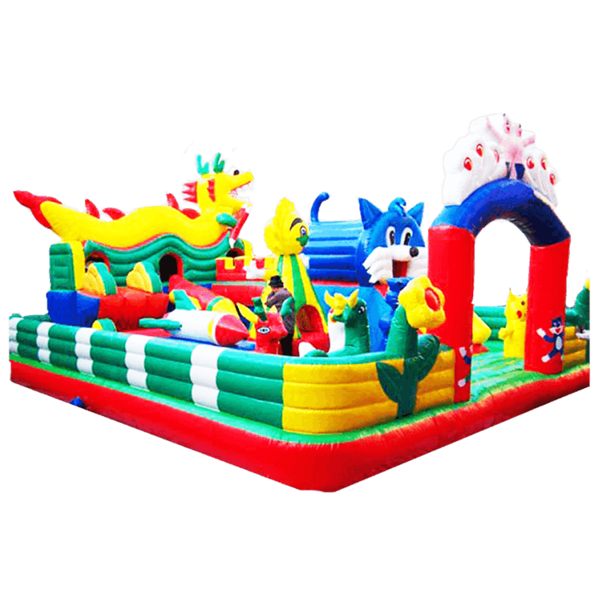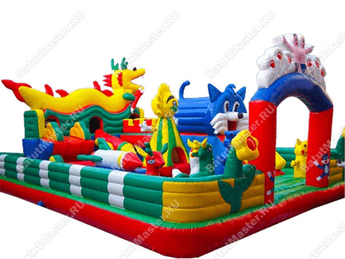 Сам детский батут основывается на красной мягкой подушке, окрашенной сверху зеленым. Боковые стены в большей части тоже зеленые, но с белыми вставками по всей длине и с желтыми полями на входе. Наибольшим развлечением станет горка, переходящая в туннель в виде синего кота и теремок, на котором расположился огнедышащий дракон.