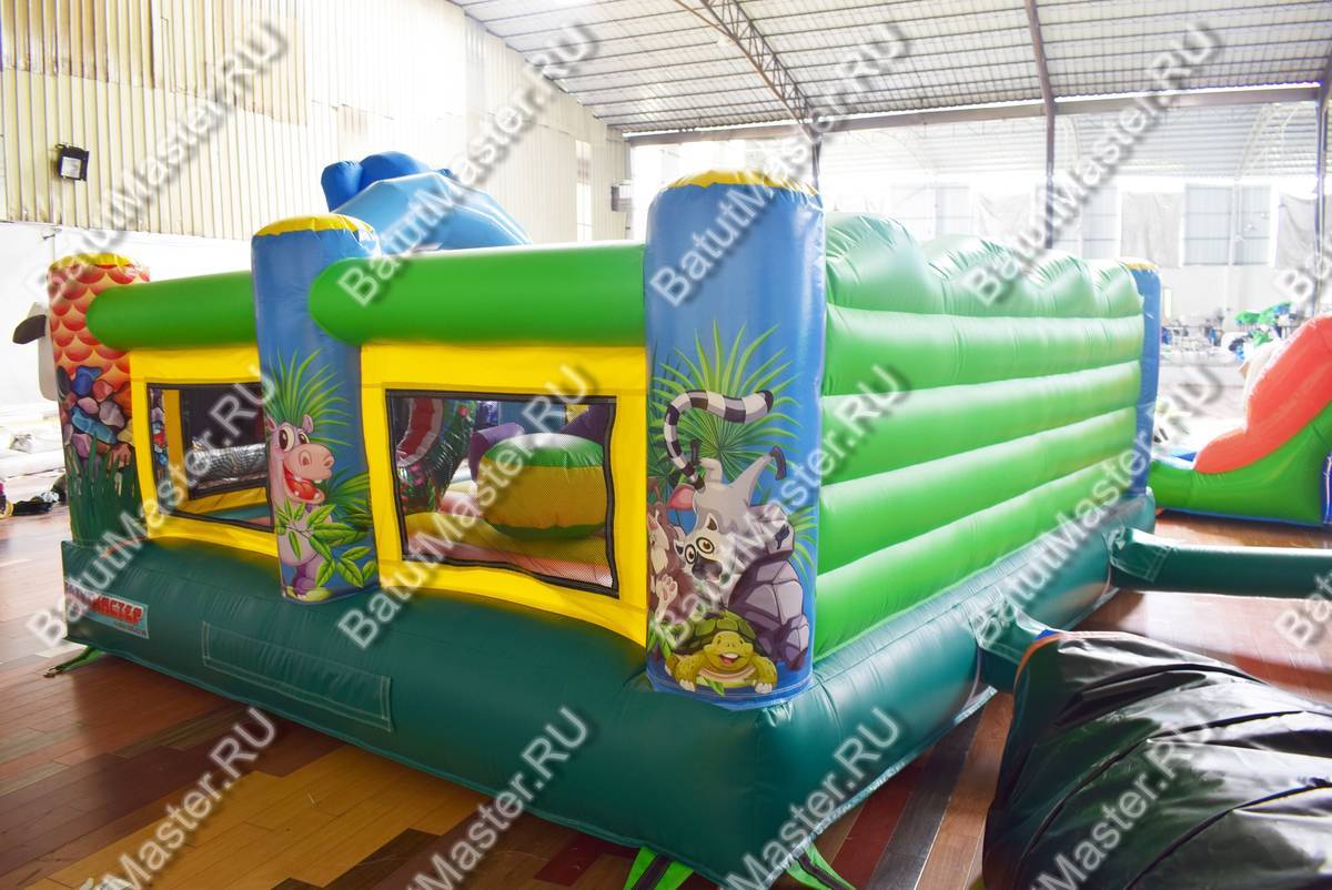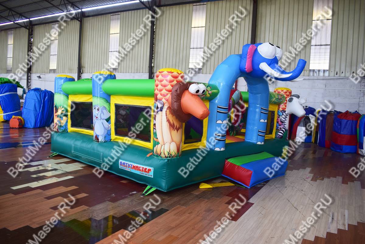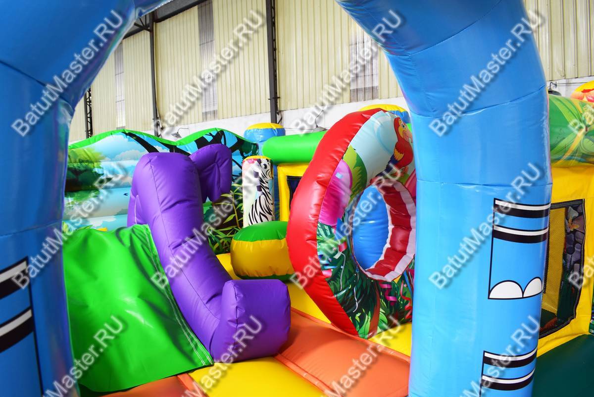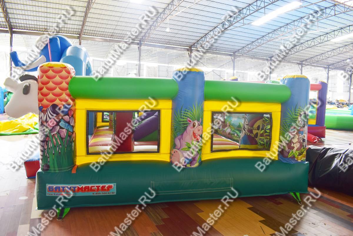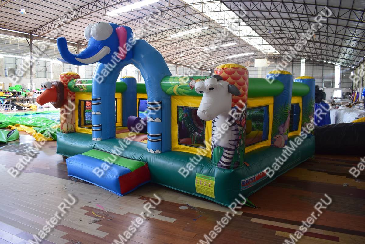 Яркие голубые или розовые колонны с изображением слоников, листьев или с большими головами голов, окружают весь батут. Каким бы не был изображенный слон, он всегда окажется любимым другом для самых крохотных малышей. Внутри размещается небольшая горка, она довольно низкая, поэтому проехаться на ней сможет любой и абсолютно самостоятельно. Горизонтальные надутые перекладины по периметру всего батута изображают заросли цветов, над горкой расположилась мягкая крона надувного дерева. Вход выполнен в виде арки и оснащен подушкой безопасности.