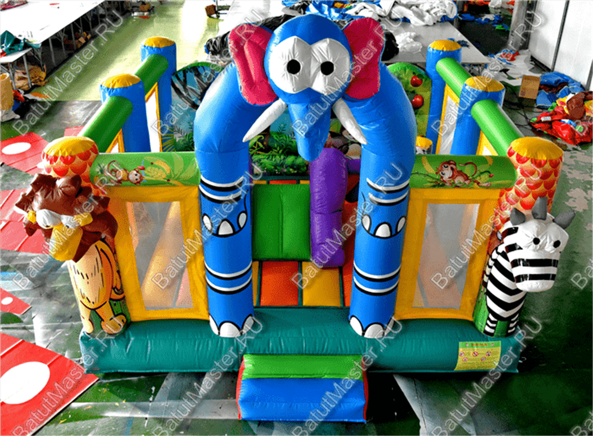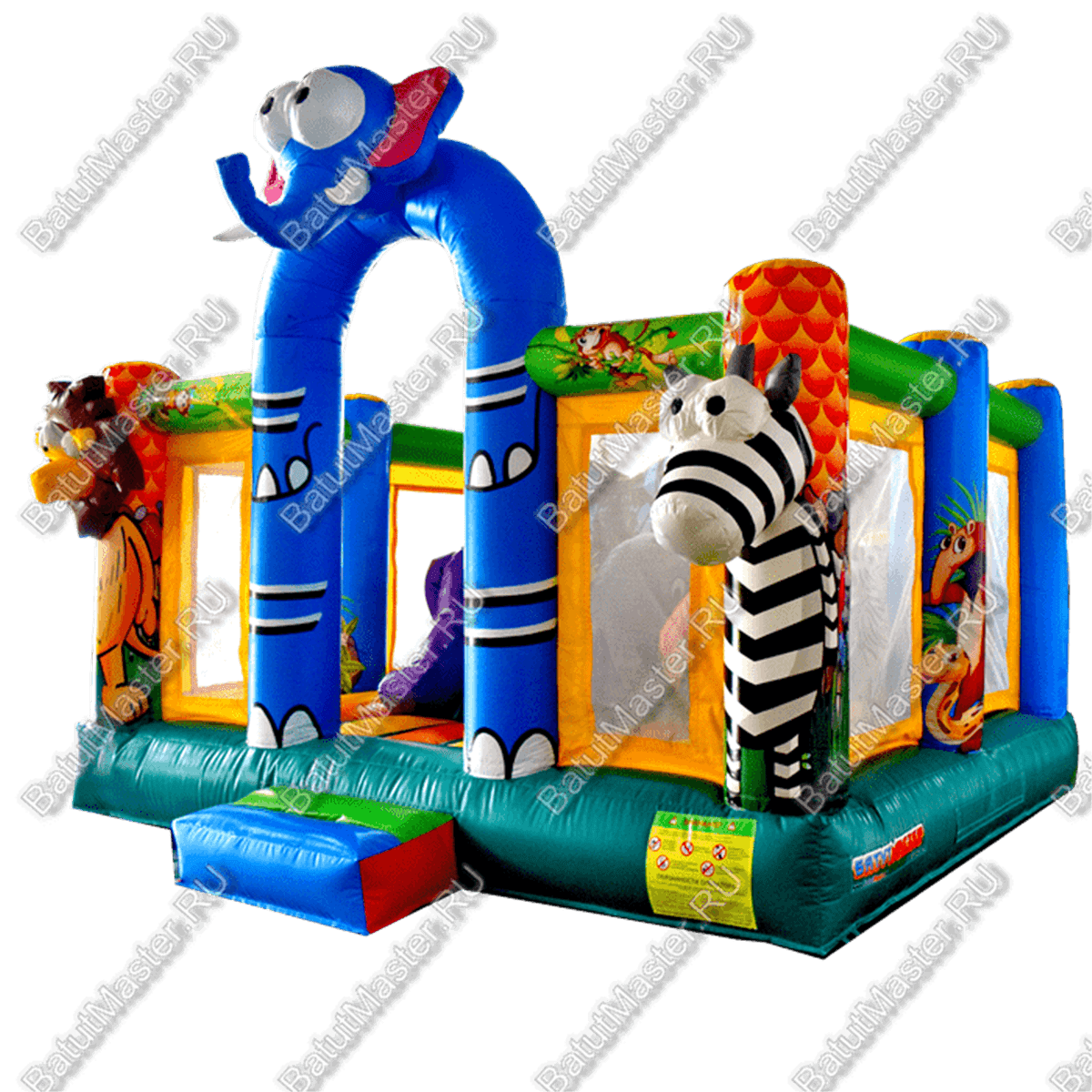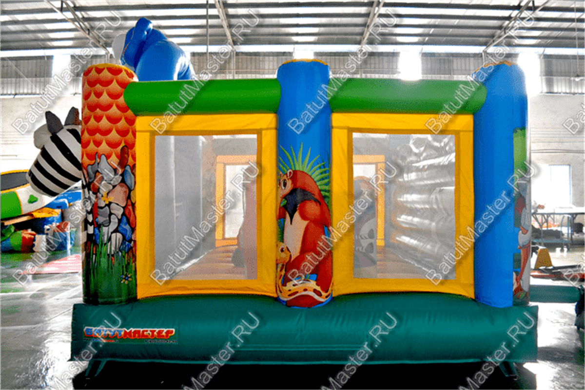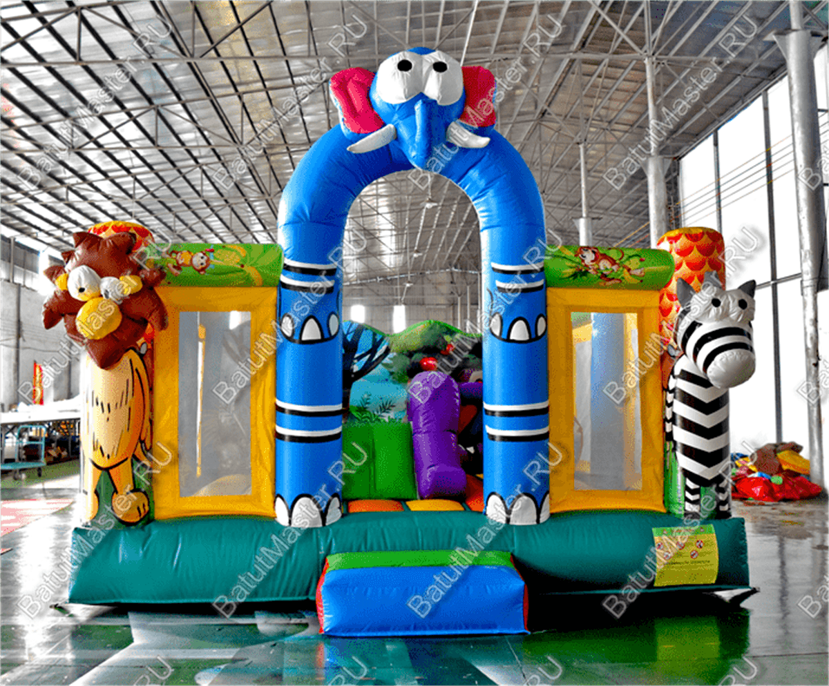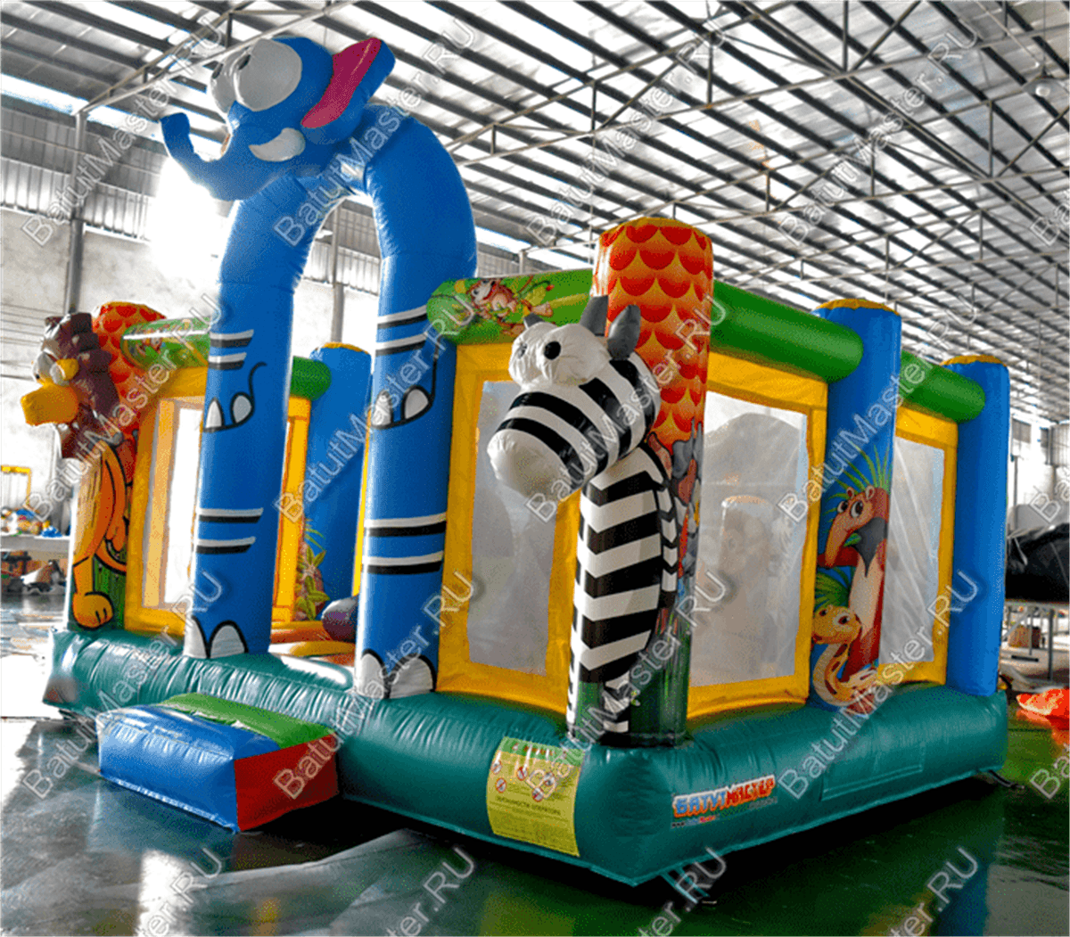 На входе ребят сразу встречают сразу несколько животных с большими глазами: синий слоник в виде арки с прорисованными лапами, лев и зебра. Узнаваемые забавные зверушки сразу же понравятся деткам. Пройдя внутрь, они могут увидеть перед собой небольшую горку, с которой можно покататься, красивые и красочные изображения на мягких стенах батута. Аттракцион предназначается для самых маленьких детишек.