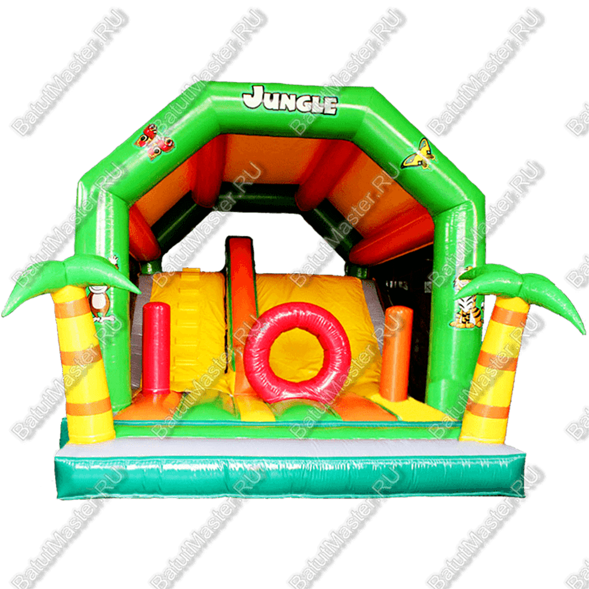Несмотря на маленький размер, данный игровой комплекс вмещает в себя несколько детей, где они смогут резвиться, прыгать и преодолевать препятствия. На входе встречает кольцо, через которое дети обязательно и не раз будут лазать. Вертикальные модули в виде столбцов, а дальше самое интересное – подъем по ступенькам и спуск. Все это развивает в детях силу и выносливость, а также способствует укреплению мышц. Две стоящие по бокам пальмы придают особую яркость и задают тематику лета. Яркий, надувной батут для бизнеса полностью мобилен. Его можно надувать и сдувать сколько угодно раз. Он выполнен из качественного ламинированного ПВХ. По бокам частично защищен сеткой, что предотвращает от травм и выпадения наружу. Также родителям будет удобно следить за детьми во время игр. Простой в эксплуатации и неприхотливый в уходе. Материал легко моется и не впитывает пыль. Прекрасный вариант для обустройства детской площадки на открытом воздухе или в помещении. Он ставится на любую ровную поверхность и даже на песок. В комплекте имеется все необходимое крепление и мощный насос. Дополнительно, по желанию клиента мы можем поставить пневмоподушки и укомплектовать модули. Есть возможность выбора цвета.