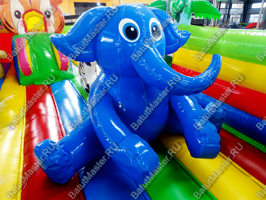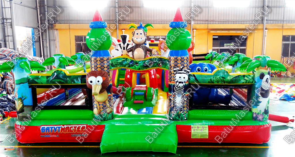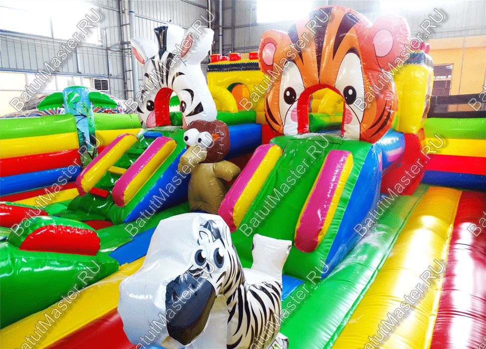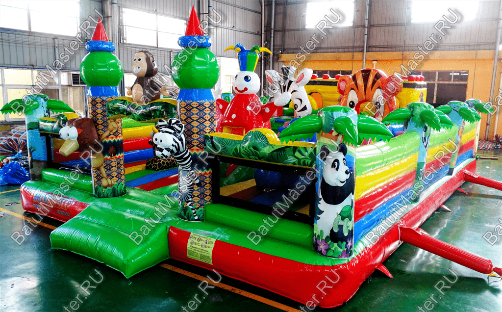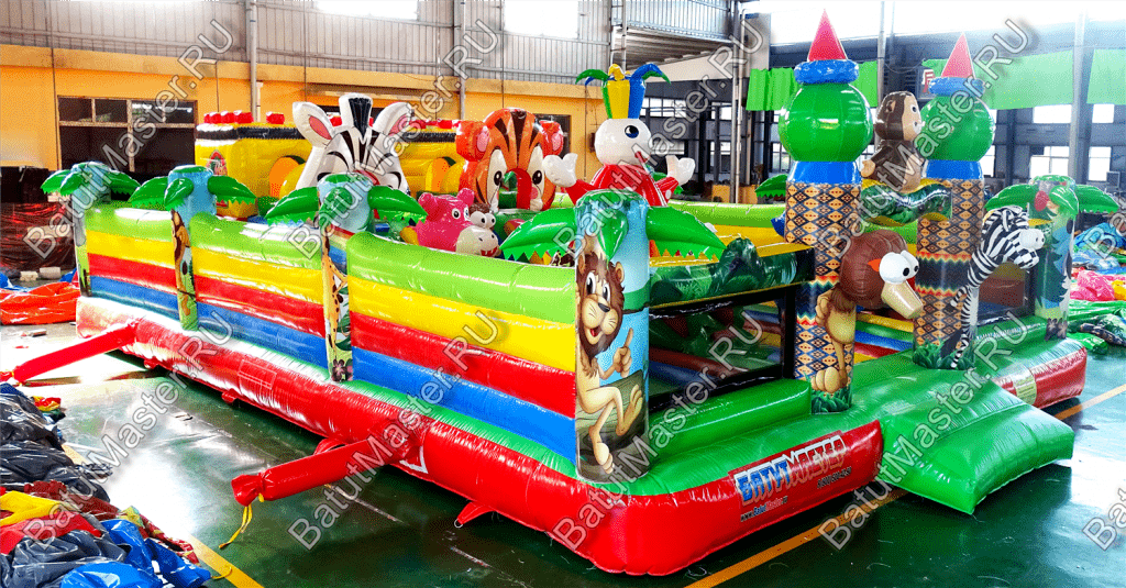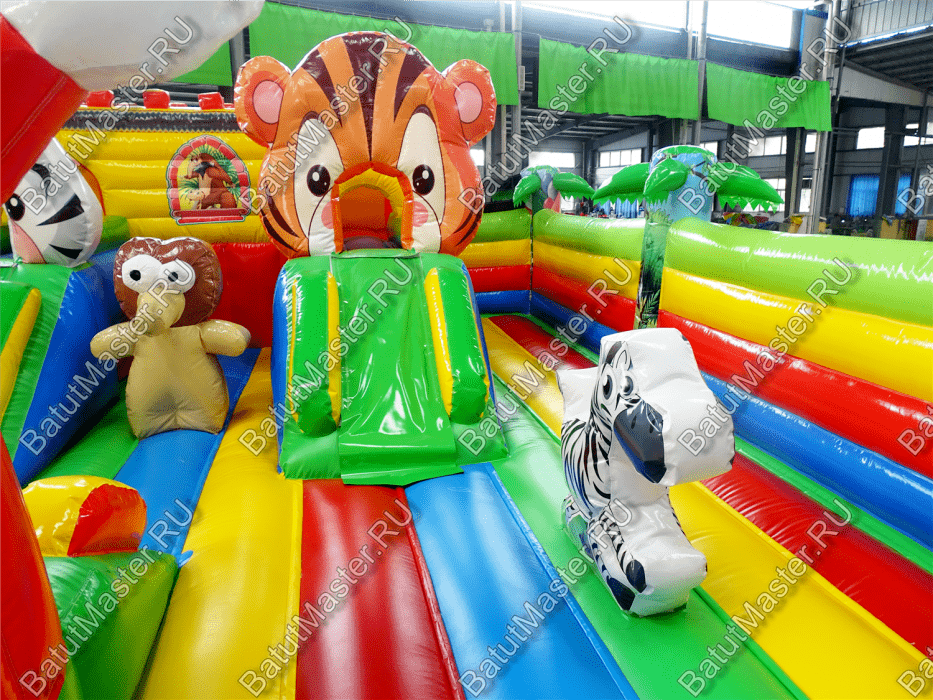 Внутри батута ребёнка ожидает огромный выбор развлечений. Тут есть множество игровых фигур в виде животных, с которыми можно поиграть, различные арки в виде звериных мордашек, а также подъёмы с лестницами и маленькими горками.