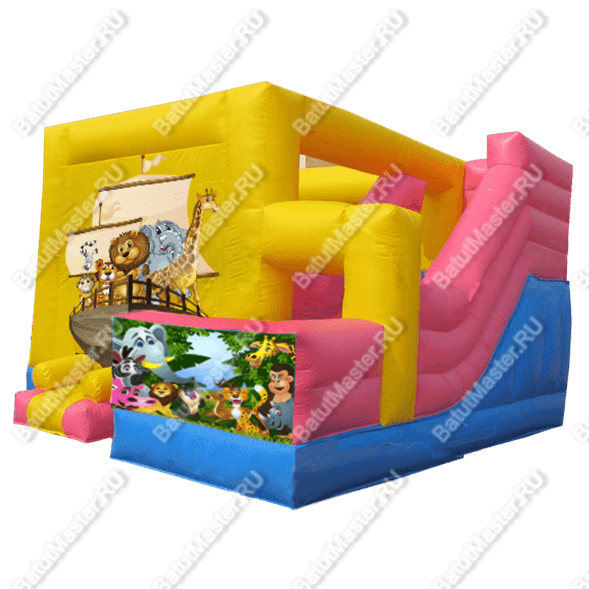 И хотя батут для бизнеса можно назвать однотонным, его центральные части украшают яркие изображения зверей, которые сначала дружно путешествуют на корабле, а потом уже оказываются внутри африканский прерий. Побывать в такой чудо-стране обязательно захочет каждый ребенок!