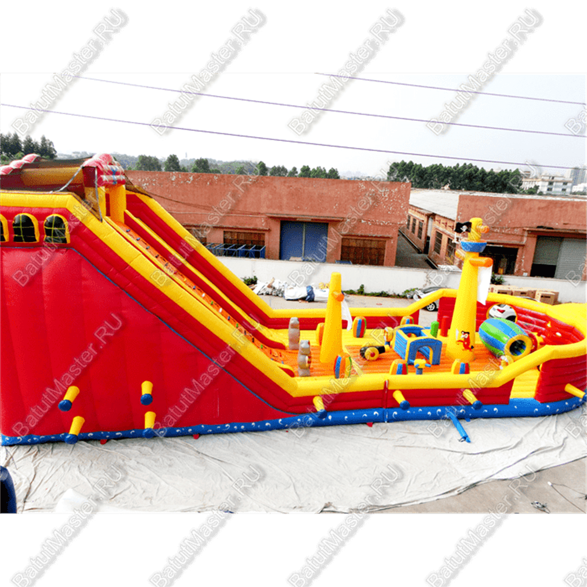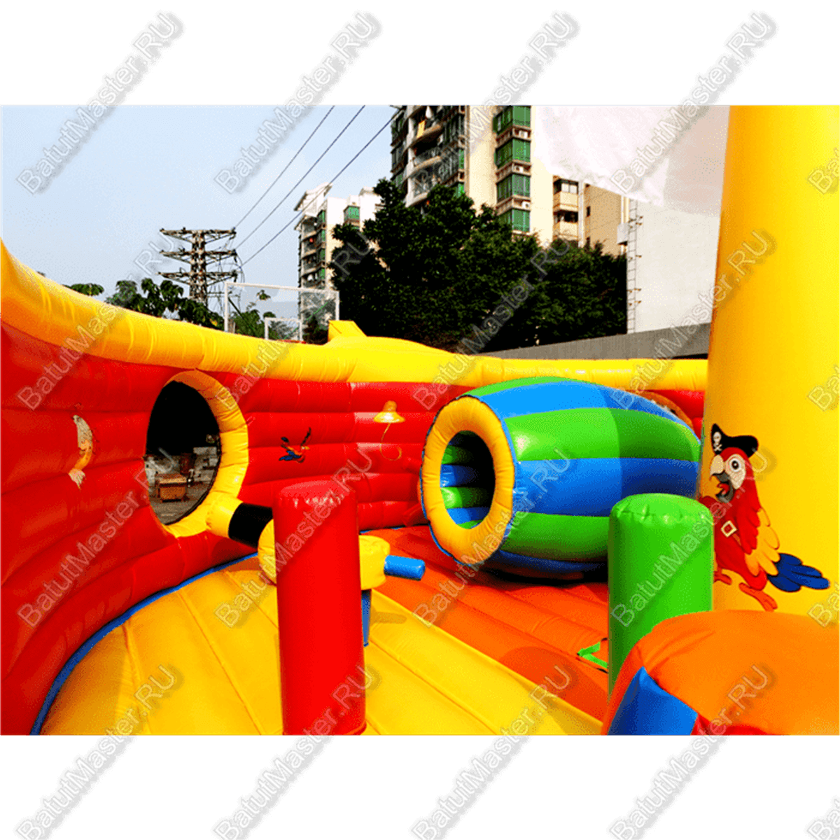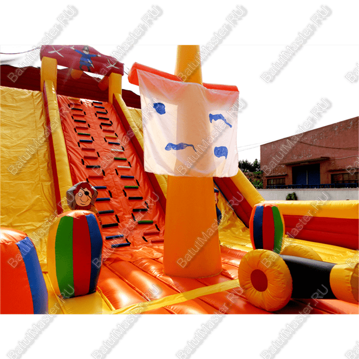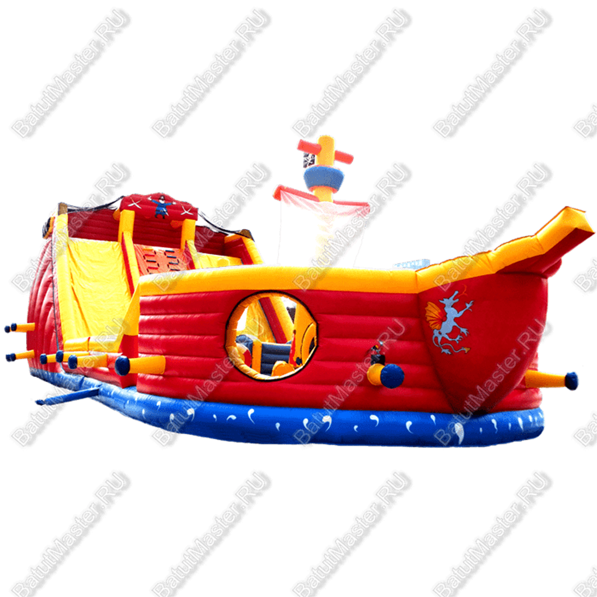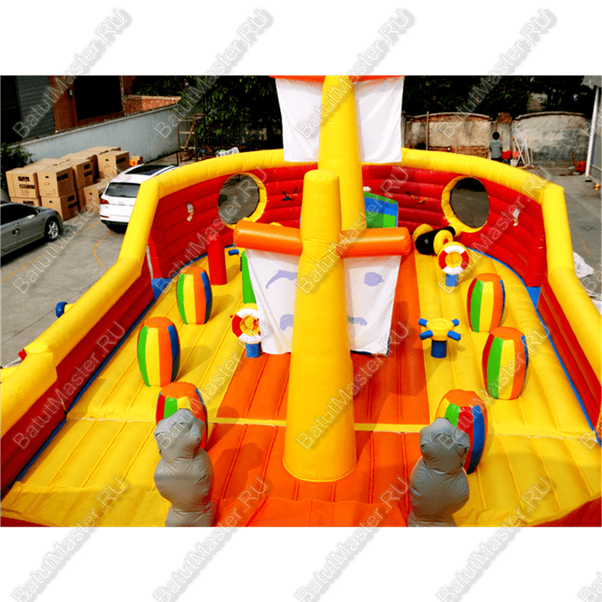 Надувной батут в виде корабля – это полноценная игровая арена для детей разных возрастных категорий. В нем имеются интересные локации и самые необычные игровые модули, благодаря которым аттракцион будет быстро наполняться, что приведет к желаемой прибыли. Вертикальные столбцы, тоннель, имитация пушки, две огромные горки и два ряда порожков для веселых игр всей командой. Он будет интересен мальчишкам и девчонкам.