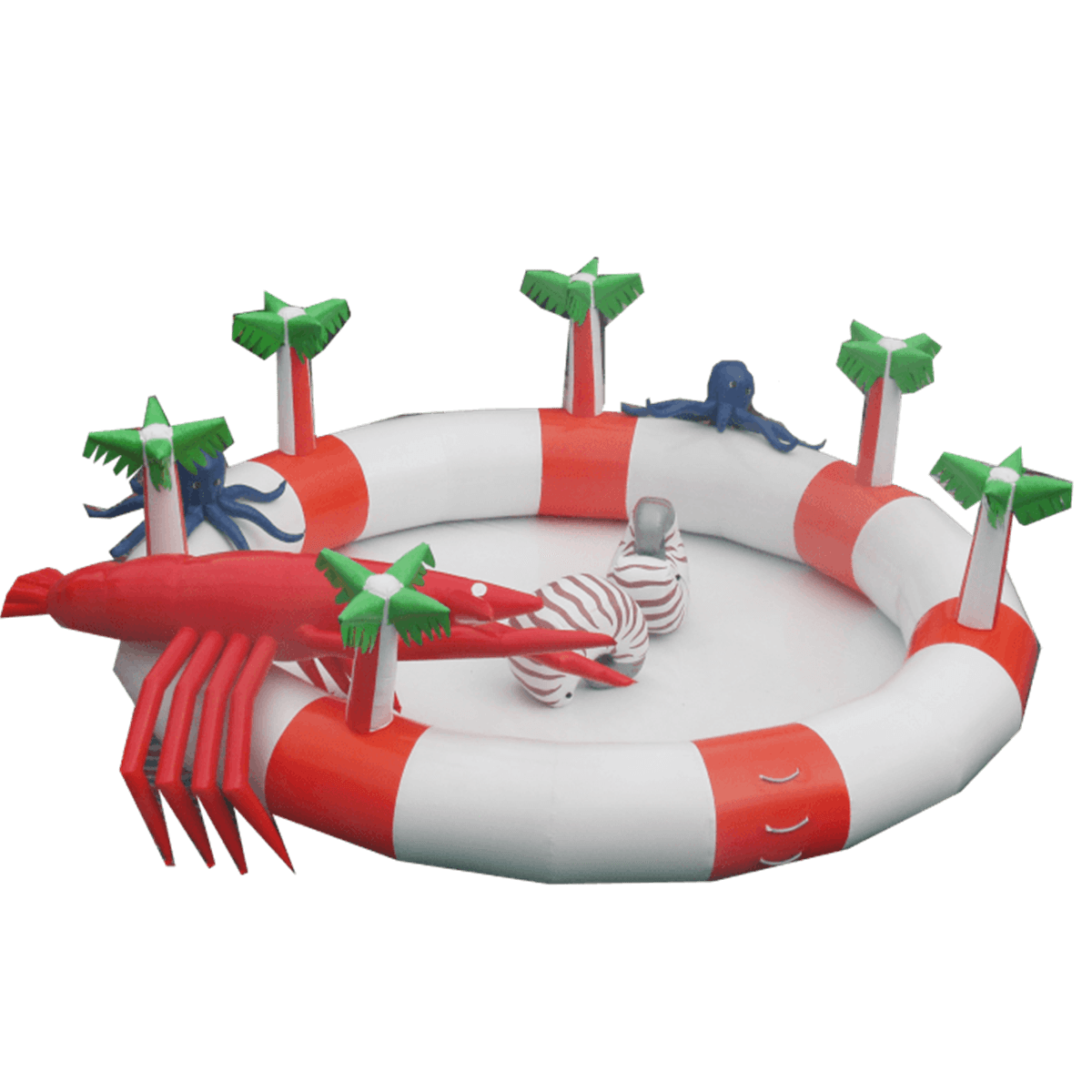 Надувной бассейн «Краб и осьминог» 5x5x1.5 — это не просто бассейн, а полноценная игровая зона, способная притягивать к себе взгляды детей и родителей! Стильный дизайн в морской тематике, красочный красный краб и синий осьминог, пальмы по периметру и яркие бело-красные борта создают уникальную атмосферу морского побережья прямо у вас на площадке.