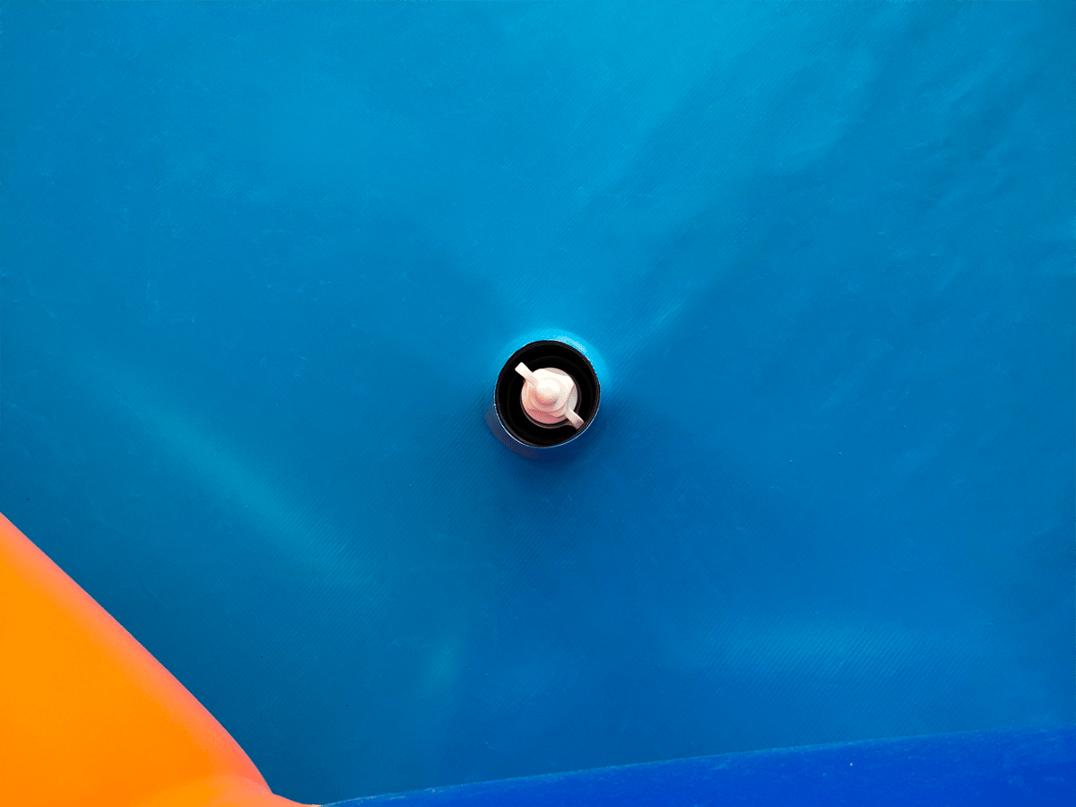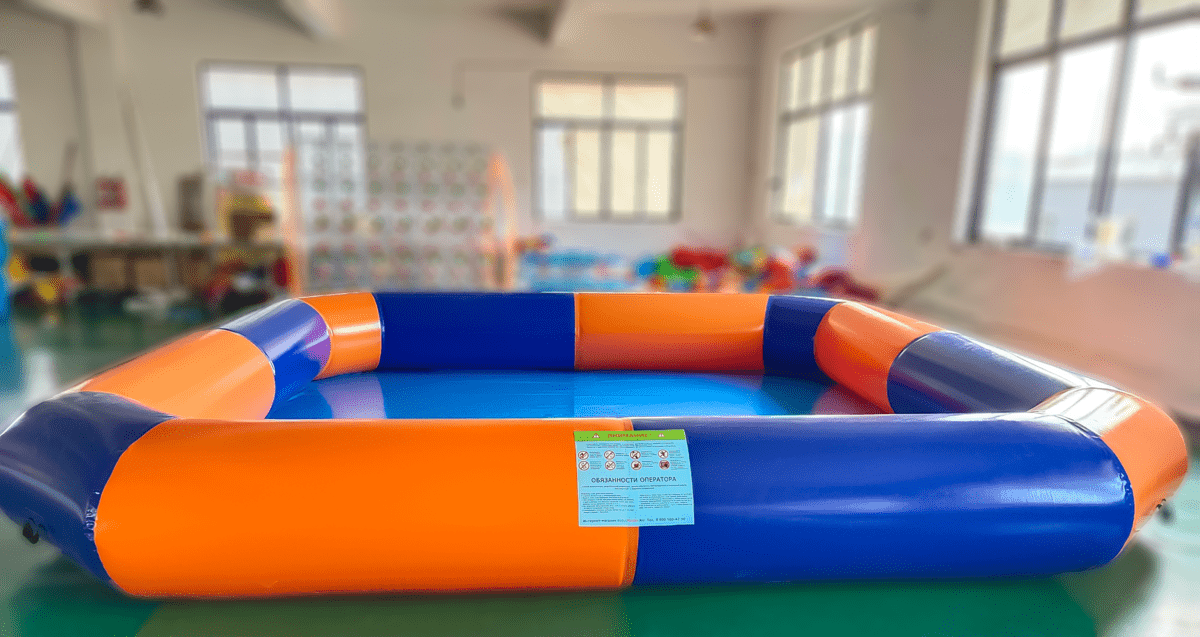 Бассейн выполнен из армированного ПВХ толщиной 0,9 мм — это один из самых прочных материалов в индустрии аттракционов. Он не подвержен разрывам, устойчив к УФ-излучению и сохраняет эластичность при температуре от -15 до +45 ºC. Швы сварены внахлёст на 2,5 см, что гарантирует герметичность и прочность конструкции при интенсивной нагрузке.