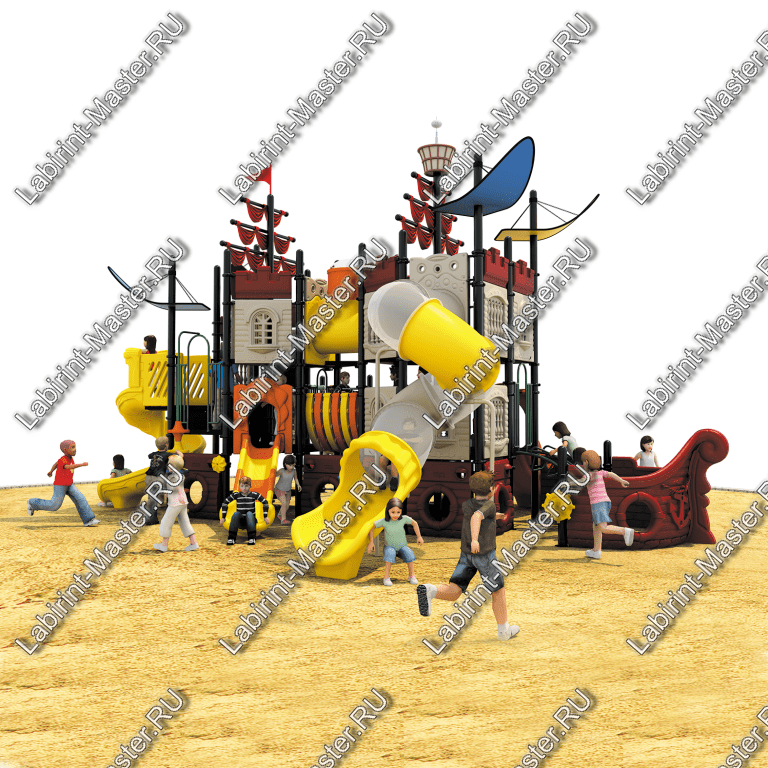 Площадка имеет габариты 7.6x6.4x5 м и представляет собой крупный игровой корабль, который сразу привлекает внимание детей своим ярким оформлением и продуманными деталями. В дизайне использованы оттенки жёлтого, бежевого, коричневого и чёрного цветов, создающие гармоничную и визуально приятную композицию. Тематика морского корабля пробуждает у детей воображение, способствует развитию ролевых игр и взаимодействию в коллективе.