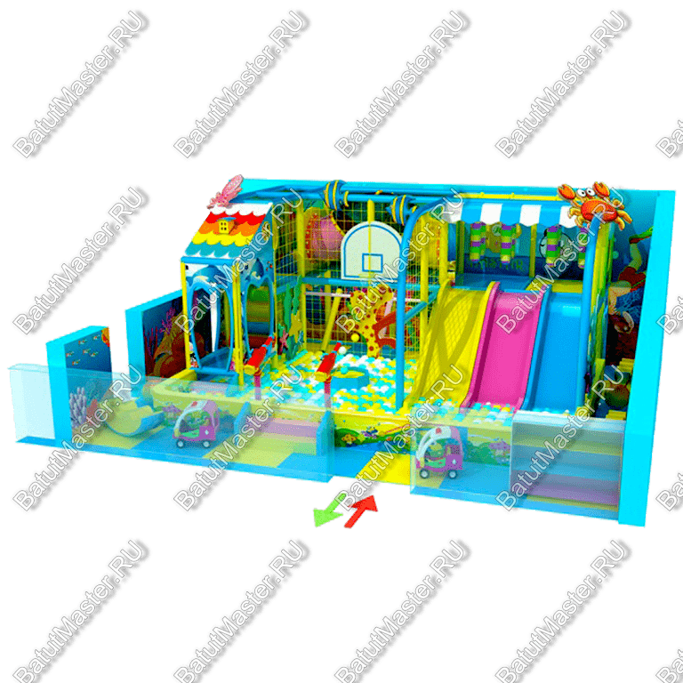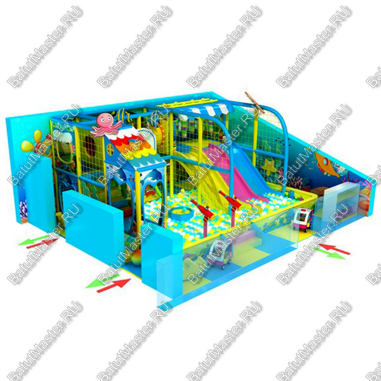 Тематика лабиринта – подводный мир, что делает его особенно привлекательным для детей. Яркие элементы, изображения рыбок и морских обитателей создают атмосферу подводного приключения. В лабиринте есть горки, тоннели, подвесные груши, пневматические пушки, что делает его еще интереснее.